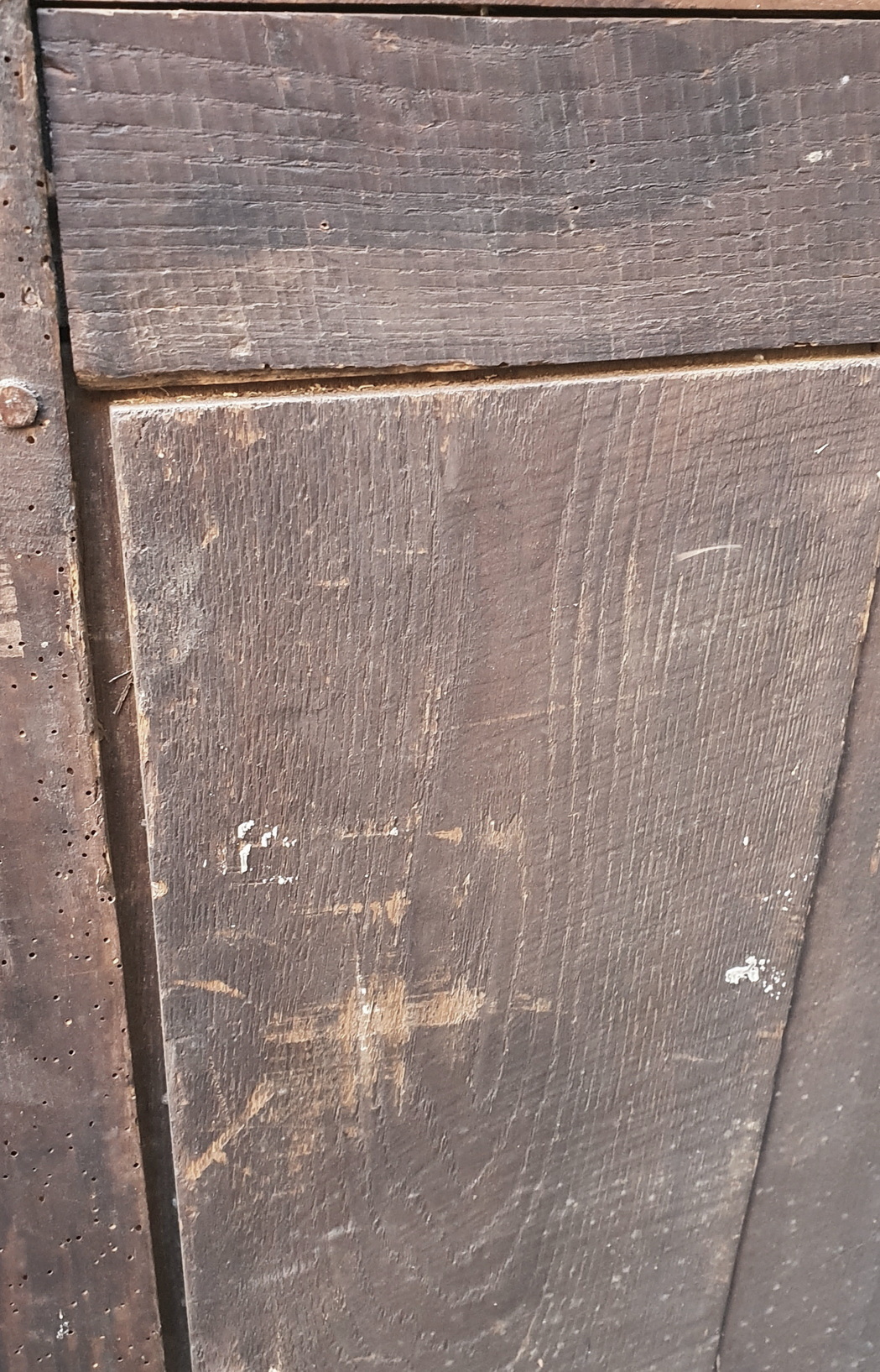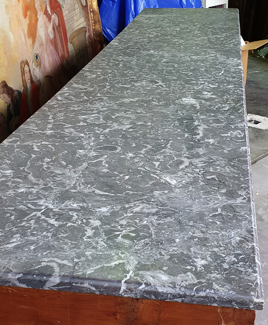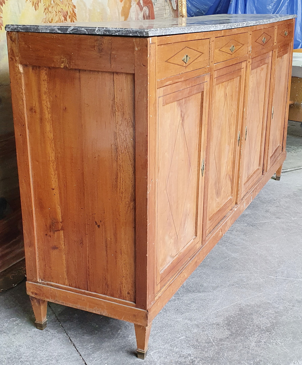 An early 19th century French Directoire period solid cherrywood four door, four drawer Buffet d'Enfilade, decorated with finely inlaid ebony stringing in geometric patterns, retaining its original, moulded-edge gery and white veined Breche marble top. Standing on tapering, square section legs with gilt brass finials. The solid timbers are well-burnished and retain a wonderful, pale patina. The rear showing the early construction bow-saw marks. Area of Isle de France (Greater Paris) circa 1810.