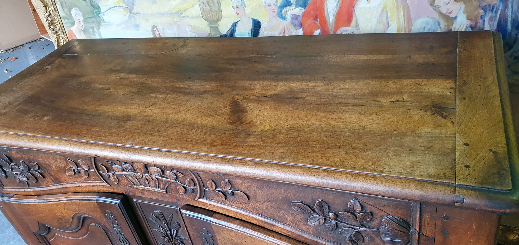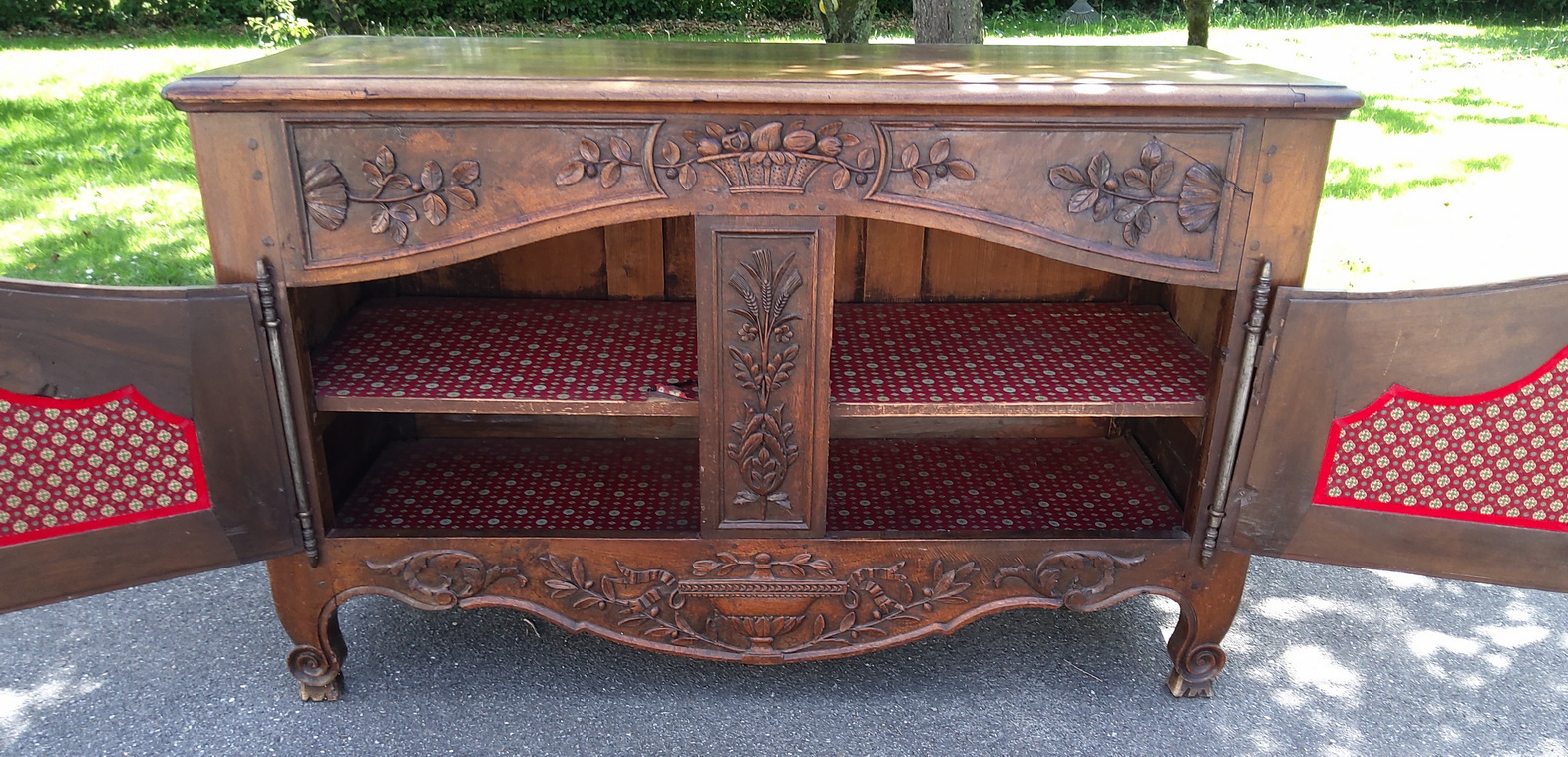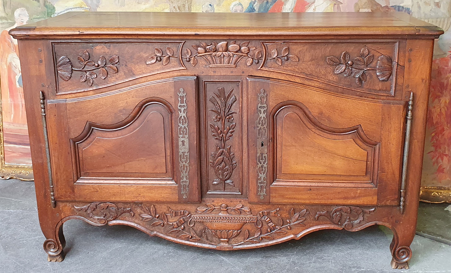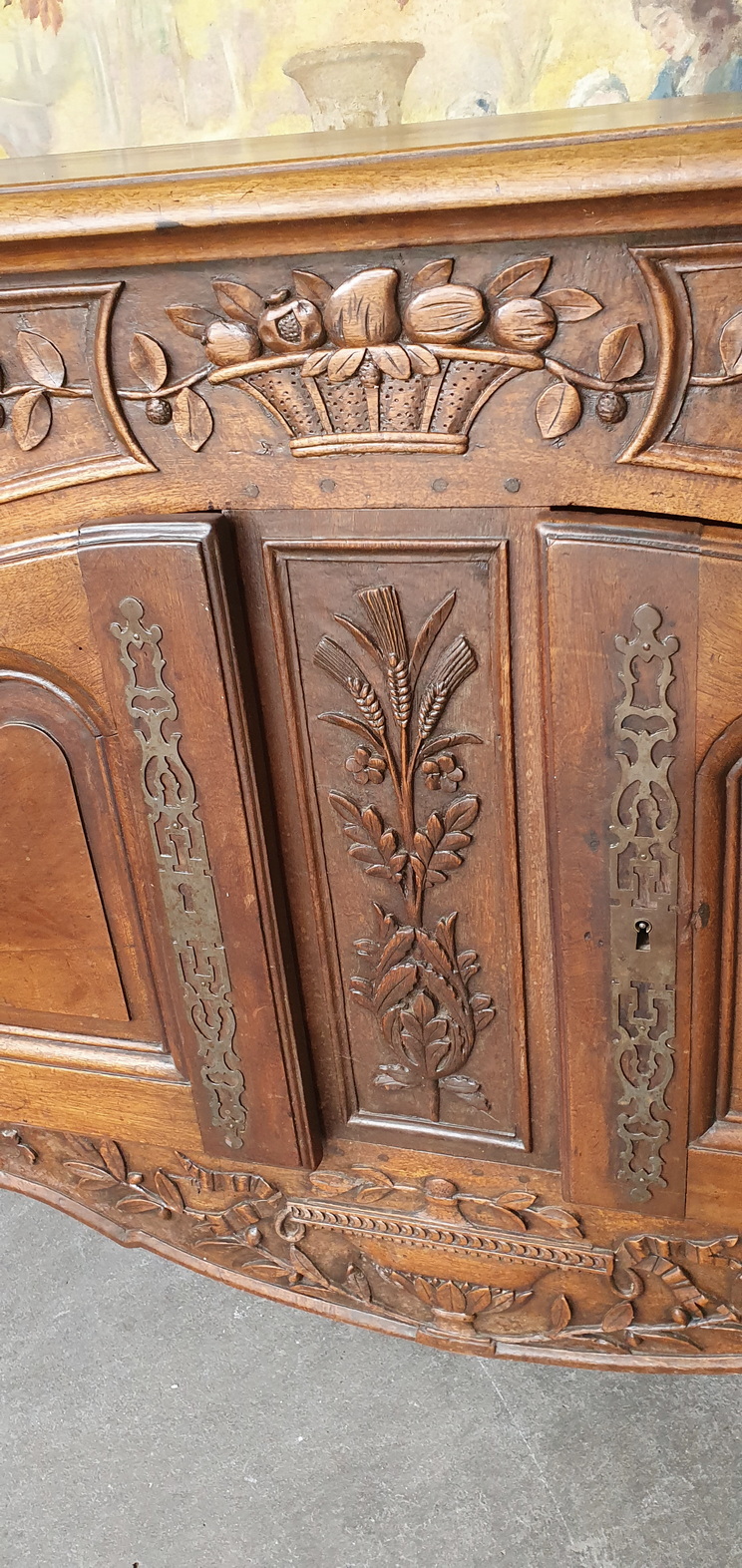 A mid 18th century French Provincial, Louis XV period haut and bas-relief carved, solid walnut Provencale Buffet of very good proportions, the front fitted with two shaped doors and decorated with a central urn and with a 'basket of abundance', flanked by whimsical trellises of flowers and stylised foliate and floral motifs. Area of Provence, circa 1750.