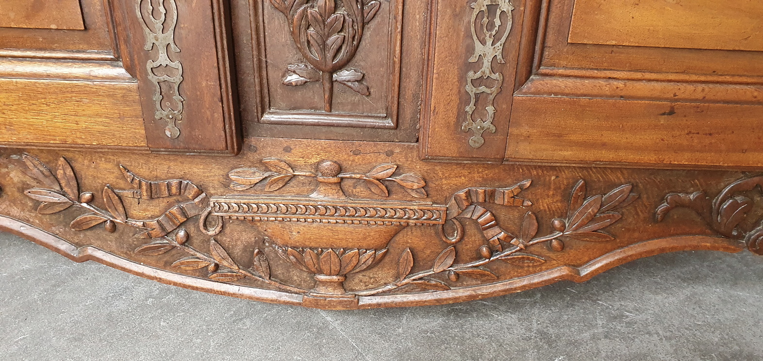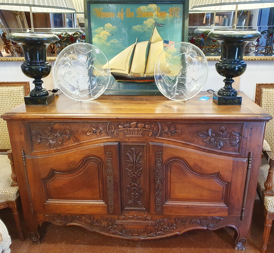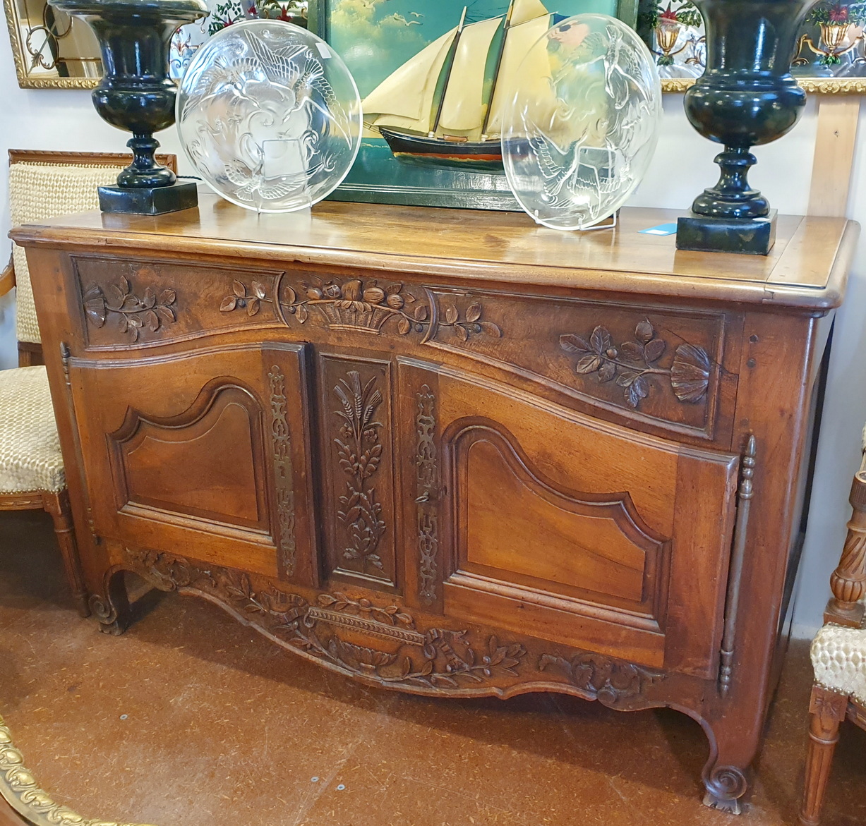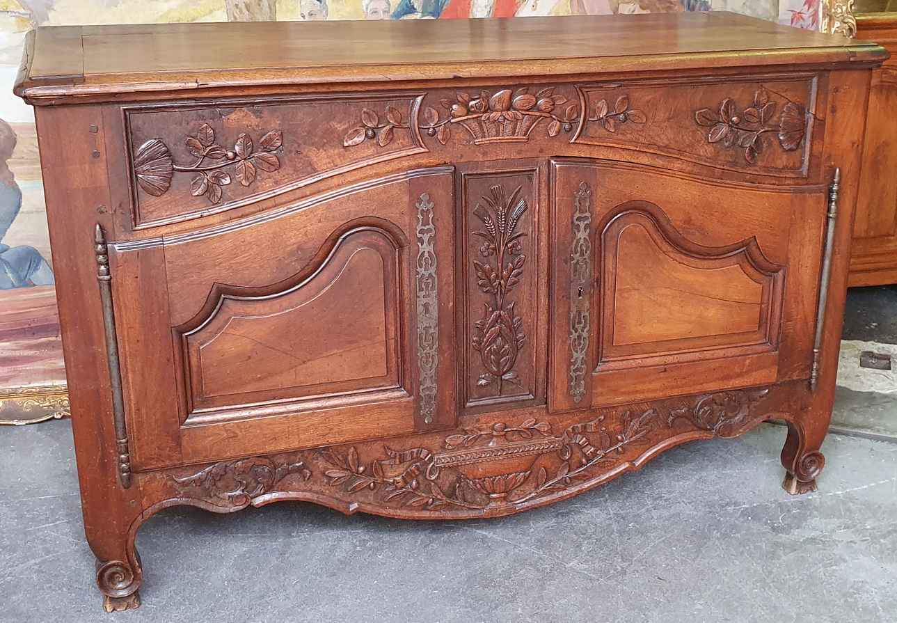 A mid 18th century French Provincial, Louis XV period haut and bas-relief carved, solid walnut Provencale Buffet of very good proportions, the front fitted with two shaped doors and decorated with a central urn and with a 'basket of abundance', flanked by whimsical trellises of flowers and stylised foliate and floral motifs. Area of Provence, circa 1750.