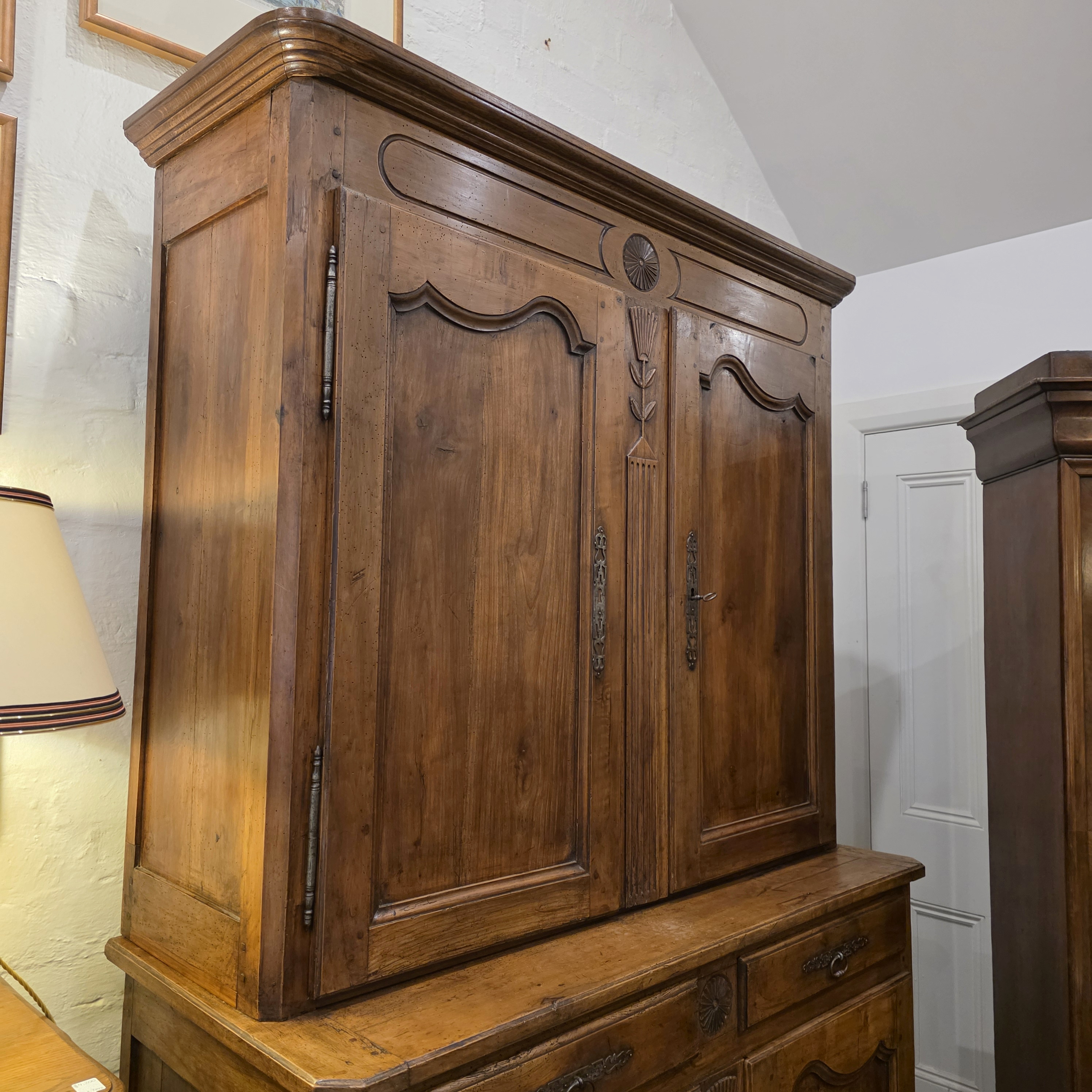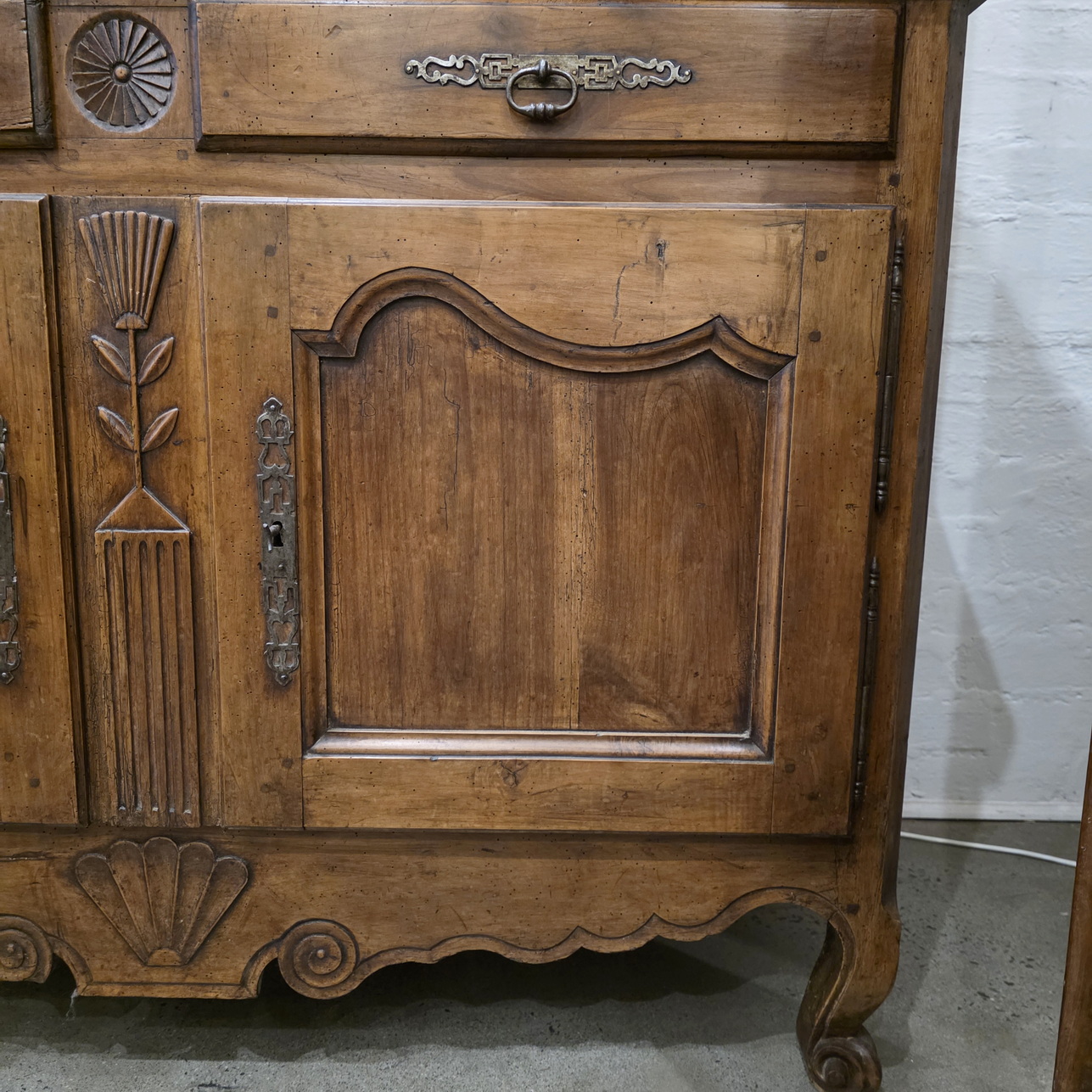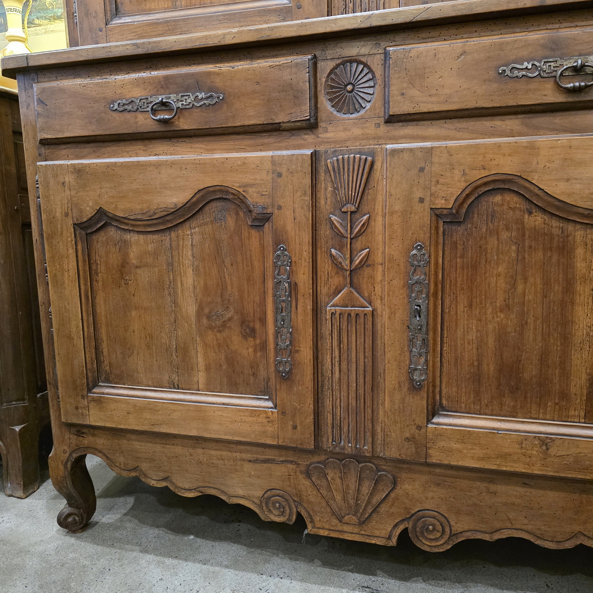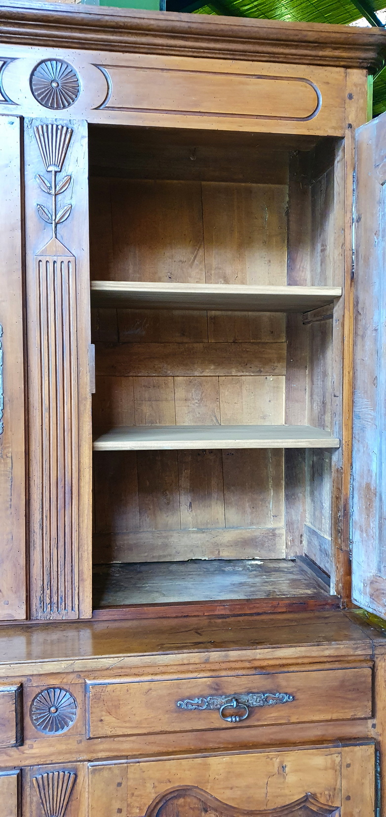 An early 19th century French Louis XV style solid walnut 'Buffet Deux-Corps' of fine quality and of Classic proportions, decorated with haut relief carved 'rosettes', stylised wheat sheaf and with fan patterns. Retaining the original and bronze-like walnut patination. Please note the harmonious proportions of this piece. The four doors open up completely, including the central door-transoms, making this piece possibly suited as a TV/ cabinet or a bar cabinet. Area of the Loire Valley, circa 1800.