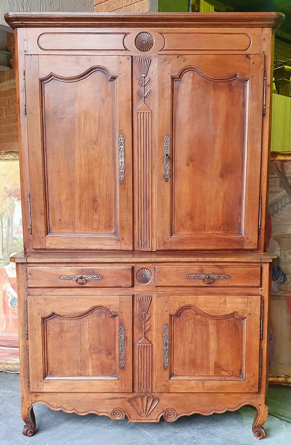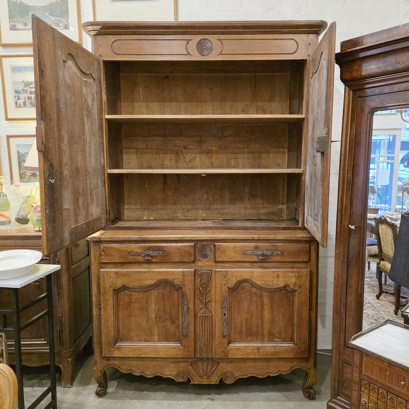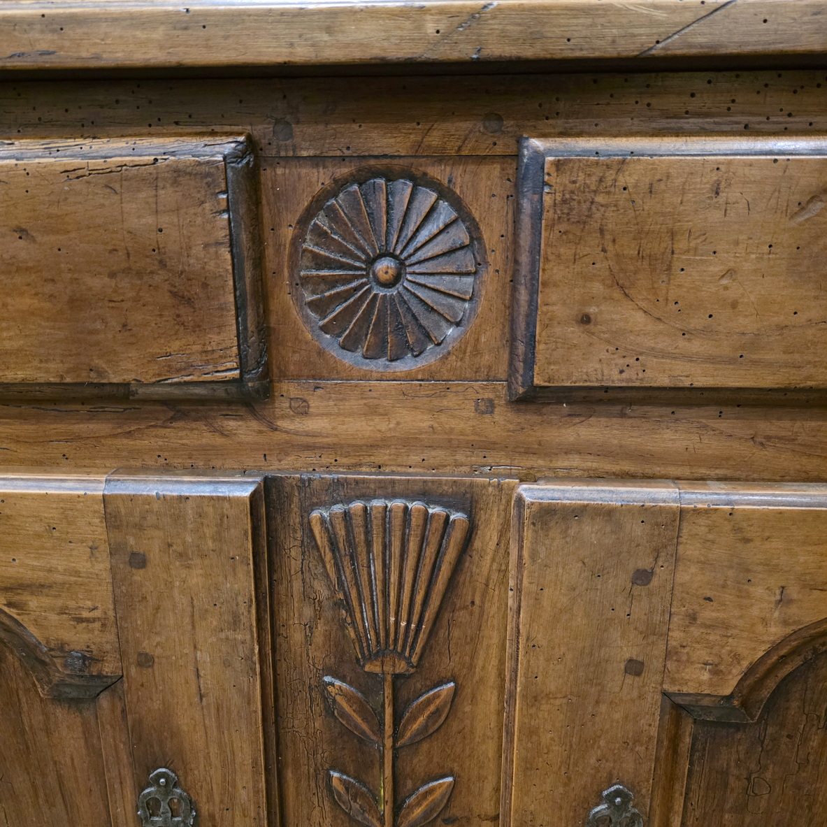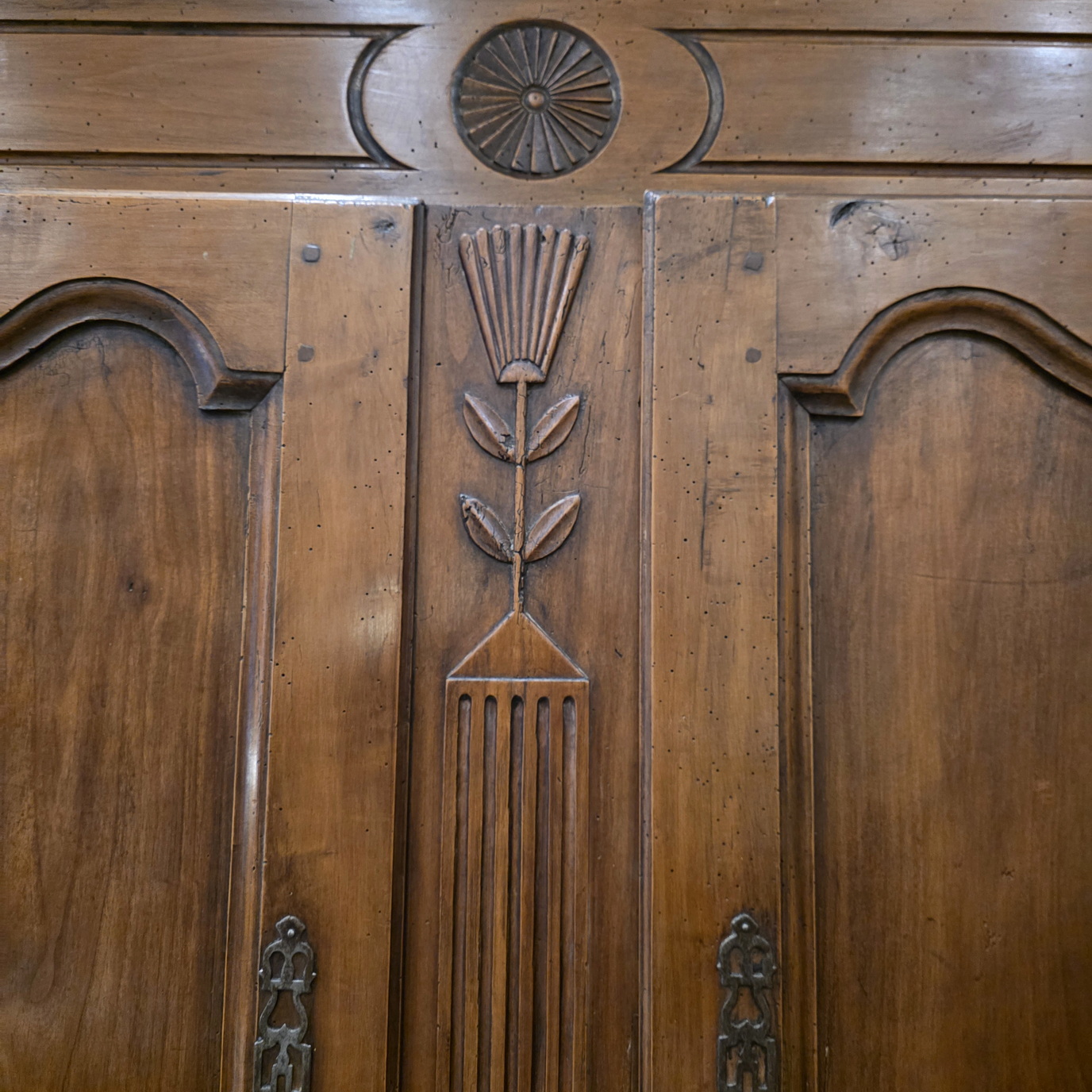 An early 19th century French Louis XV style solid walnut 'Buffet Deux-Corps' of fine quality and of Classic proportions, decorated with haut relief carved 'rosettes', stylised wheat sheaf and with fan patterns. Retaining the original and bronze-like walnut patination. Please note the harmonious proportions of this piece. The four doors open up completely, including the central door-transoms, making this piece possibly suited as a TV/ cabinet or a bar cabinet. Area of the Loire Valley, circa 1800.
