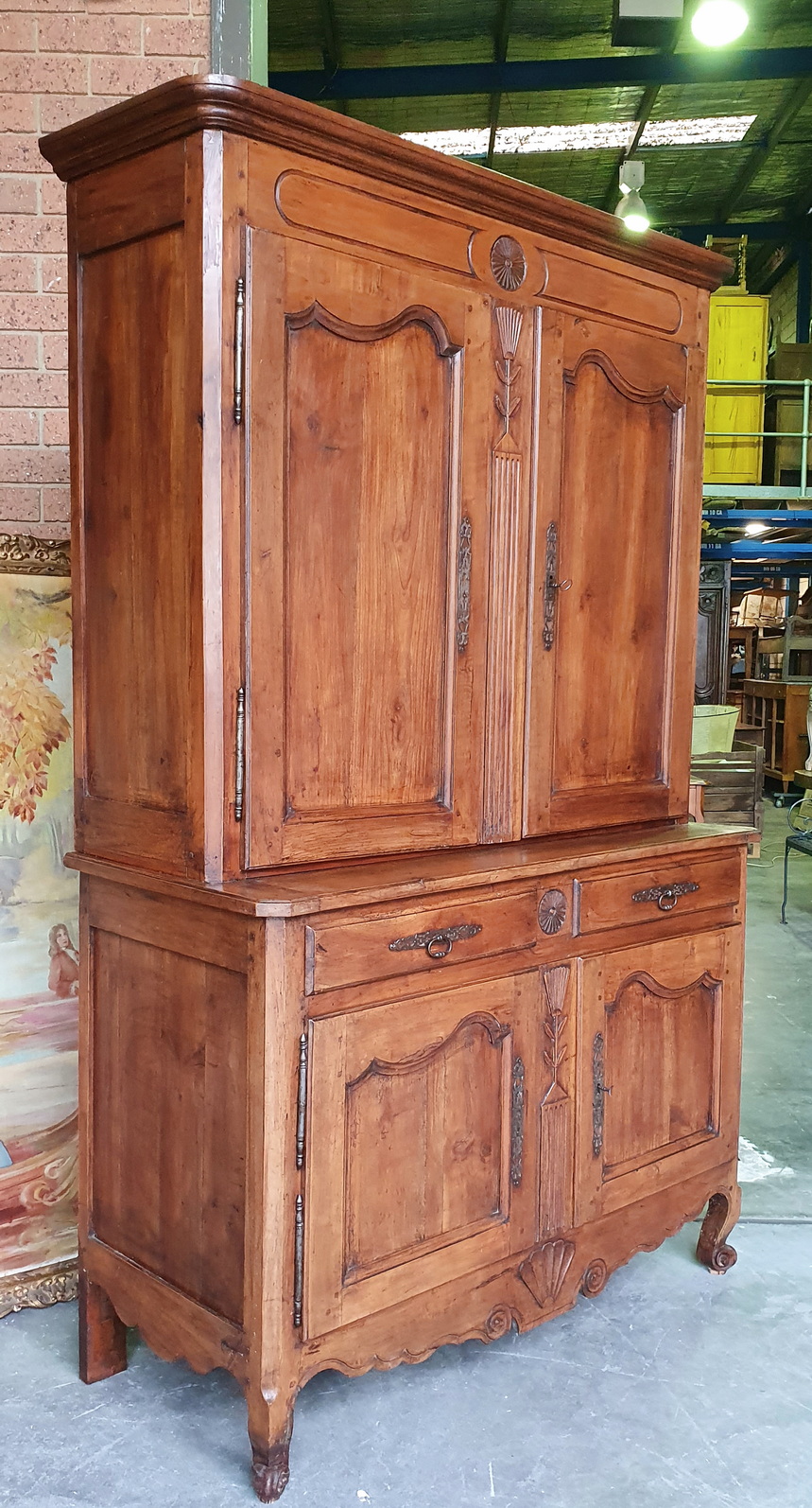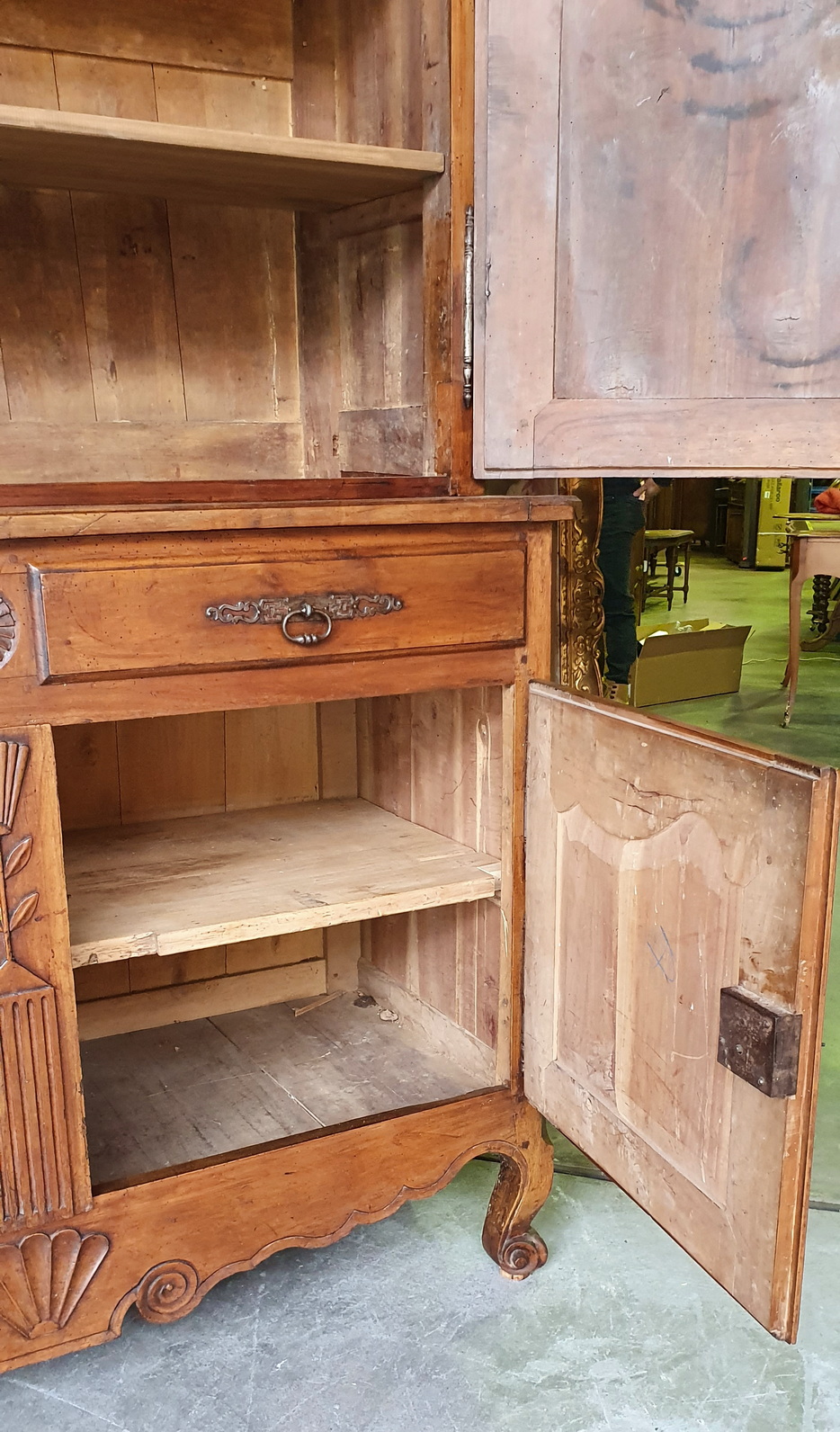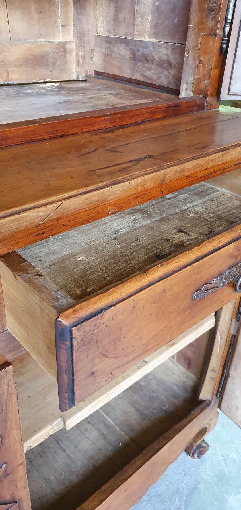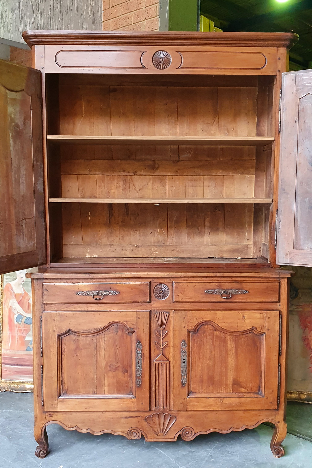 An early 19th century French Louis XV style solid walnut 'Buffet Deux-Corps' of fine quality and of Classic proportions, decorated with haut relief carved 'rosettes', stylised wheat sheaf and with fan patterns. Retaining the original and bronze-like walnut patination. Please note the harmonious proportions of this piece. The four doors open up completely, including the central door-transoms, making this piece possibly suited as a TV/ cabinet or a bar cabinet. Area of the Loire Valley, circa 1800.