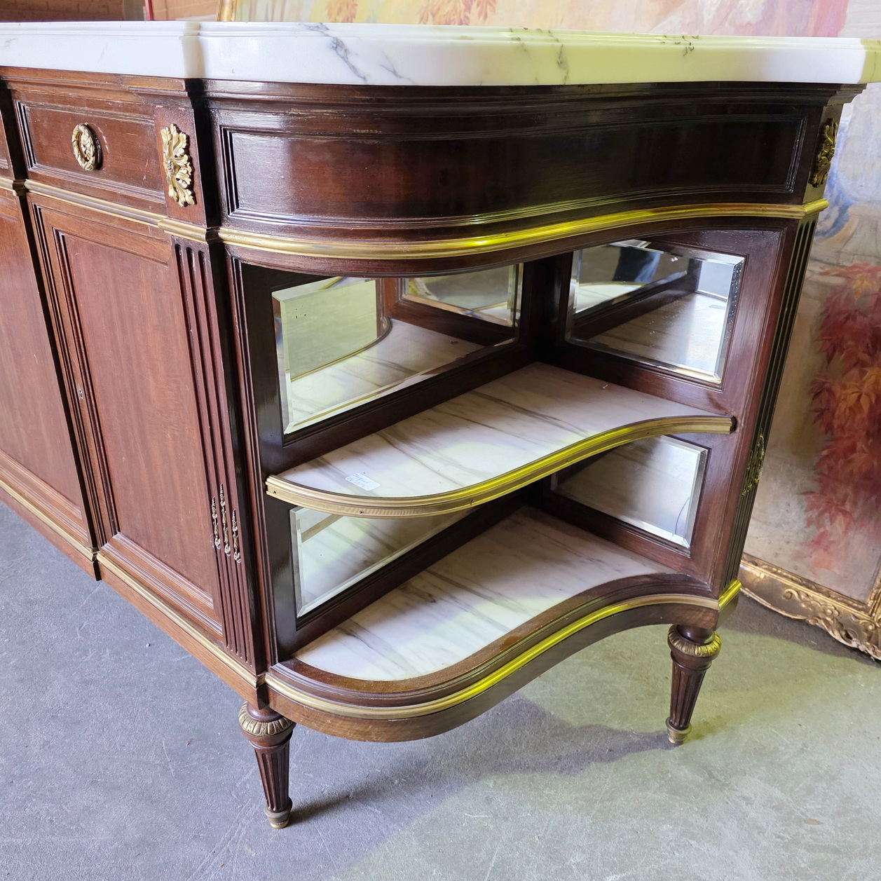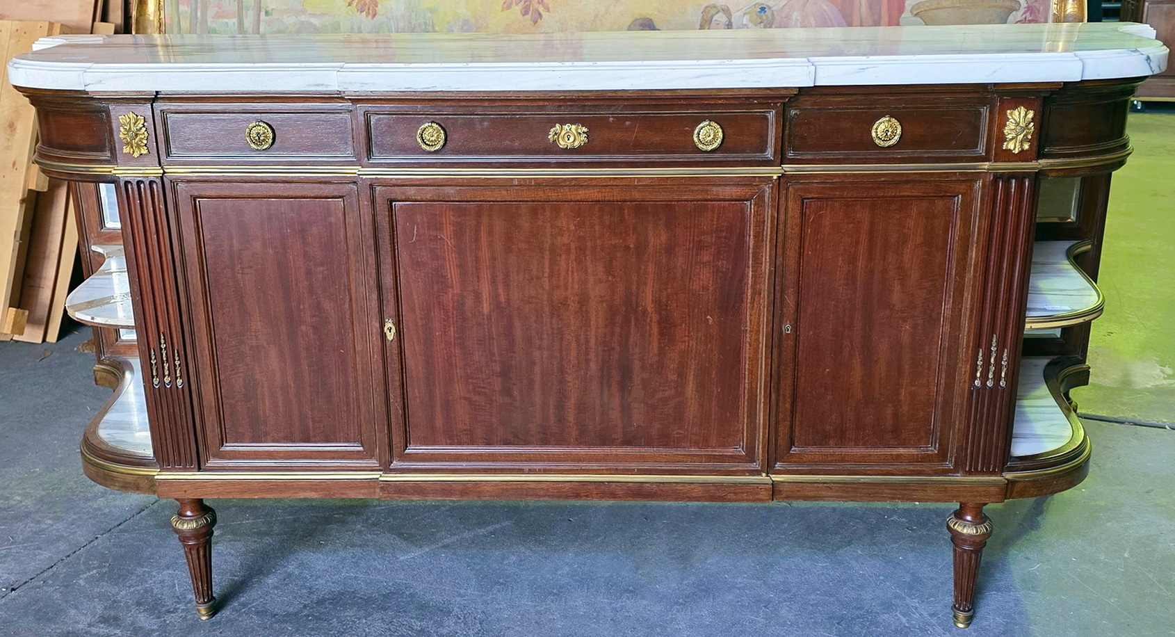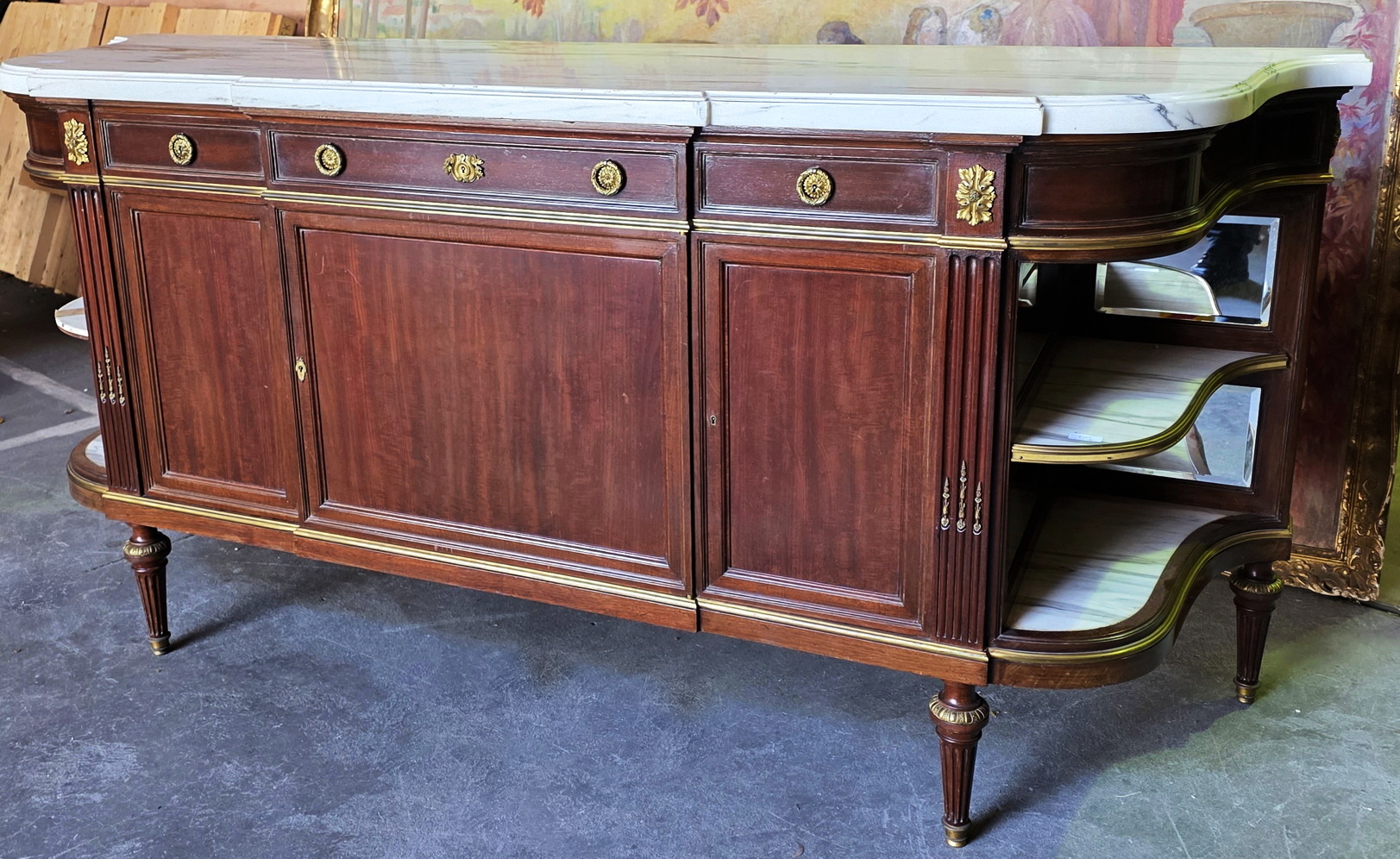 A fine and large, French Napoleon III period, Louis XVI style, mahogany, gilt brass mounted and moulded 'Buffet Enfilade' sideboard of three drawers and three cupboard doors, of Parisian Neoclassical elegance. Retaining its original and thick, shaped and moulded Carrara marble top. Internally fitted with the original shelves. Please note the jewellery like quality of the metal work, the perfect proportions and the elegance of the two curved open shelved sections on the flanks, each lined with the original, bevelled edge mirrors. Retaining all the original locks and keys. The top-right hand moulding is etched with the signature "F. Linke". François Linke (1855-1946) is regarded as one of the most important cabinetmakers (ébénistes) of all time. Born in 1855 in the Czech Republic, Linke moved his workshop to Paris in 1875. Area of Paris, circa 1890.