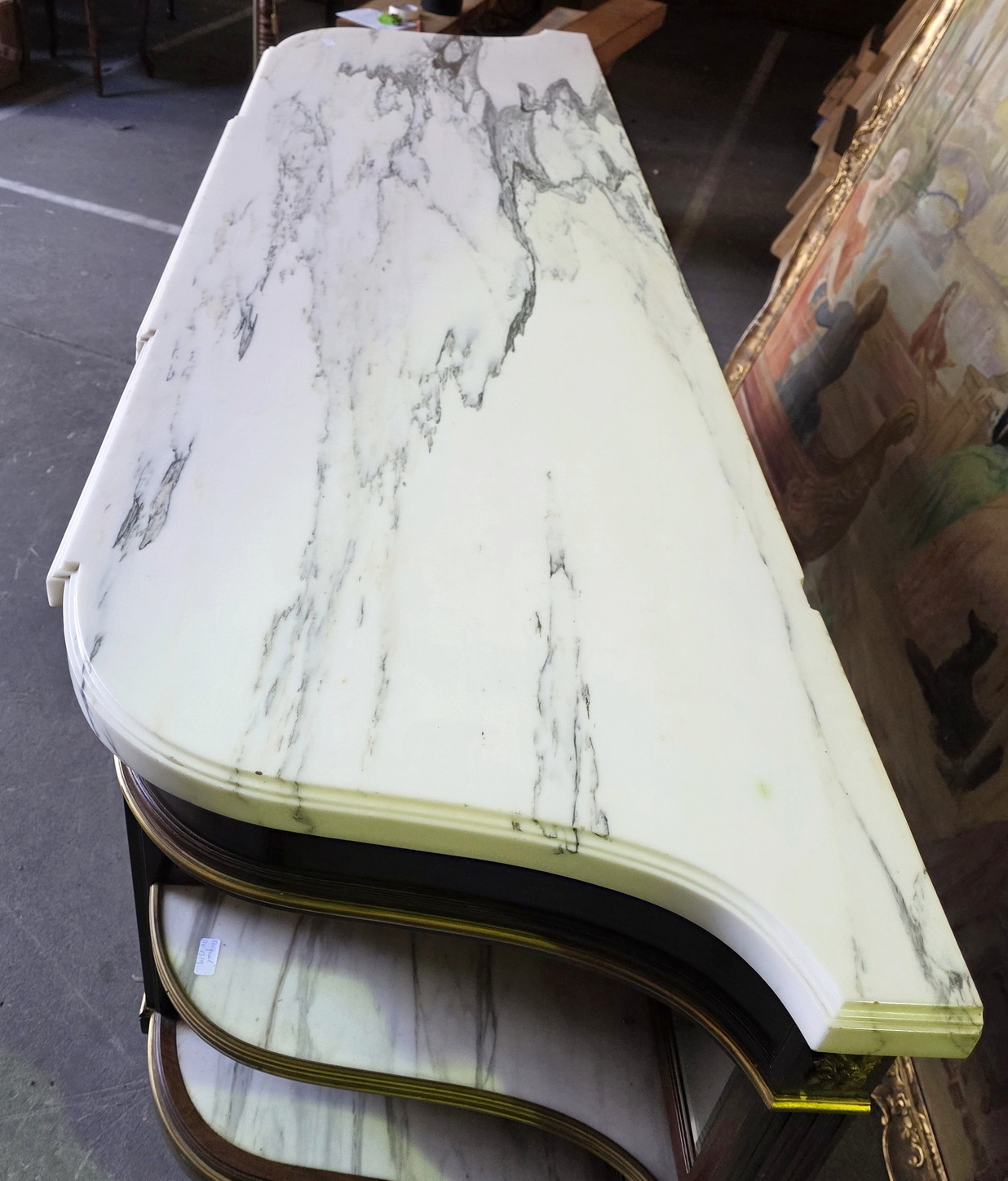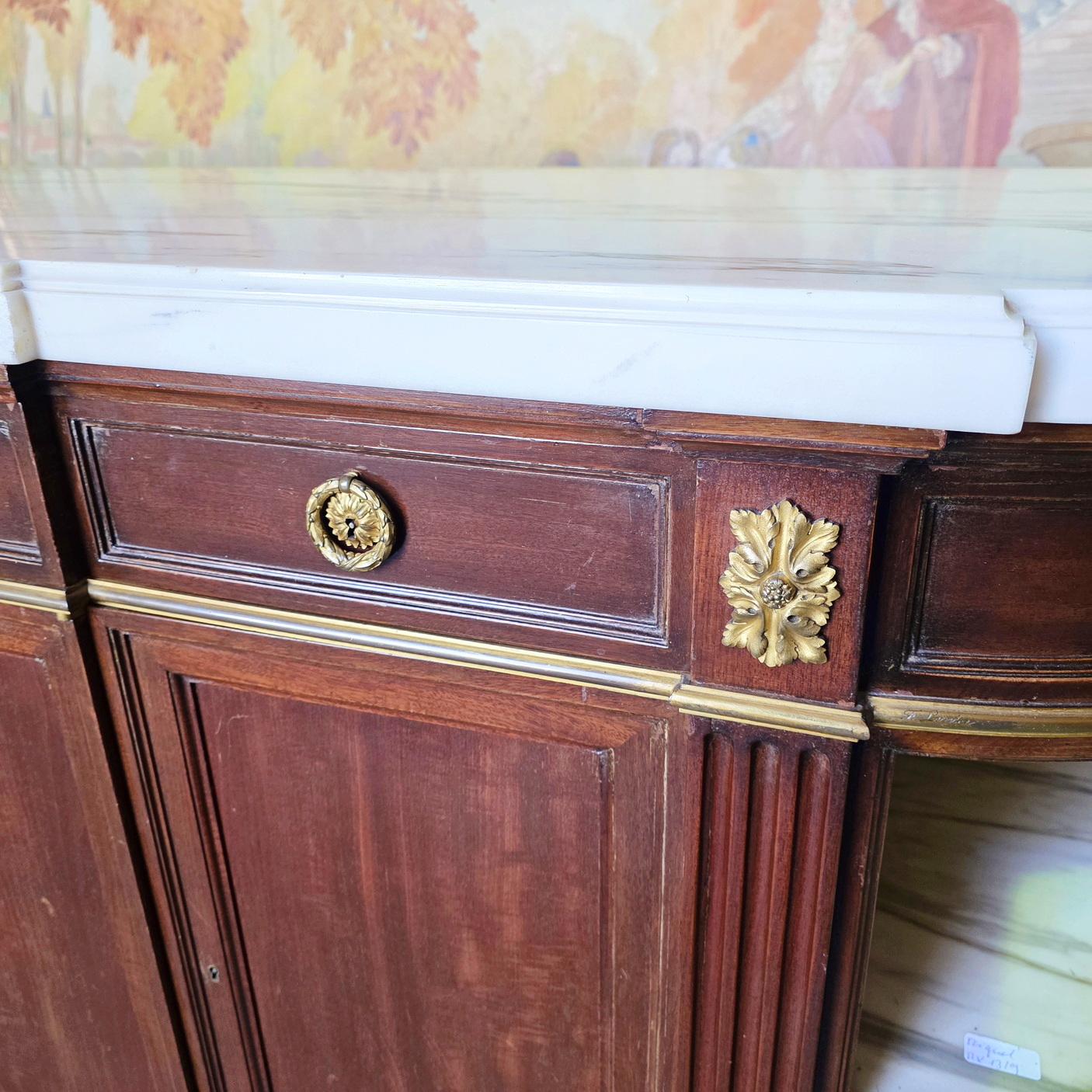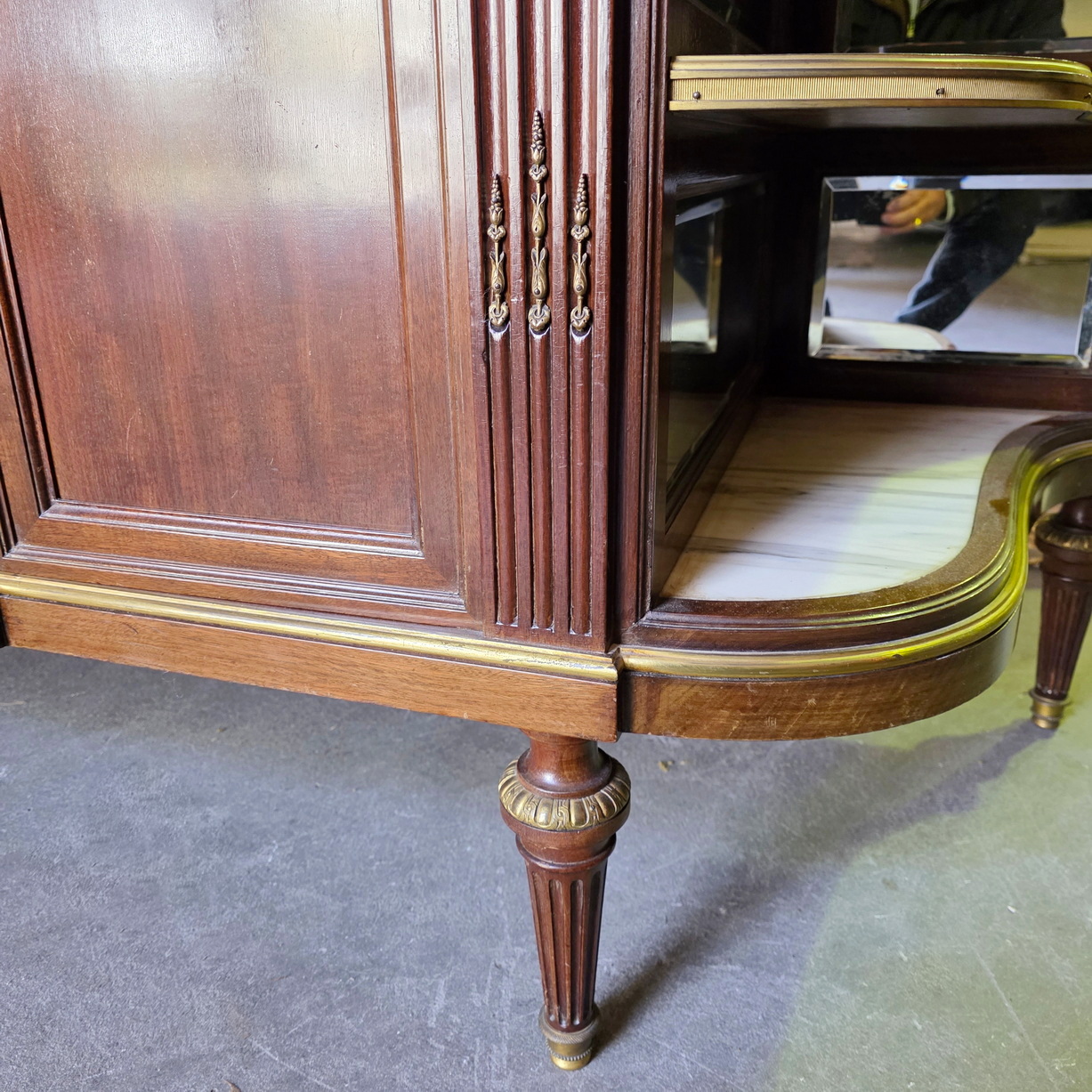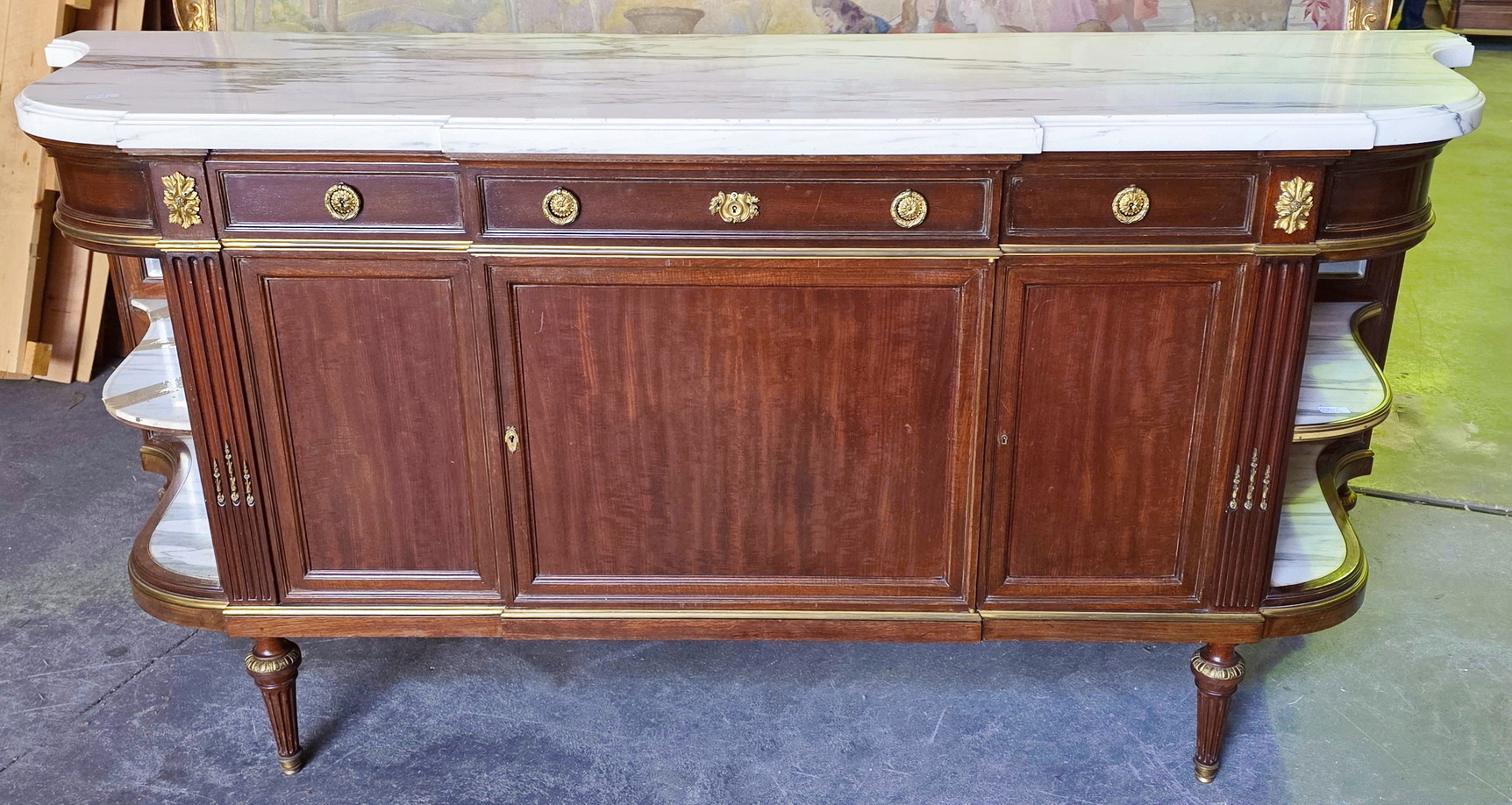 A fine and large, French Napoleon III period, Louis XVI style, mahogany, gilt brass mounted and moulded 'Buffet Enfilade' sideboard of three drawers and three cupboard doors, of Parisian Neoclassical elegance. Retaining its original and thick, shaped and moulded Carrara marble top. Internally fitted with the original shelves. Please note the jewellery like quality of the metal work, the perfect proportions and the elegance of the two curved open shelved sections on the flanks, each lined with the original, bevelled edge mirrors. Retaining all the original locks and keys. The top-right hand moulding is etched with the signature "F. Linke". François Linke (1855-1946) is regarded as one of the most important cabinetmakers (ébénistes) of all time. Born in 1855 in the Czech Republic, Linke moved his workshop to Paris in 1875. Area of Paris, circa 1890.