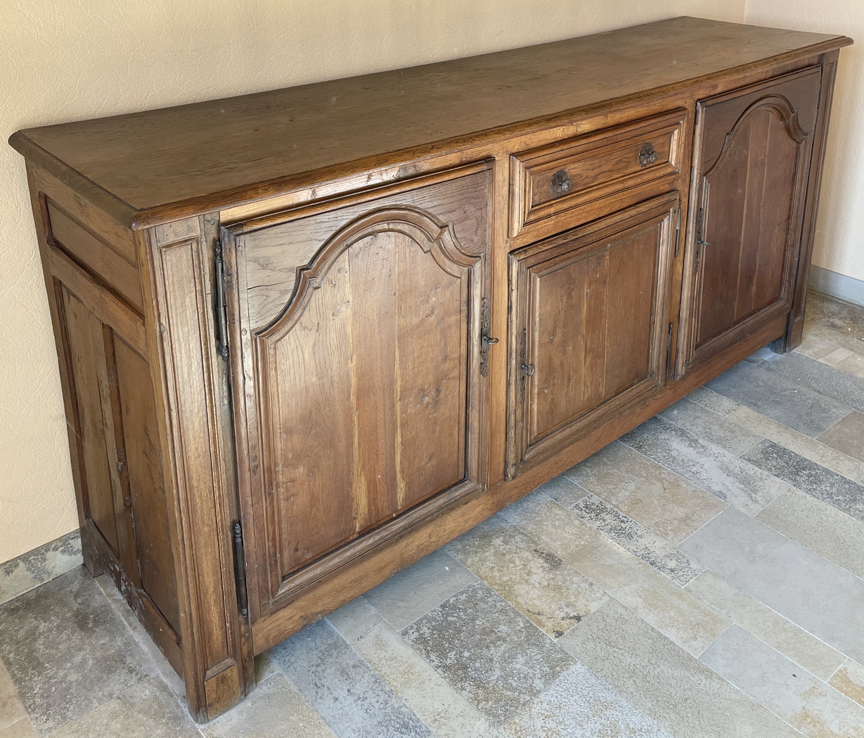 An 18th century French Regence period, carved solid oak three door and one drawer Buffet d’Enfilade, of masculine and formal design. Internally fitted with shelves. Please note the high quality of the moulded panels and of the original steel hardware. In excellent colour and with very good, Classical proportions. Area of isle de France (Greater Paris), circa 1730.