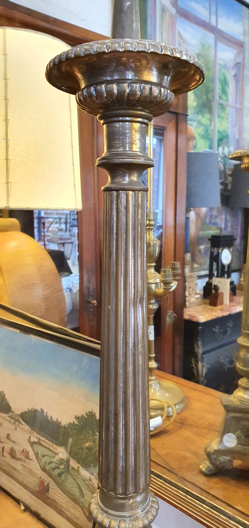A pair of 19th century Regence style French silvered brass "pique-cierge" candelabra, the silvered finish worn and showing some of the brass coming through. This pair is tall enough to be used for candle lighting (for use on a dining table), but on request, can also be sympathetically wired to safety standards and be fitted with suitable lampshades. Area of Paris, circa 1880.