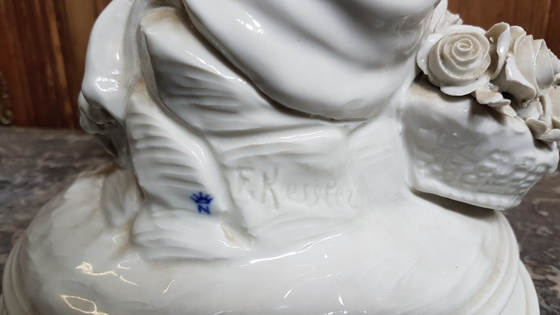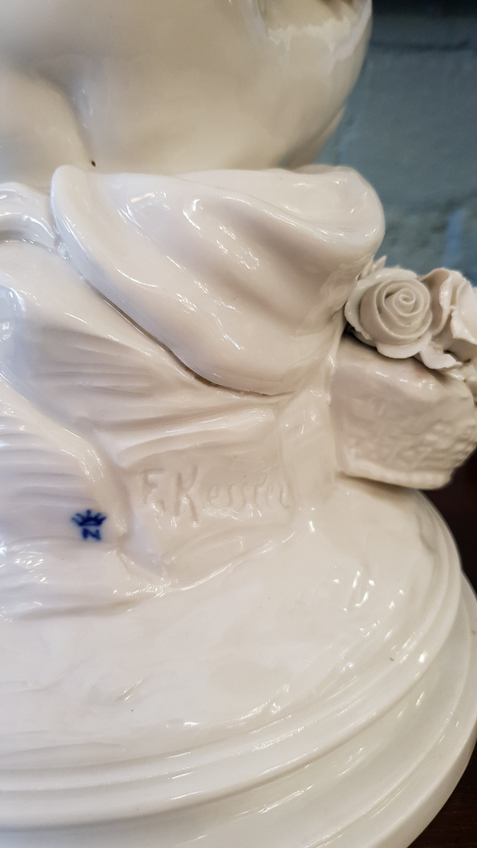 A fine 19th century Capodimonte white porcelain statuette representing a seated Putto making garlands of flowers, on a plinth strewn with roses. The rear with Capodimonte's crowned ā€œNā€ stamp, and signed "Kessler". Area of Naples, Italy, circa 1880.