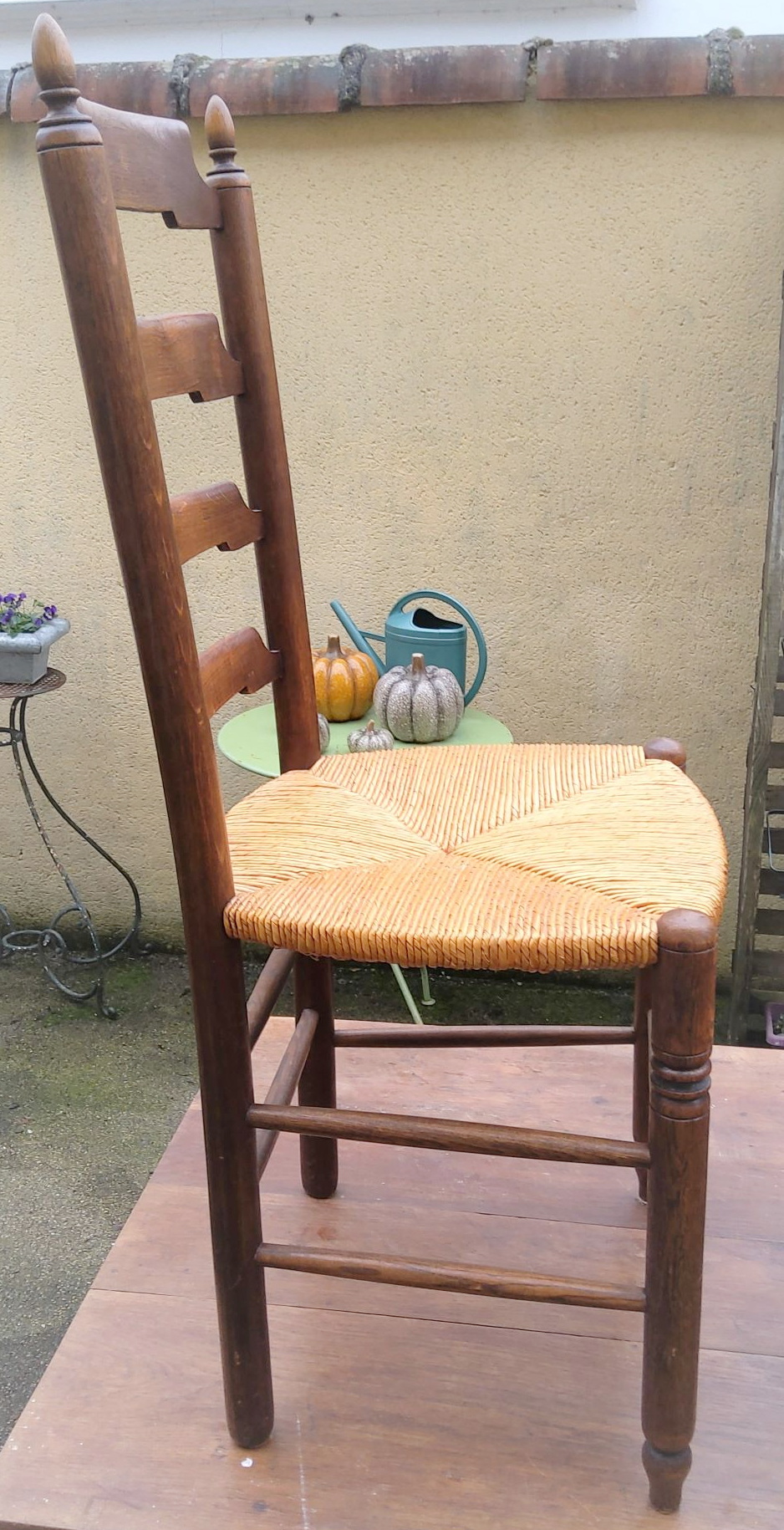 A pair of French Provincial turned oak tall ladder-back chairs, the comfortable seats fitted with envelope-shaped woven rushing. These chairs are sturdy, lightweight and comfortable to sit on. Area of Normandy, circa 1930.