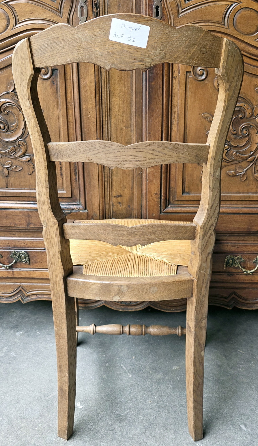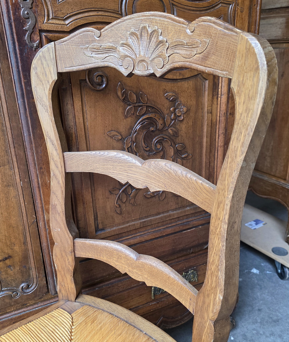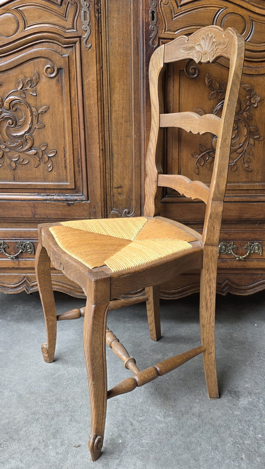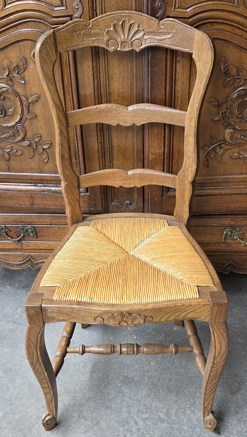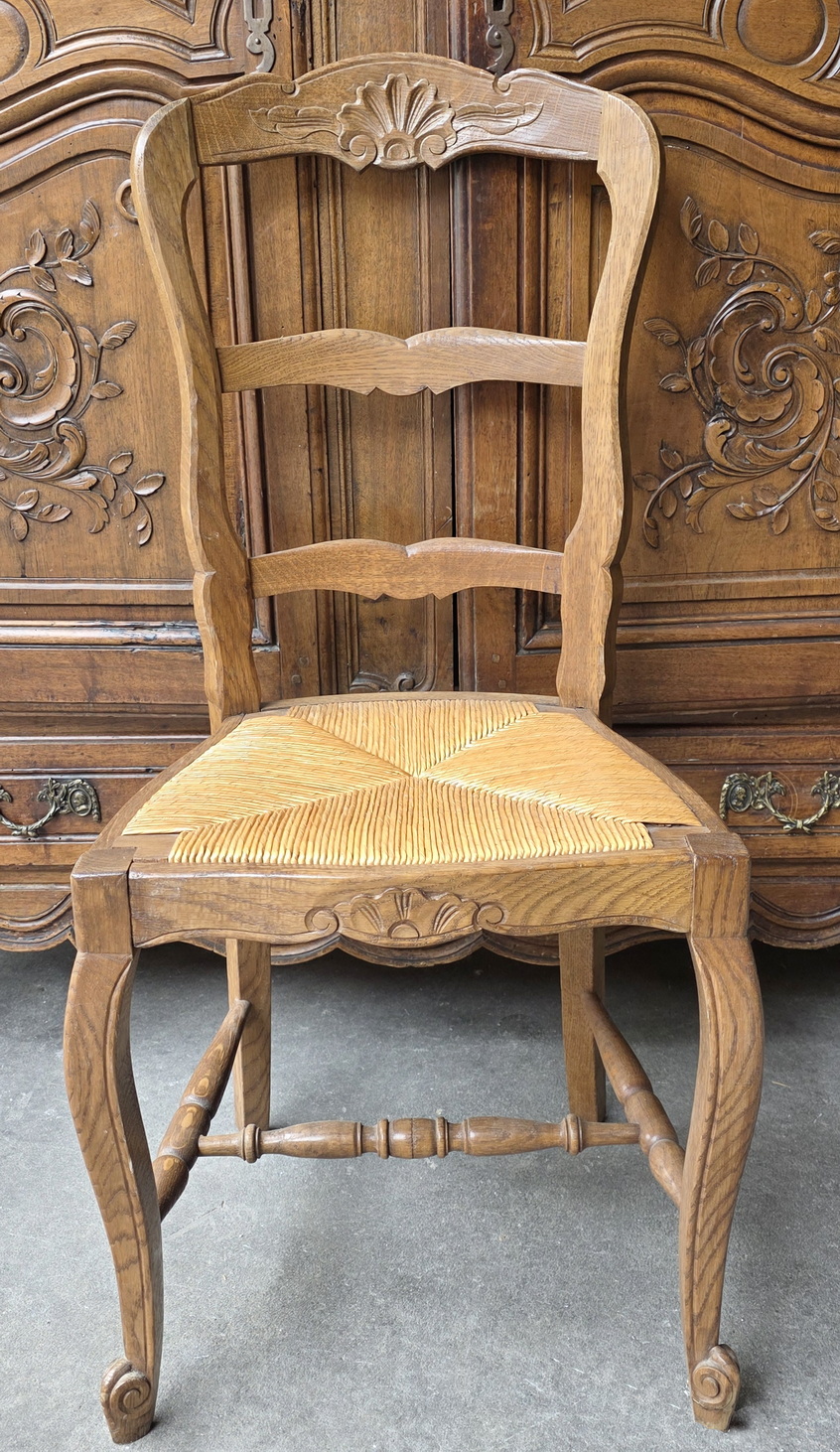 A set of six French Provincial, Louis XV style, carved solid oak ladderback chairs, each chair fitted with a drop-in woven rush seat, the top rails and the front rails decorated with haut relief carved seashell and foliate motifs, standing on elegant Cabriole legs. These dining chairs are lightweight, comfortable, and sturdy everyday-use chairs. Area of Southern France, circa 1930.