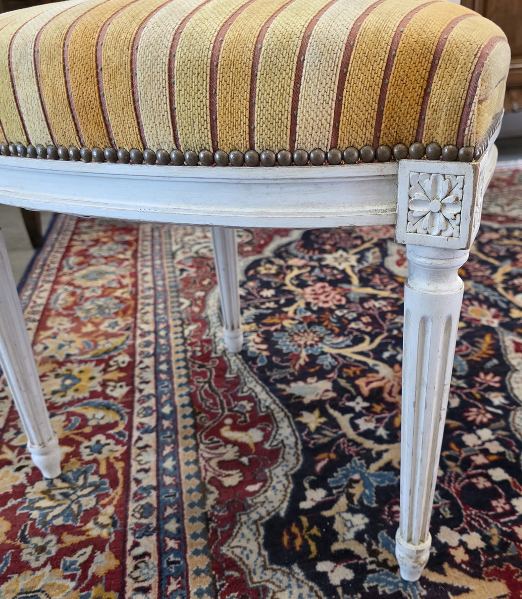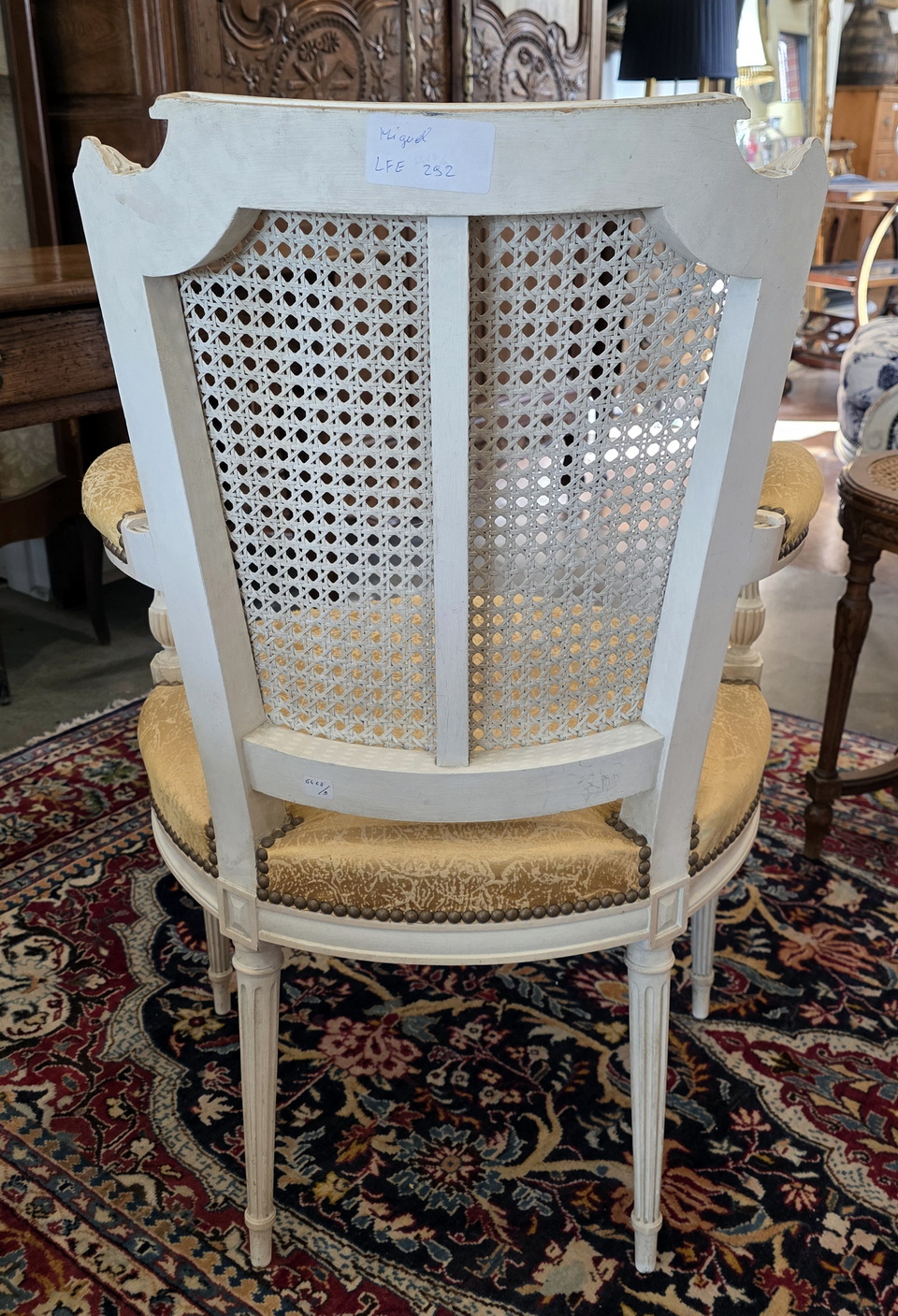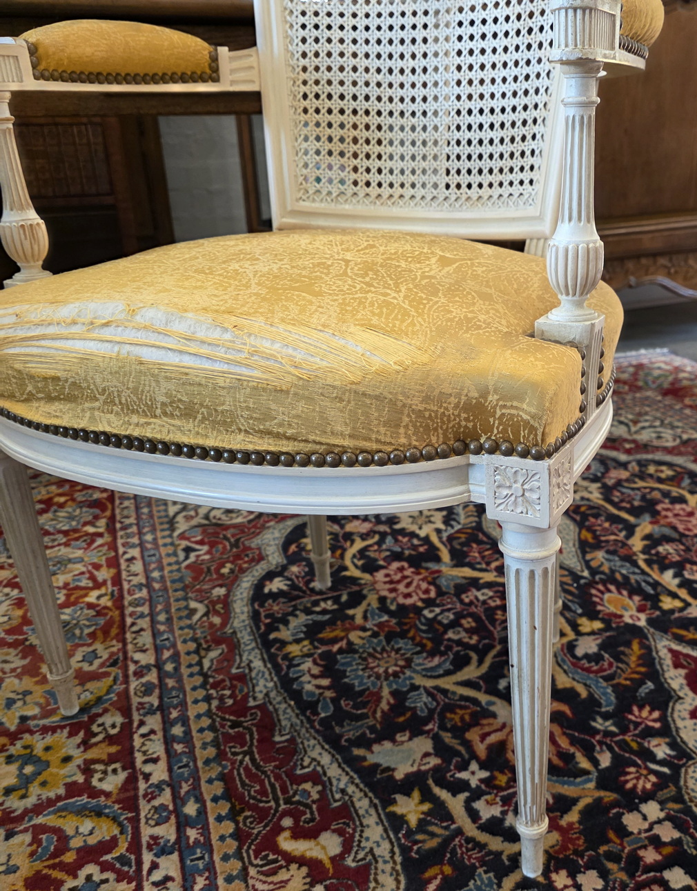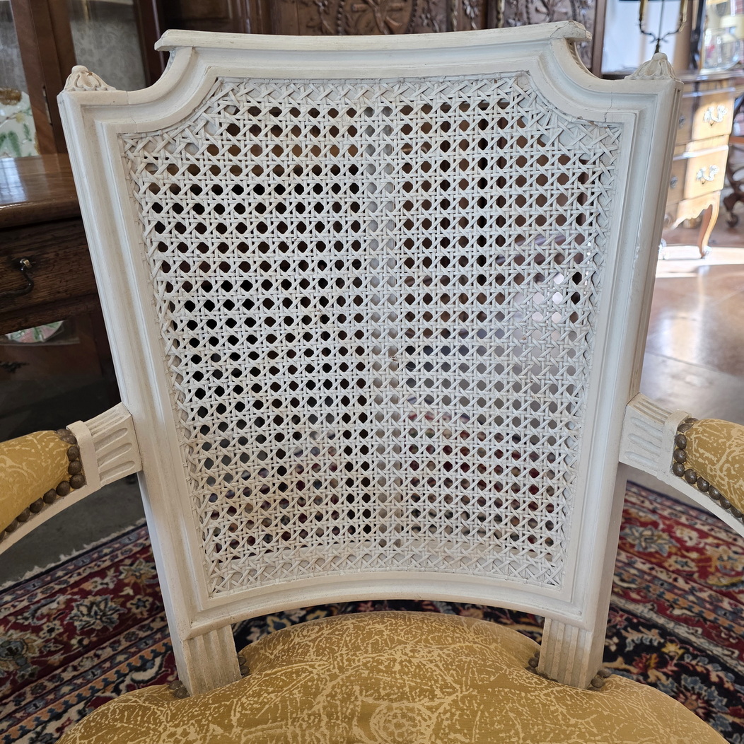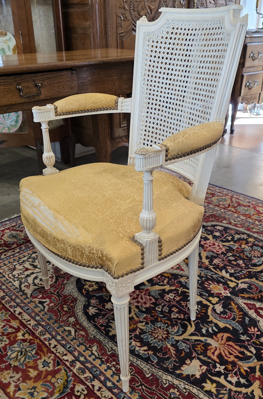A pair of 19th century French Louis XI style, carved, turned and painted Fauteuil armchairs of fine and Classical proportions, the back-rests with a subtly painted criss-cross pattern on the woven rattan cane, with 'Chapeau de Gendarme' top rails and with upholstered seats, standing on elegantly tapering and fluted legs. Please note the wonderful luminosity of the painted finish. The seats are of a height suitable to sit at a table. Area of Paris, circa 1880.