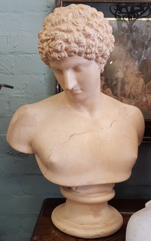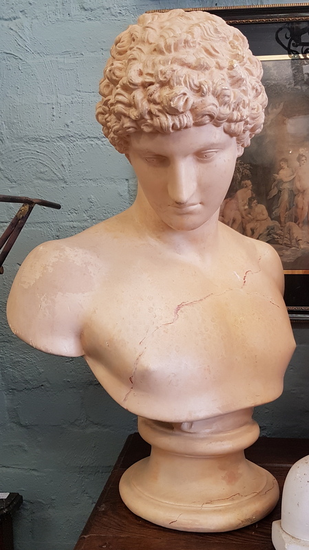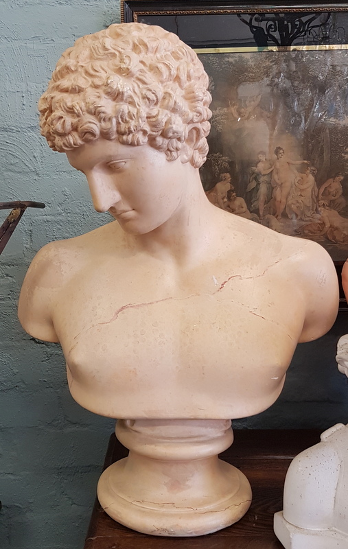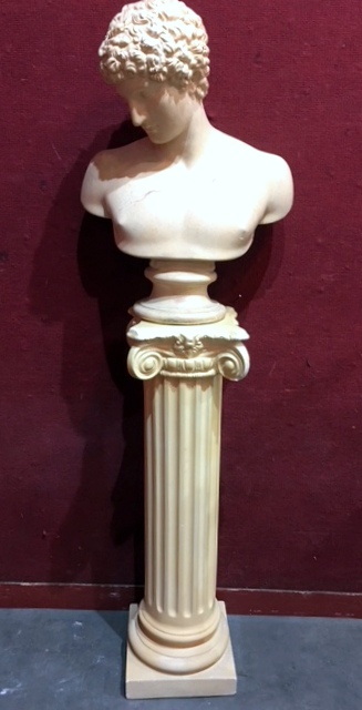 A full-size French Classical Roman plaster bust of of a young man, standing on its circular plinth. The plaster finish is a hand-painted faux-marble. Area of Paris, circa 1950.