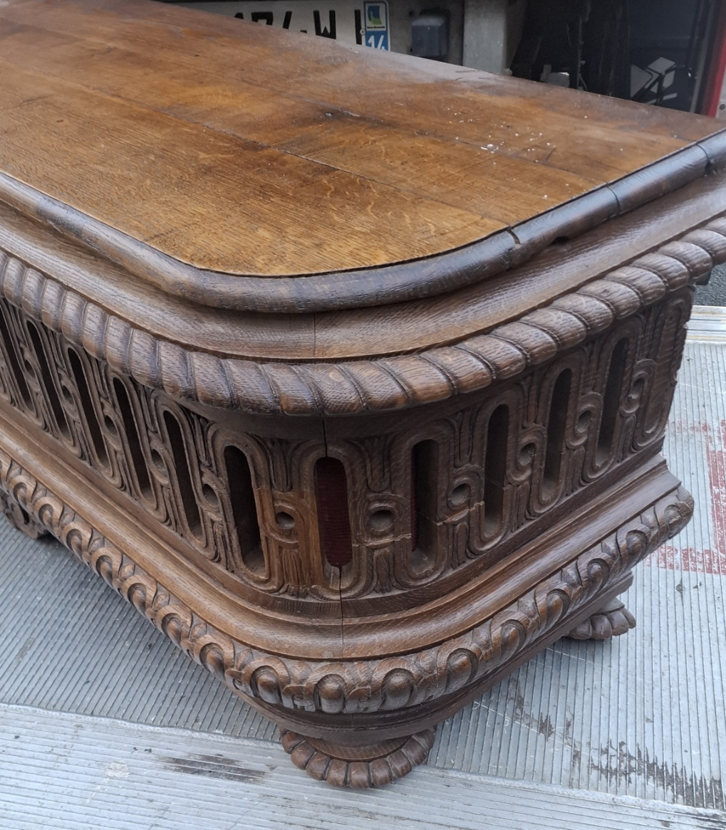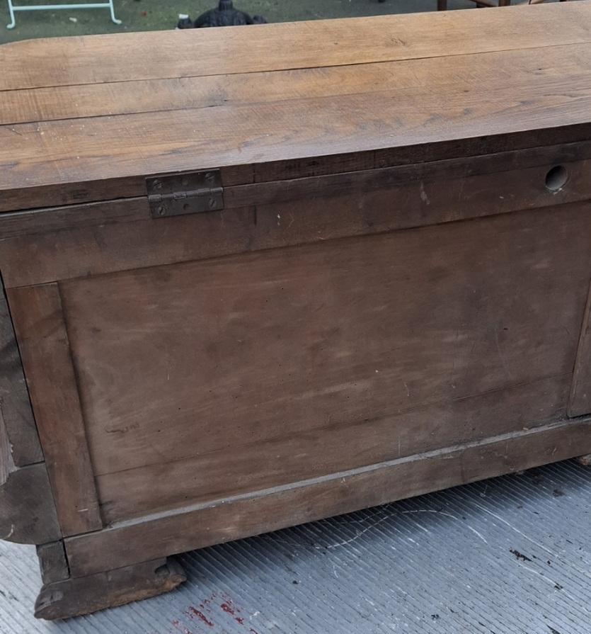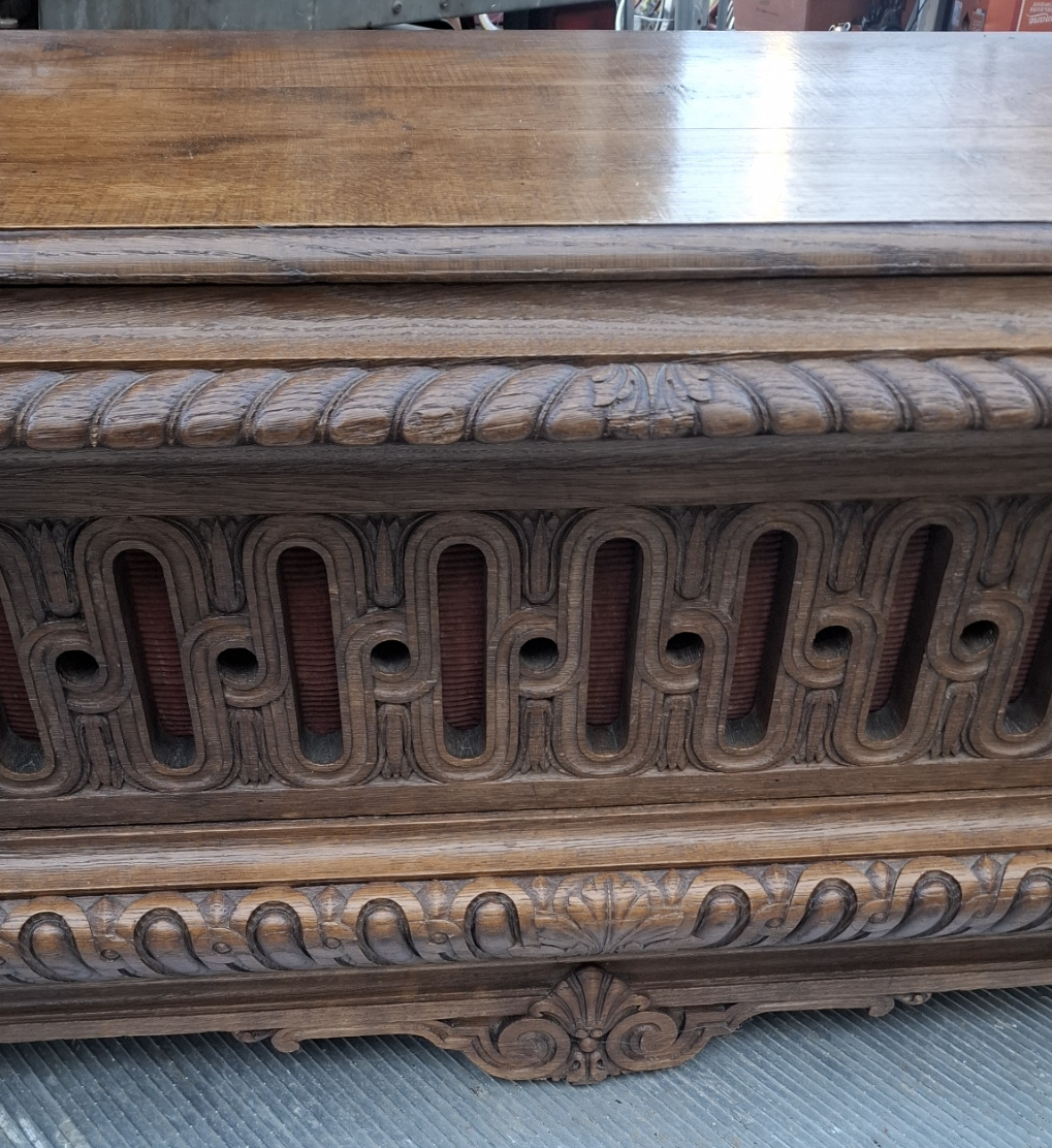 A 19th century French Henri II Renaissance style solid oak coffer, decorated with haut-relief hand carved ogee, gadrooned and loop mouldings, standing on turned pad feet. This coffer is typical of the Renaissance-revival French furniture manufactured in the 1860s, a copy of French King Henri II furniture made in the 16th century, in the Florentine Renaissance 'Mannerist' style. King Henri II had married Catherine de Medici, who brought to the court at Fontainebleau the fashion of the Florentine Renaissance. Please note the high quality of the carvings. Area of Paris, Italy, circa 1870.
