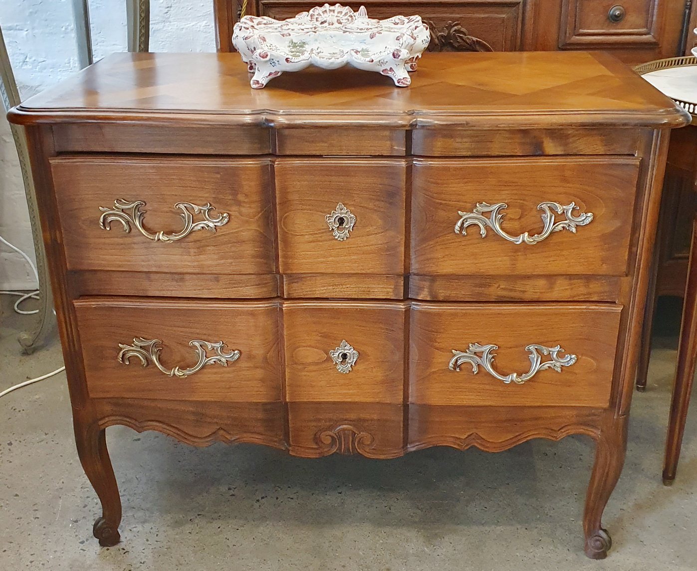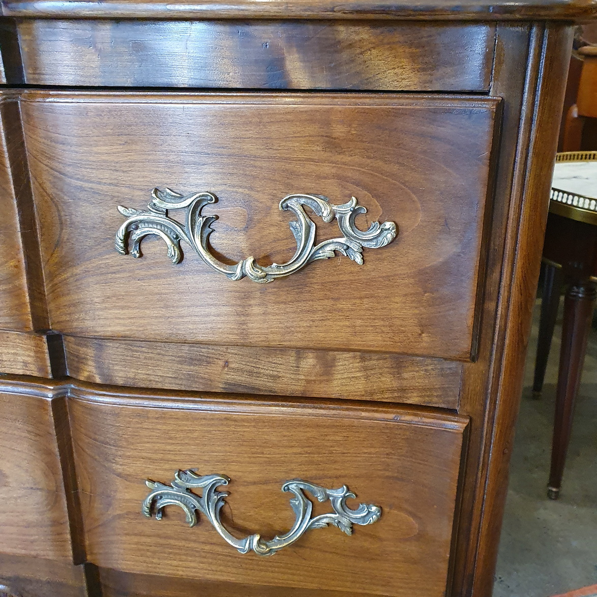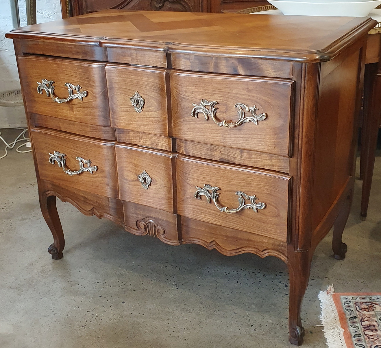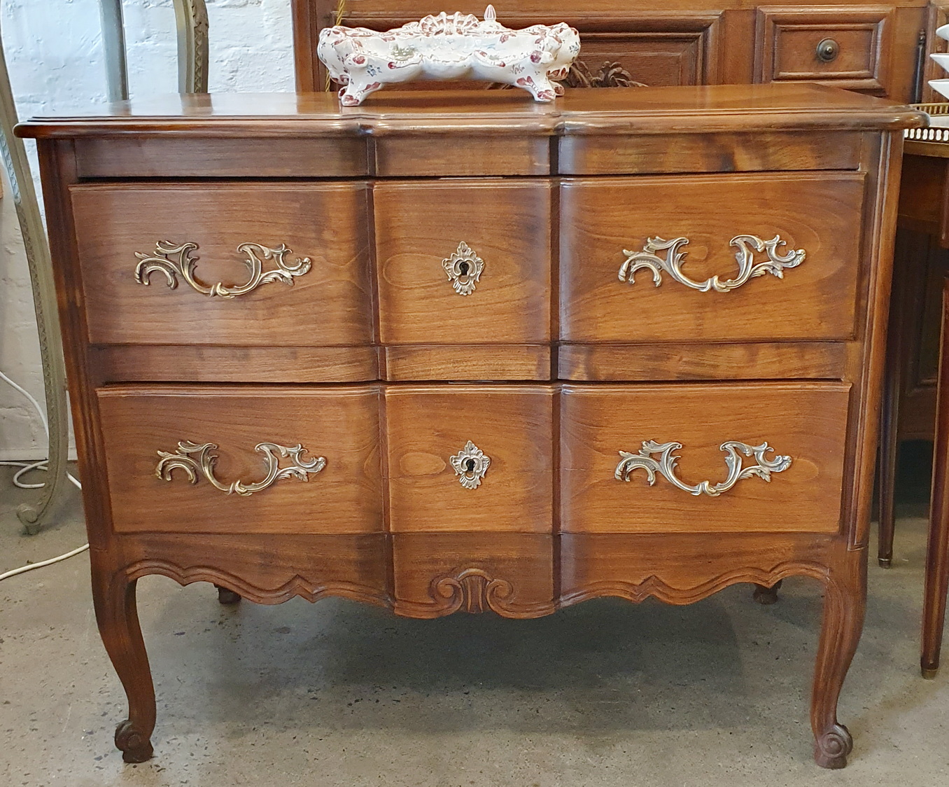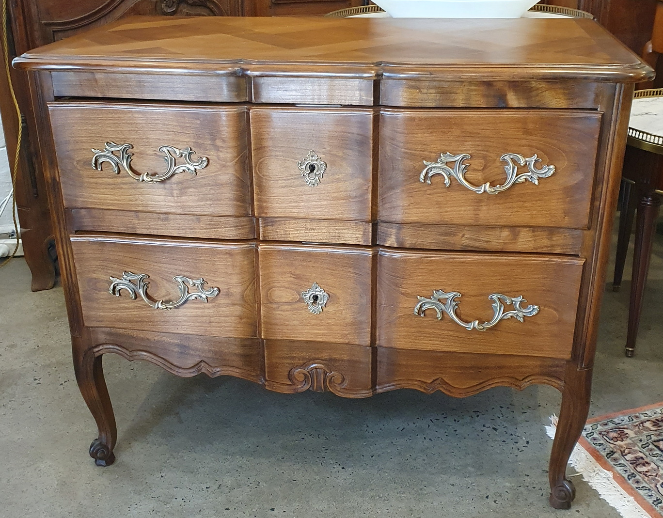 A Louis XV style, serpentine-fronted Provencale commode of very good proportions, the cherrywood timbers with a wonderful, walnut like patination. Of good cabinetmaking quality, retaining the original handles and escutcheons. Area of Southern France, early 20th century.