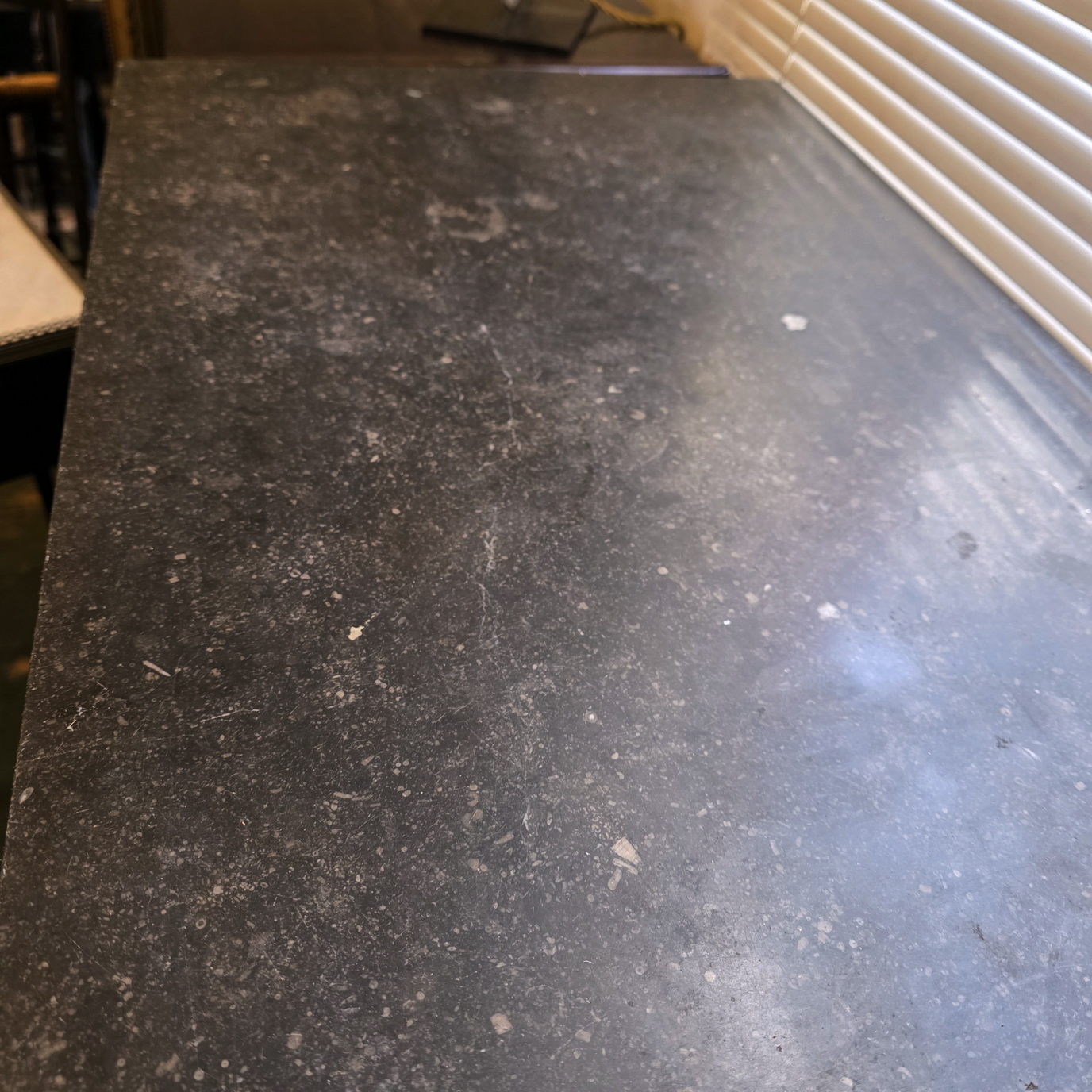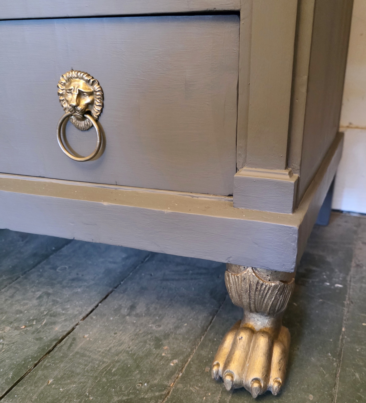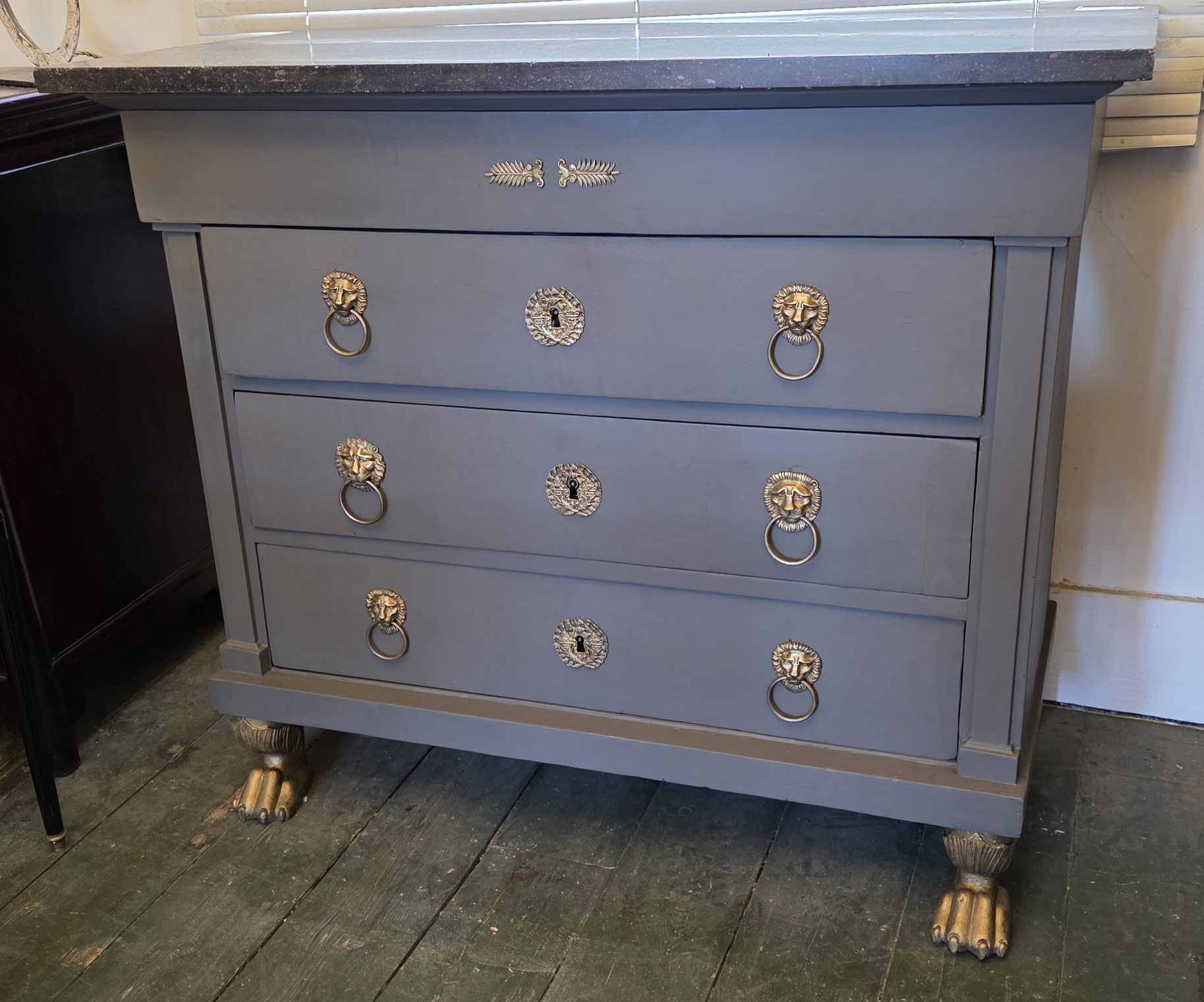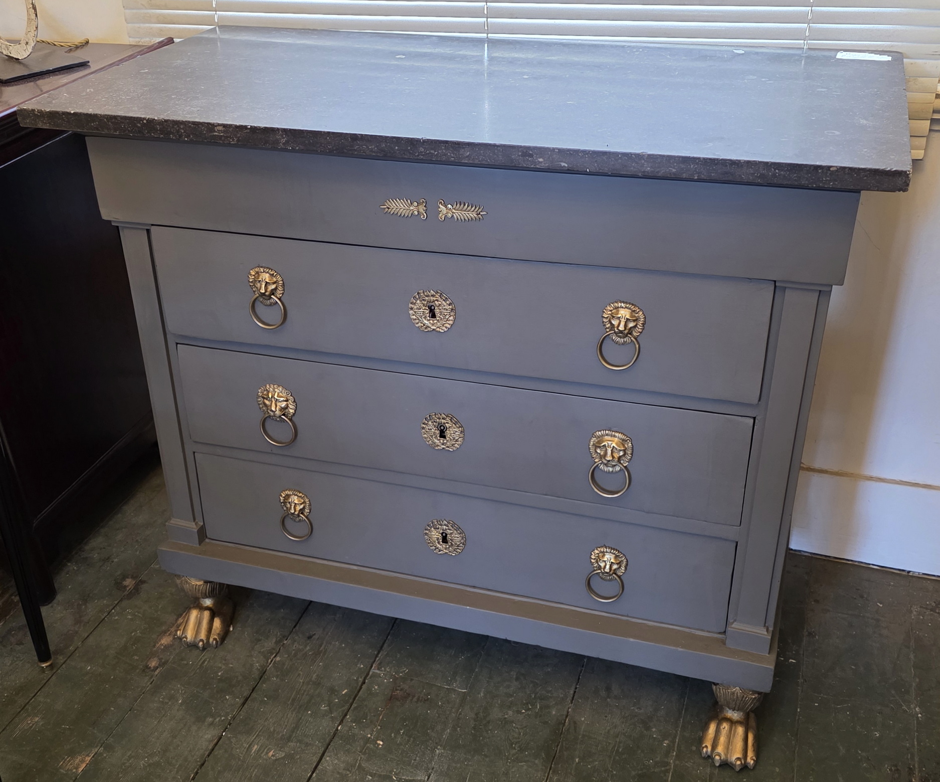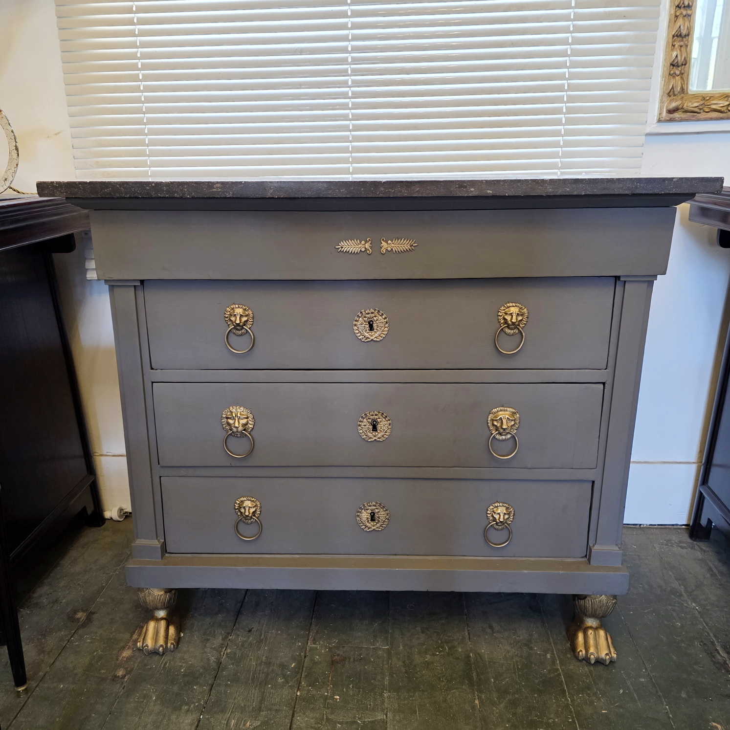 A 19th century French Empire period four drawer commode, painted a trianon grey and retaining the original, dark grey 'Gris Saint Anne' marble top, the lions' heads handles, escutcheons and mounts. Standing on carved and gilt lion's paws feet. Area of Paris, circa 1810.