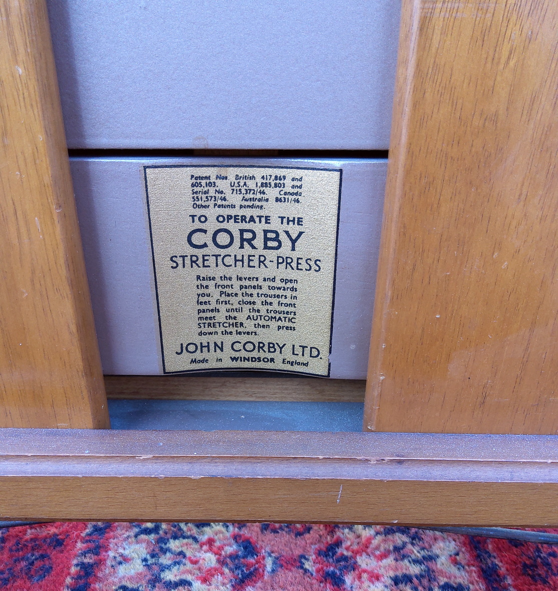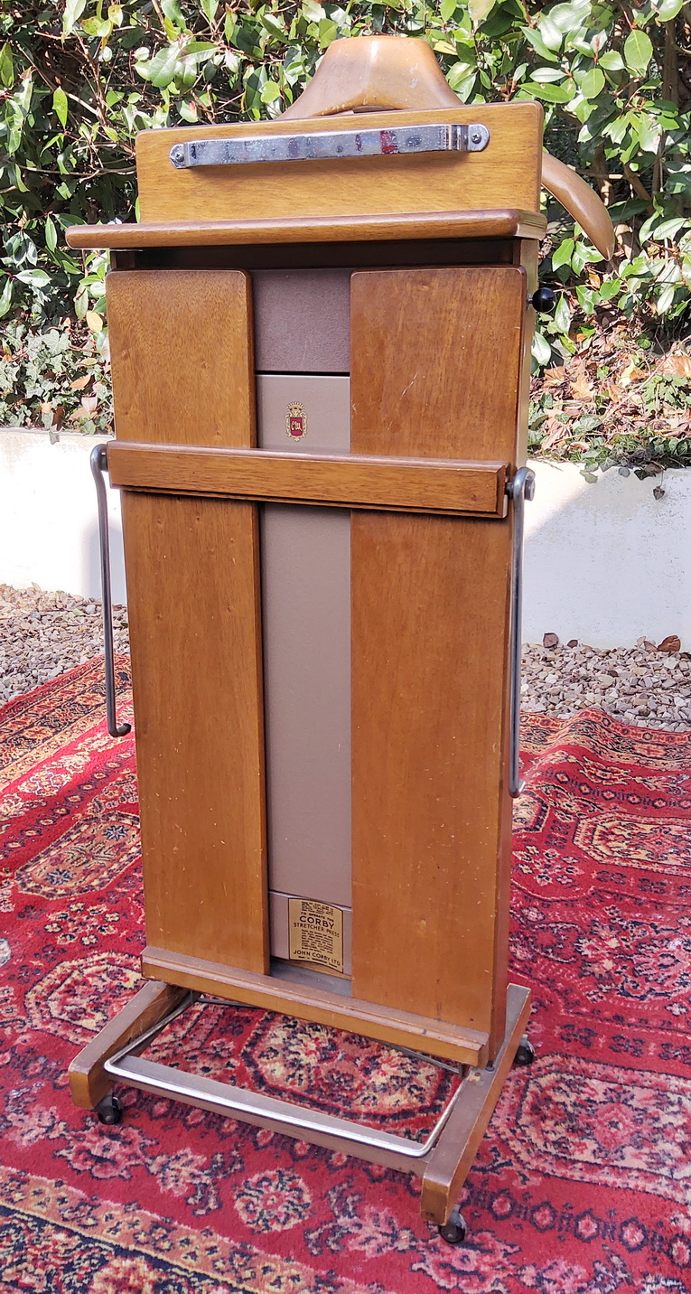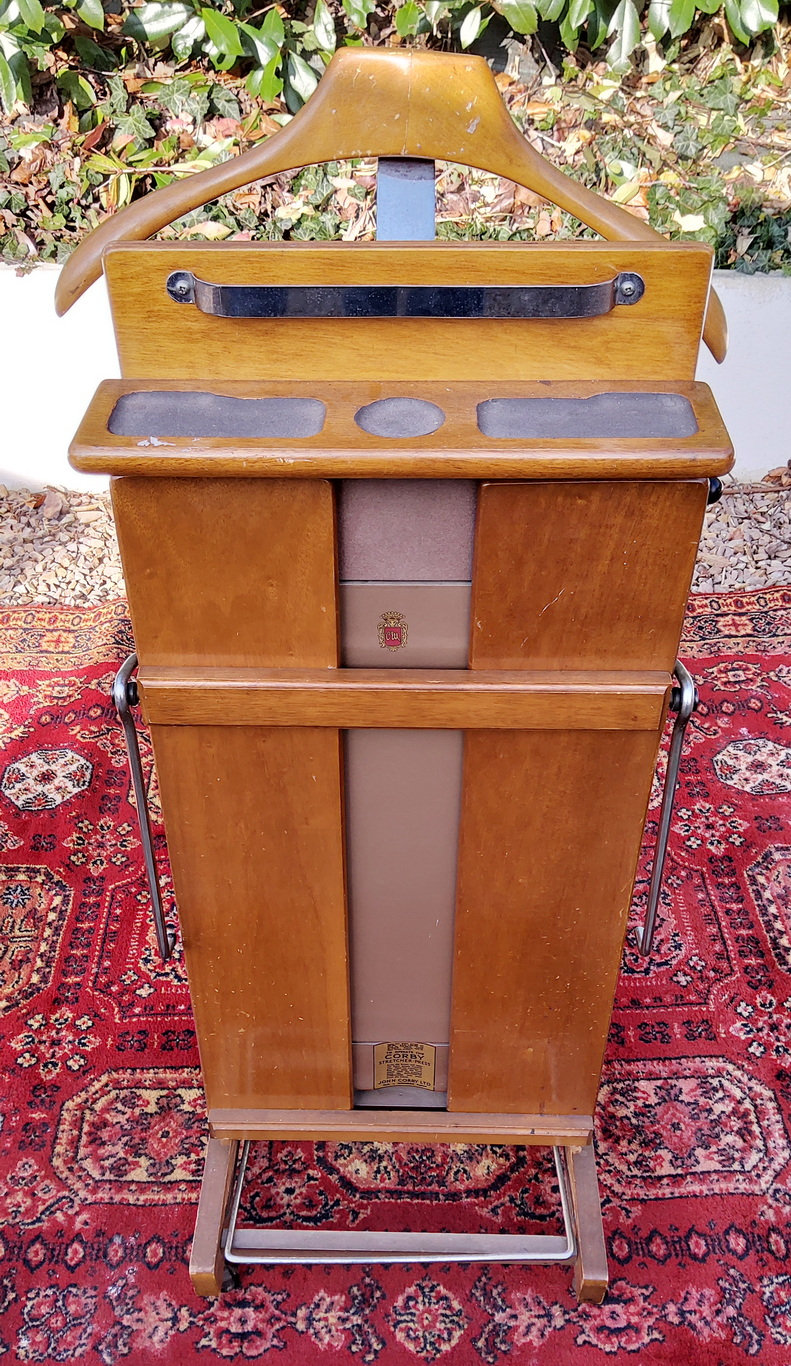 A vintage English 'Corby' clothes valet, or clothes press, complete with coat hanger, shelf with trays for emptying pockets into, a chrome rail, and a trouser stretcher/ press. Retaining the original maker's labels. Area of Windsor, circa 1960.