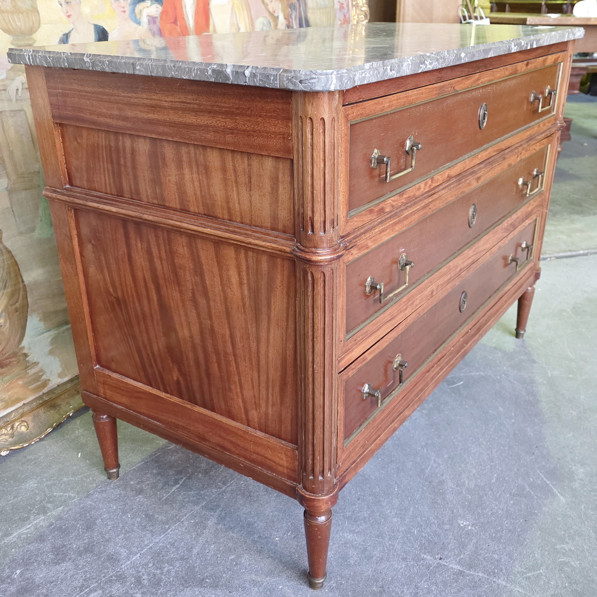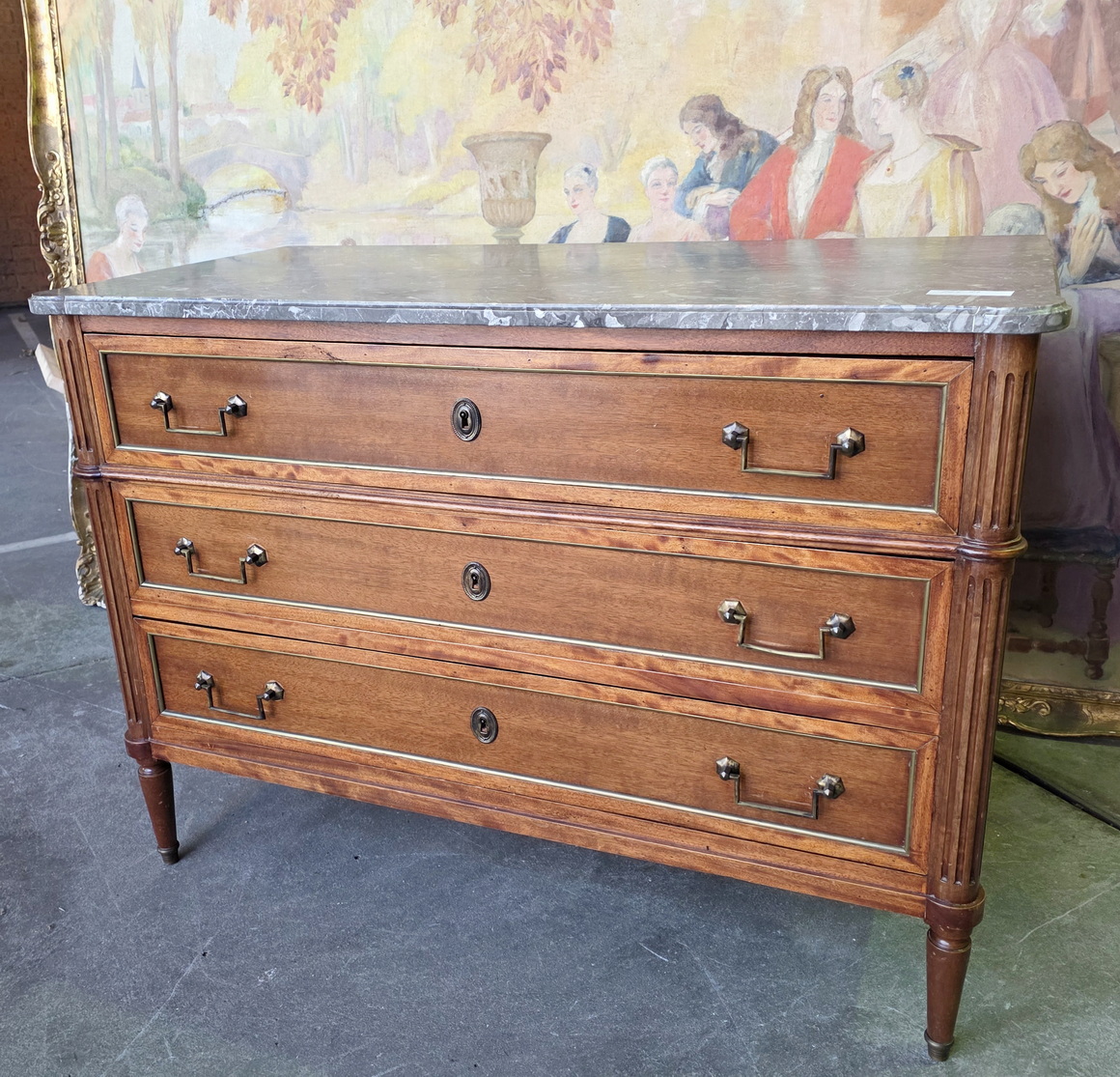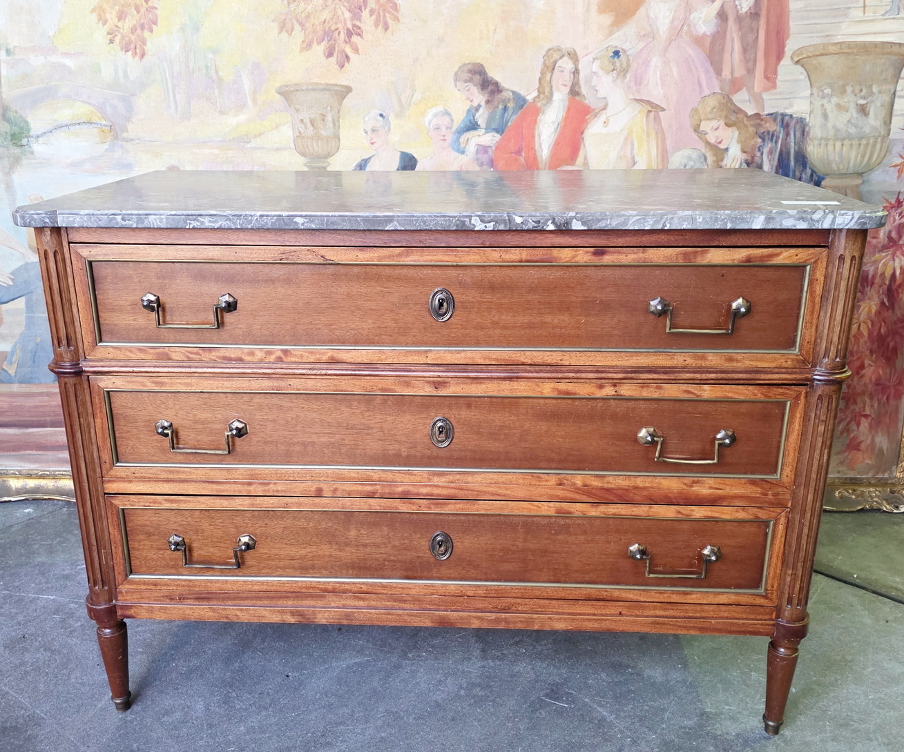 A 19th century French Napoleon III period, Louis XVI style, solid mahogany, plum mahogany and gilt brass mounted commode of three drawers, of masculine and Neoclassical elegance. Retaining its original, shaped and moulded 'Gris St. Anne' marble top and a nicely-faded and luminous mahogany patination, beautifully offset by the original gilt brass mouldings, handles and escutcheons. Area of Paris, circa 1870.