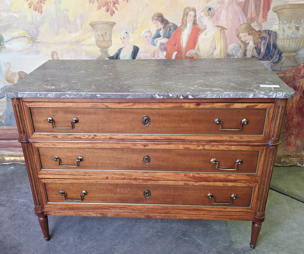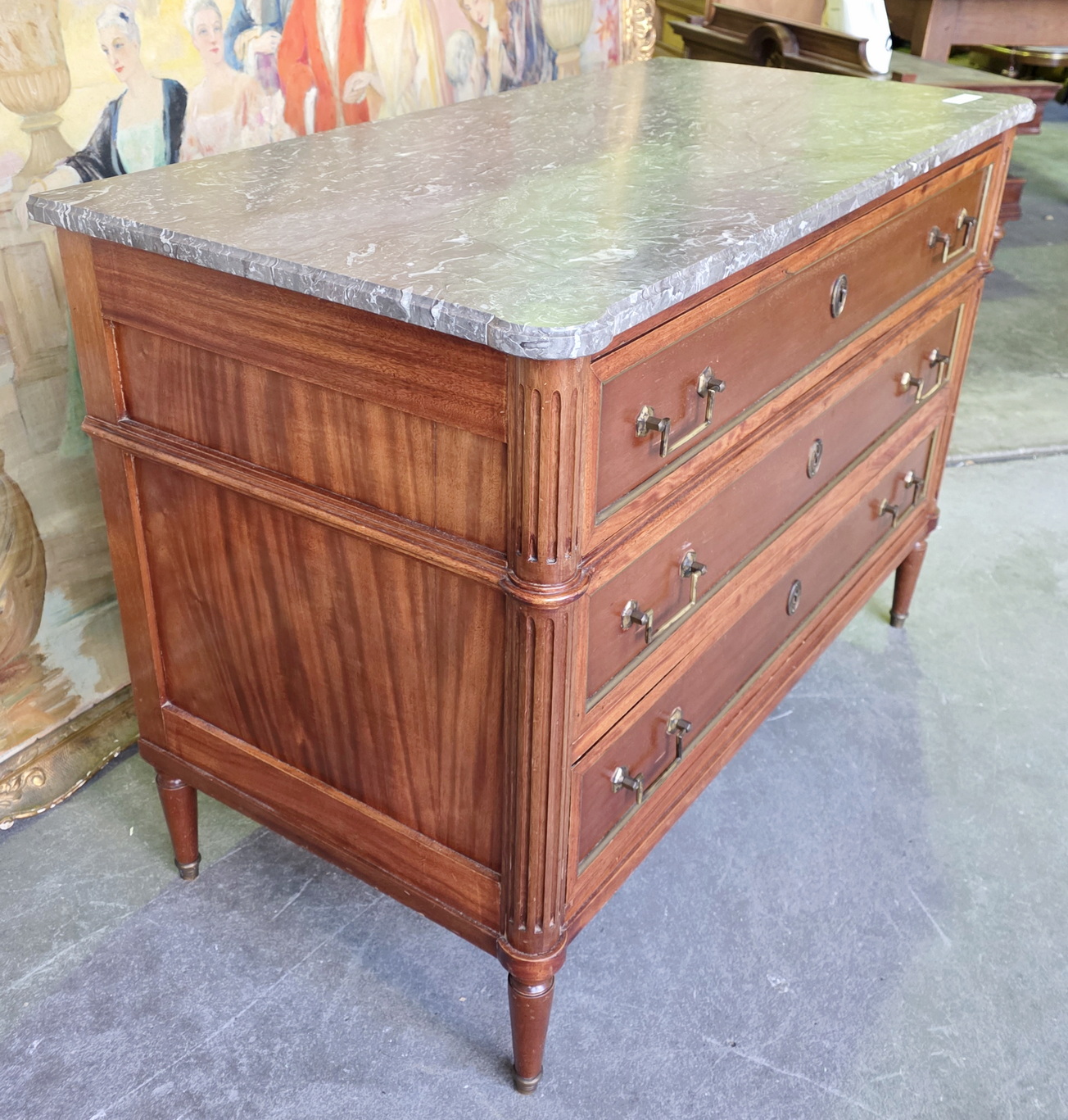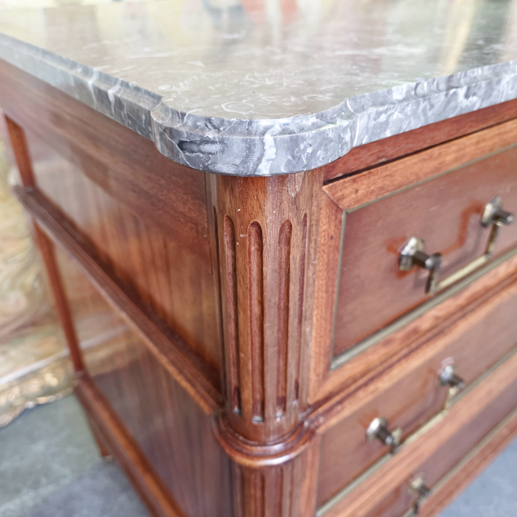 A 19th century French Napoleon III period, Louis XVI style, solid mahogany, plum mahogany and gilt brass mounted commode of three drawers, of masculine and Neoclassical elegance. Retaining its original, shaped and moulded 'Gris St. Anne' marble top and a nicely-faded and luminous mahogany patination, beautifully offset by the original gilt brass mouldings, handles and escutcheons. Area of Paris, circa 1870.