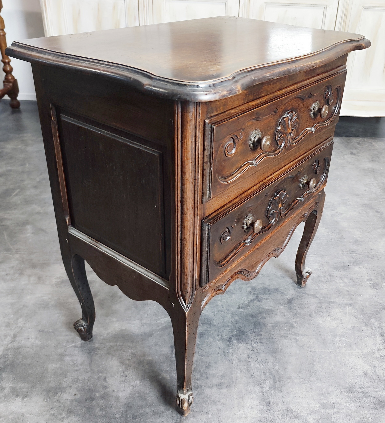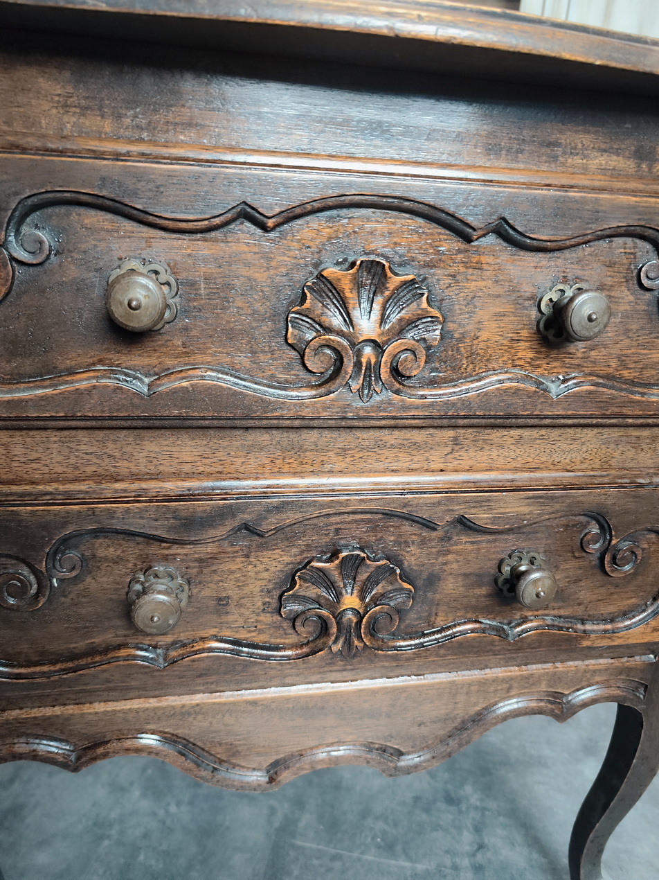 A 19th century French provincial Louis XV style solid walnut commode of two drawers decorated with a shaped top above haut-relief carved seashell decorations on the drawer fronts. Standing on graceful Cabriole legs and Escargot feet. Retaining the original walnut patina and the original drawer pulls. Area of Lower Normandy, circa 1880.