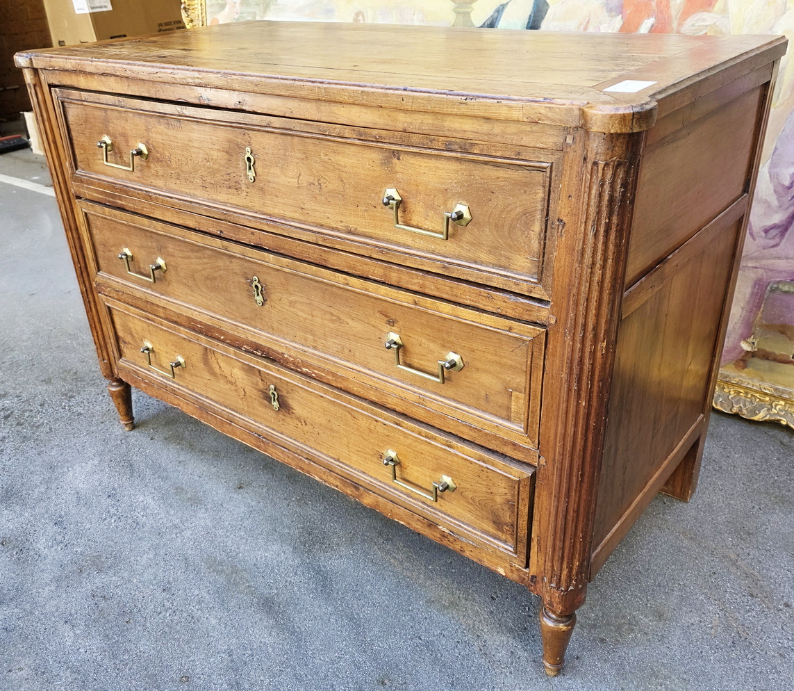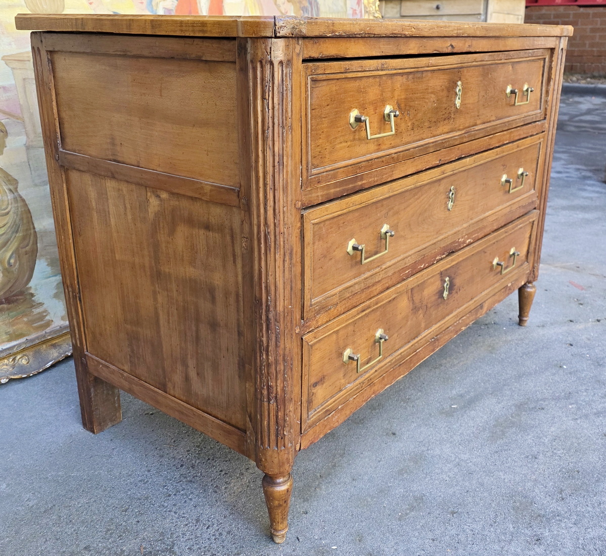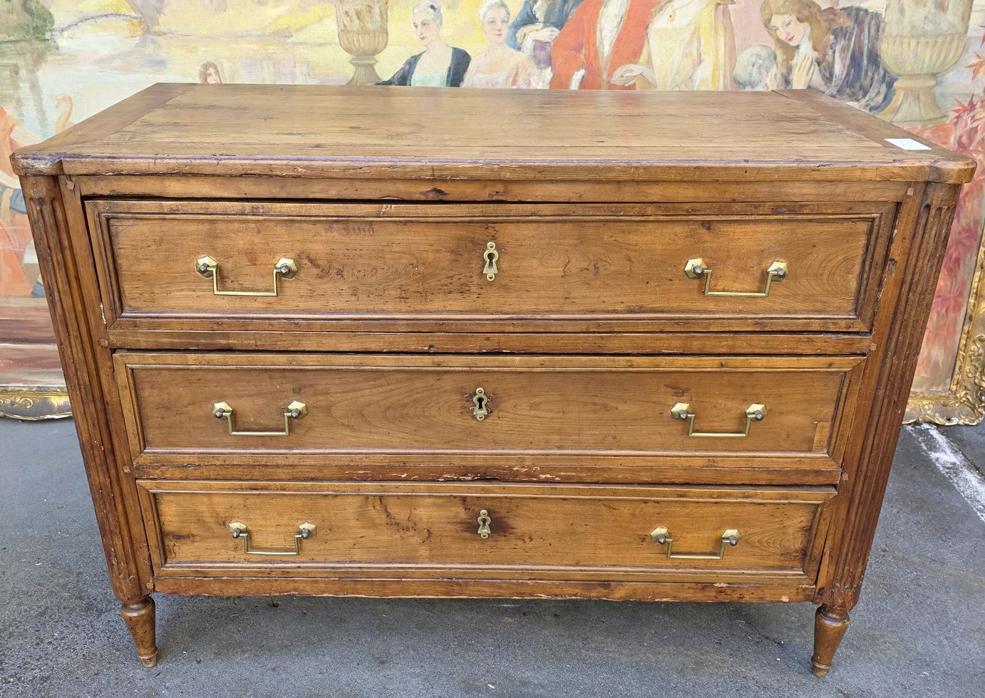 An elegant and understated French Louis XVI period, faded solid cherrywood commode of three drawers of simple, Neoclassical design, the timbers very nicely burnished over time, retaining its original gilt brass ring handles and escutcheons. Please note the elegance of this commode, standing on finely turned 'Jacob' style legs. Area of Isle de France (Greater Paris), circa 1780.