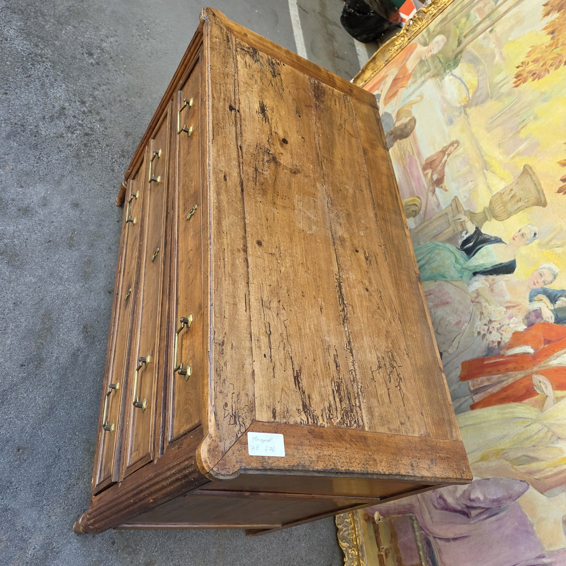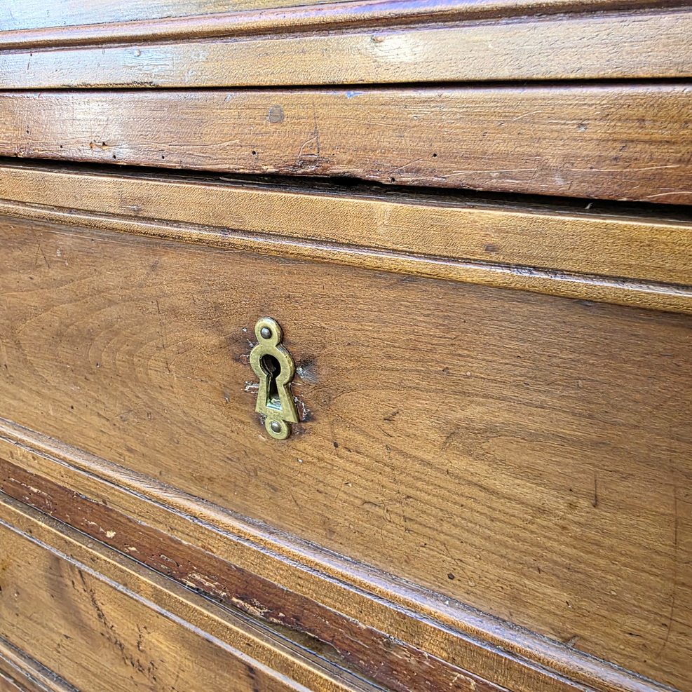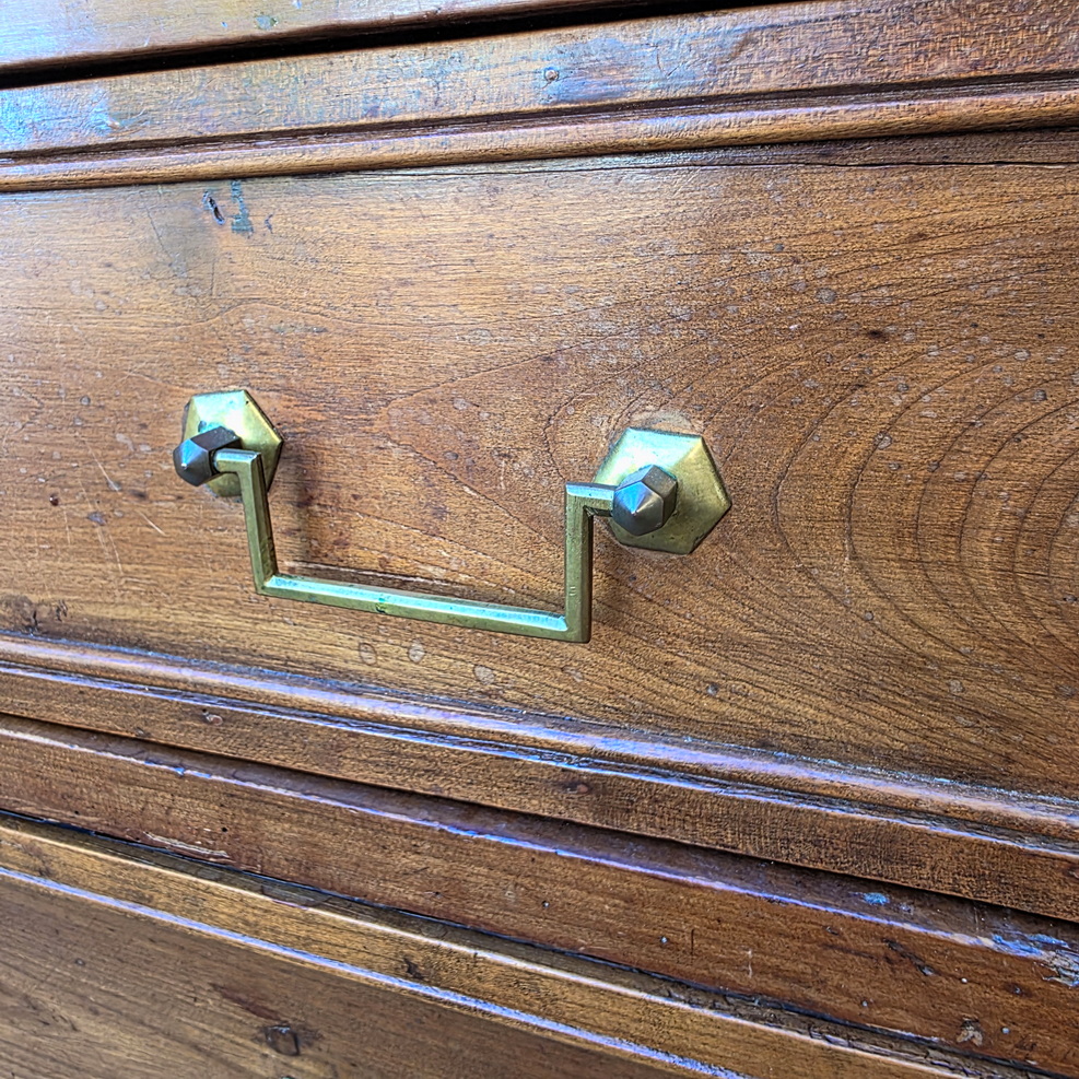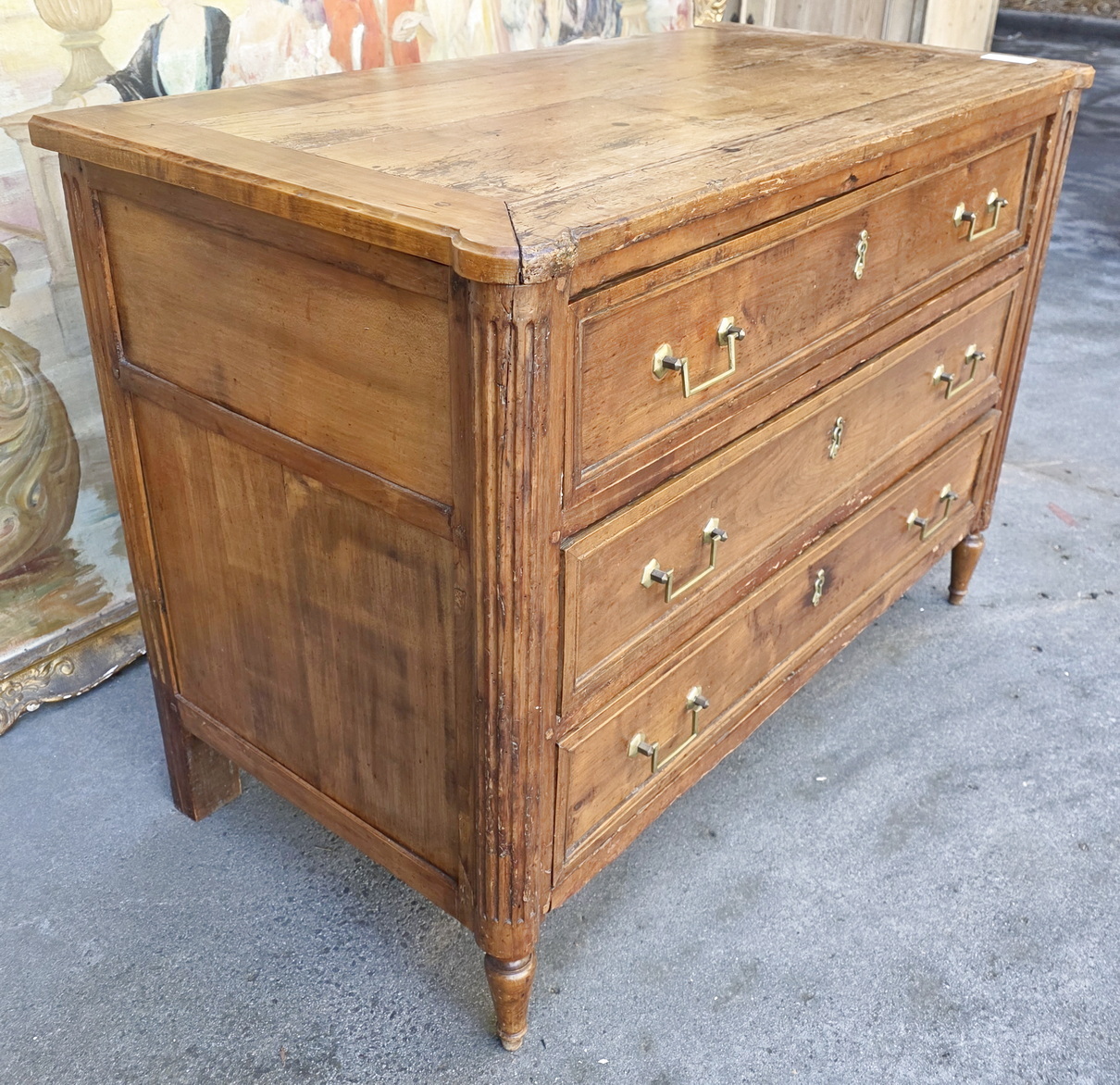 An elegant and understated French Louis XVI period, faded solid cherrywood commode of three drawers of simple, Neoclassical design, the timbers very nicely burnished over time, retaining its original gilt brass ring handles and escutcheons. Please note the elegance of this commode, standing on finely turned 'Jacob' style legs. Area of Isle de France (Greater Paris), circa 1780.