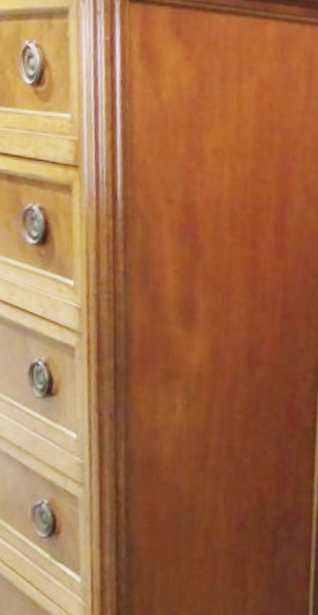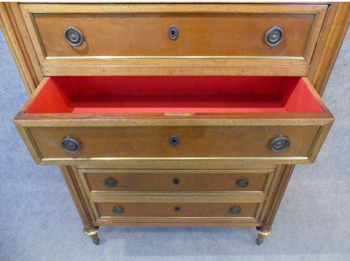 An early 20th century French Louis XVI style faded mahogany gilt bronze mounted 'Semainier' tallboy chest of seven drawers, of very good proportions. Flanked by fluted pilasters, each of the drawers decorated with gilt brass mouldings and is fitted with ring handles and oval escutcheons. Retaining its original, shaped marble top. Paris, circa 1930.