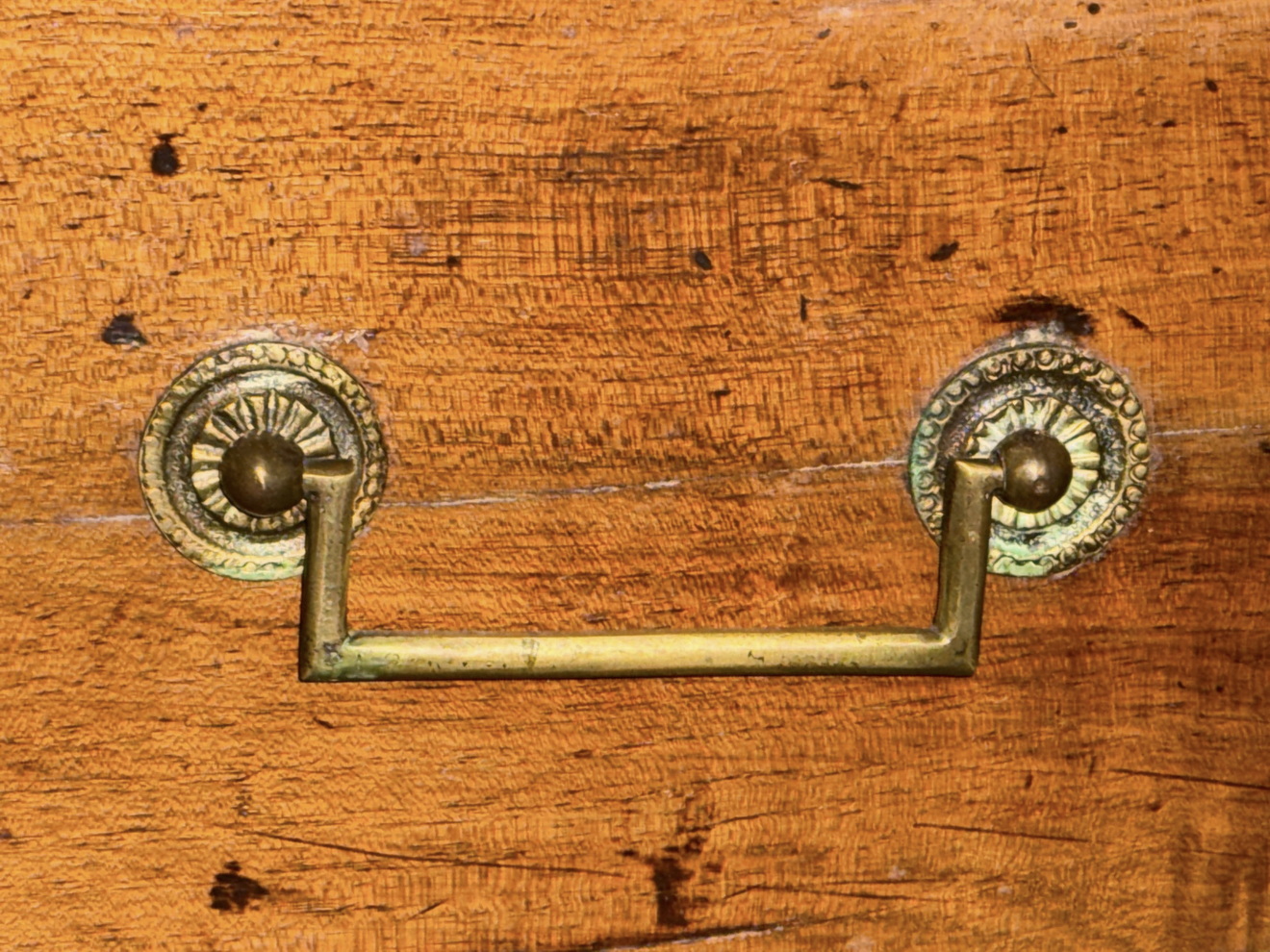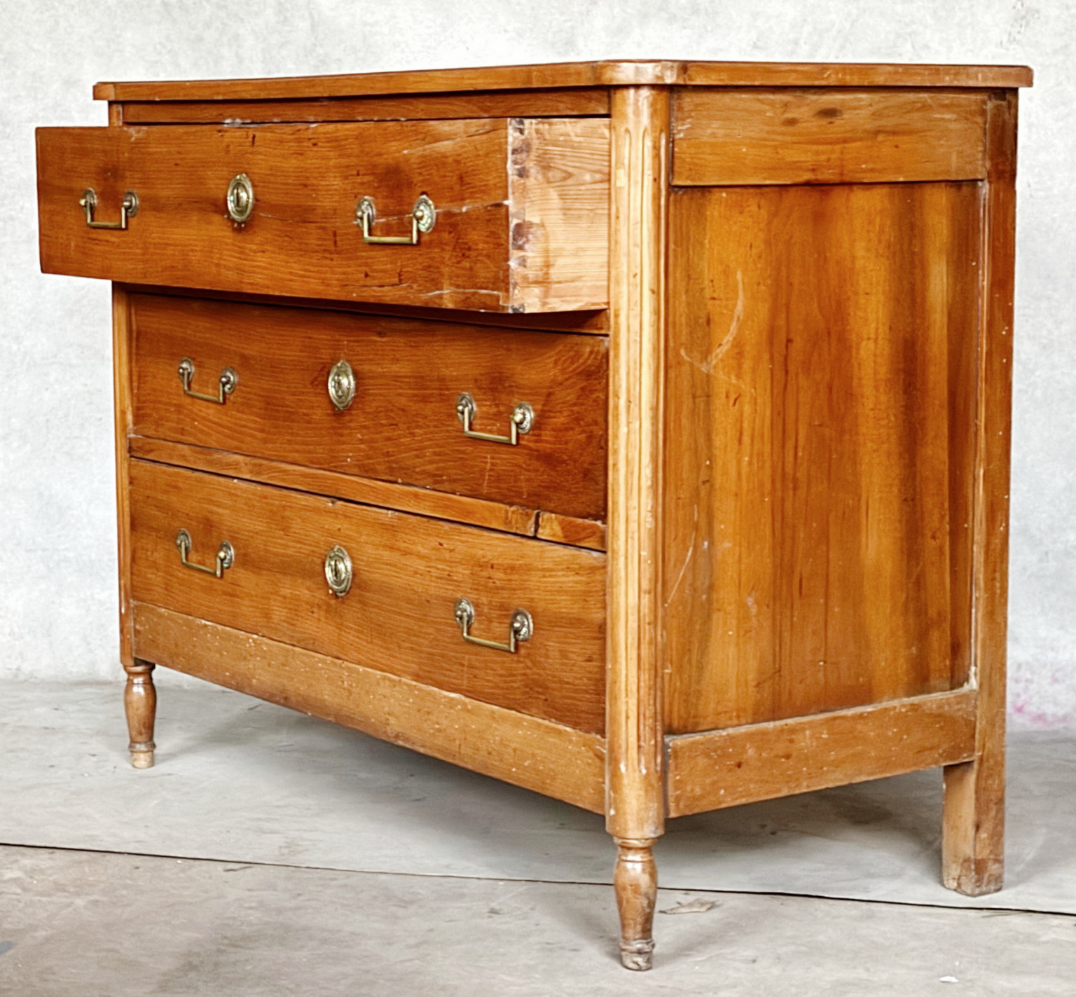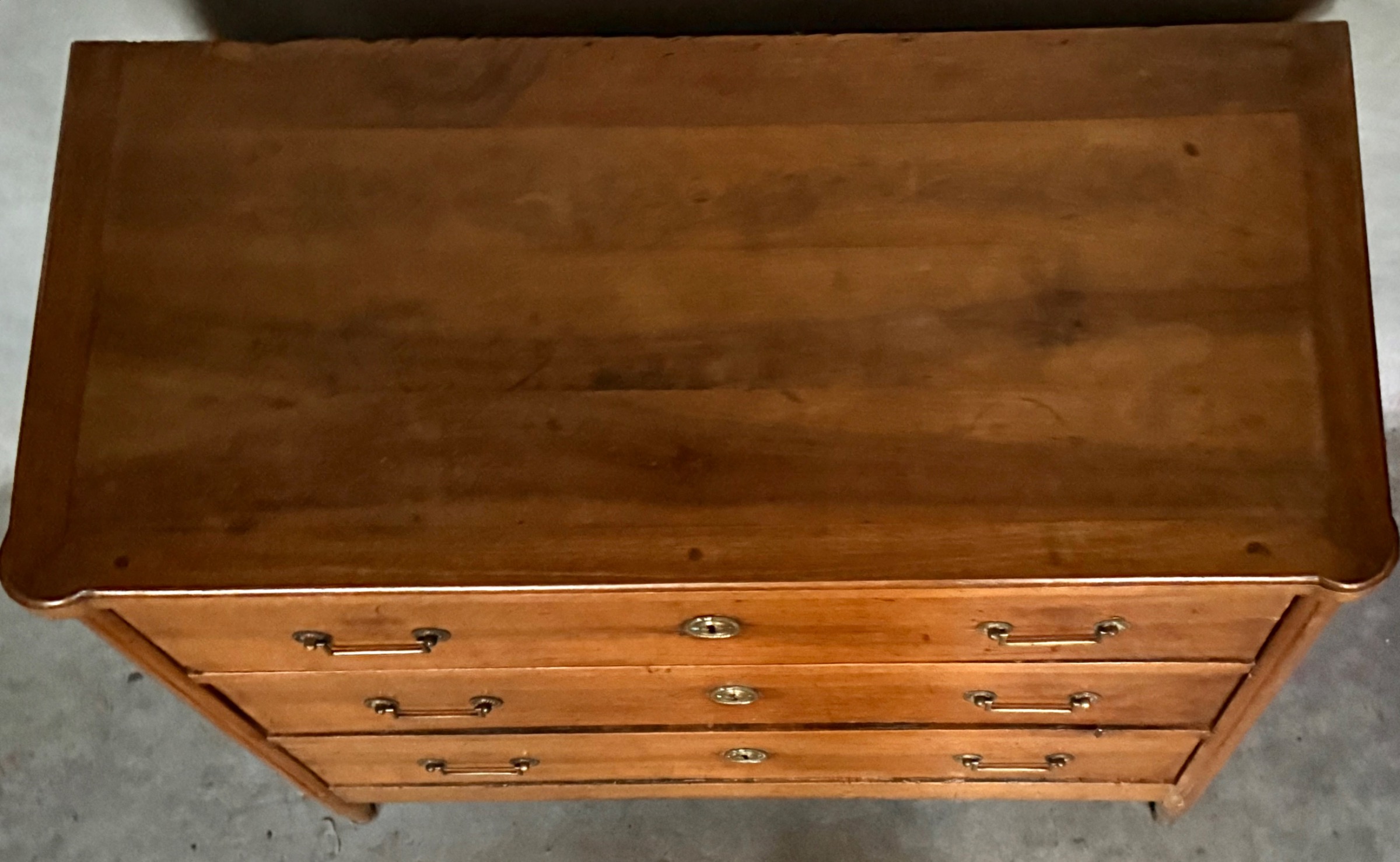 An early 19th century French provincial, solid walnut three-drawer commode of wonderfully shallow proportions, the walnut timbers well burnished and retaining the original patina. Standing on 'Jacob' design turned feet. Please note the restrained elegance of Neoclassical handles and escutcheons. Area of Greater Paris, circa 1840.