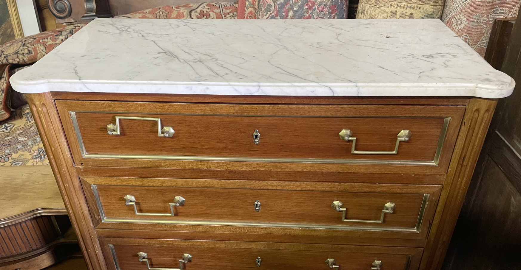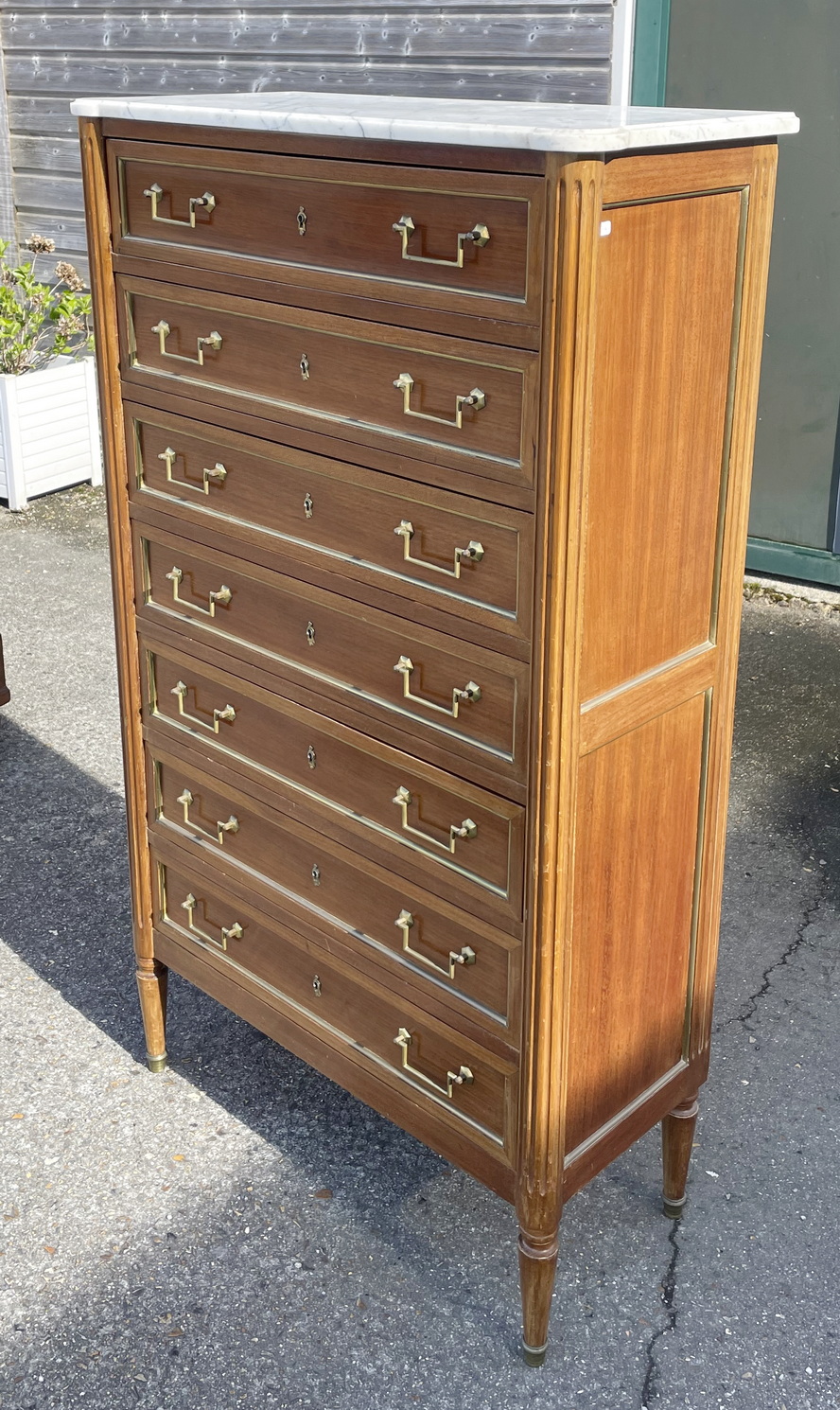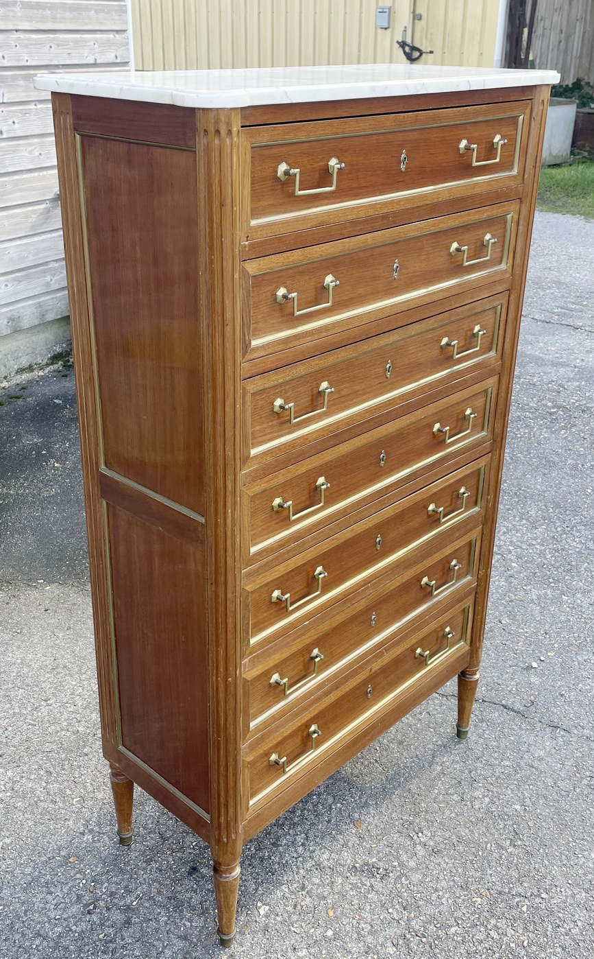 An early 20th century French Louis XVI style faded mahogany gilt brass mounted 'Semainier' tallboy chest of seven drawers, of excellent Neoclassical proportions. Flanked by fluted pilasters, each of the drawers is decorated with gilt brass mouldings and is fitted with its original handles and escutcheons. Retaining its original, shaped and moulded Carrara marble top. Paris, circa 1930. Please note: this item is due in Melbourne in mid 2026.