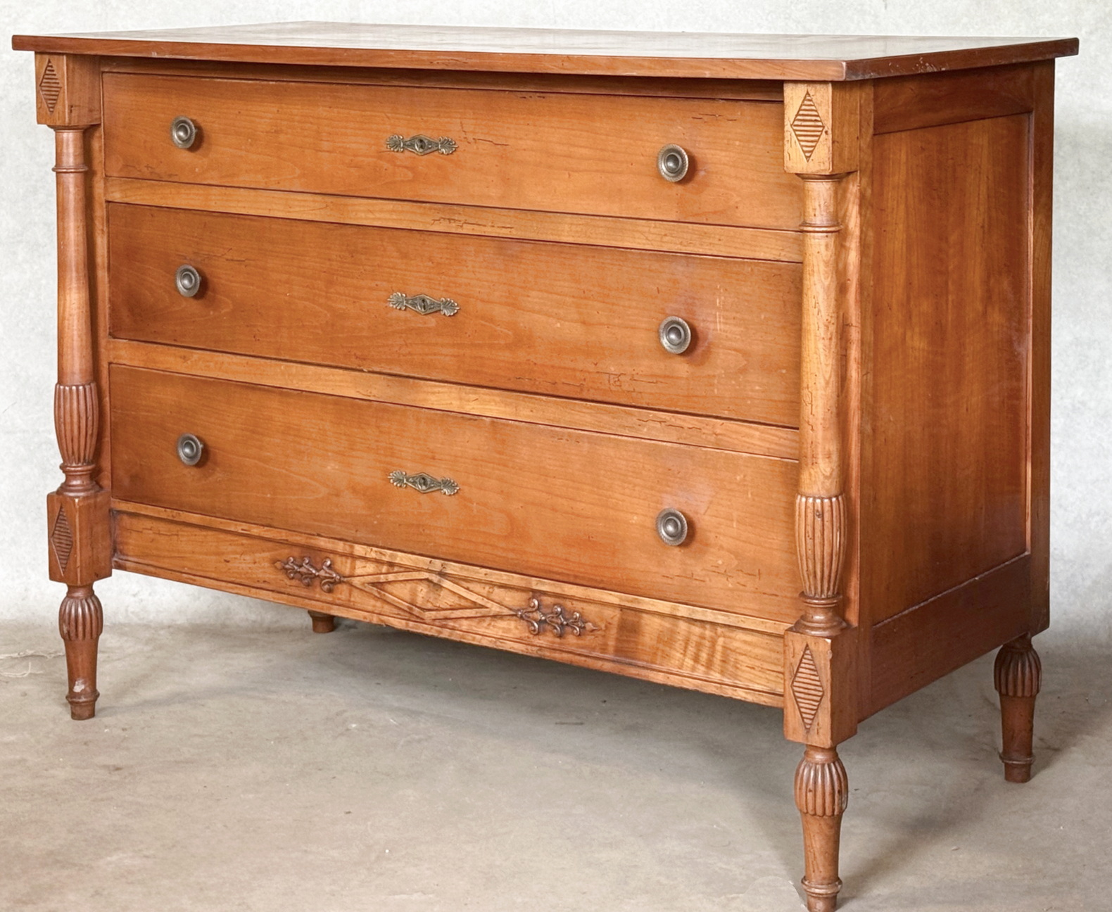 A French Directoire style commode of three drawers, of Neoclassical design and decorated with 'Jacob' style pilasters and legs (Georges Jacob, Paris 1739 – 1814), the bottom rail decorated with a haut relief carved frieze. The surfaces of the solid cherrywood timbers have faded nicely over time. Area of Isle de France, circa 1900.