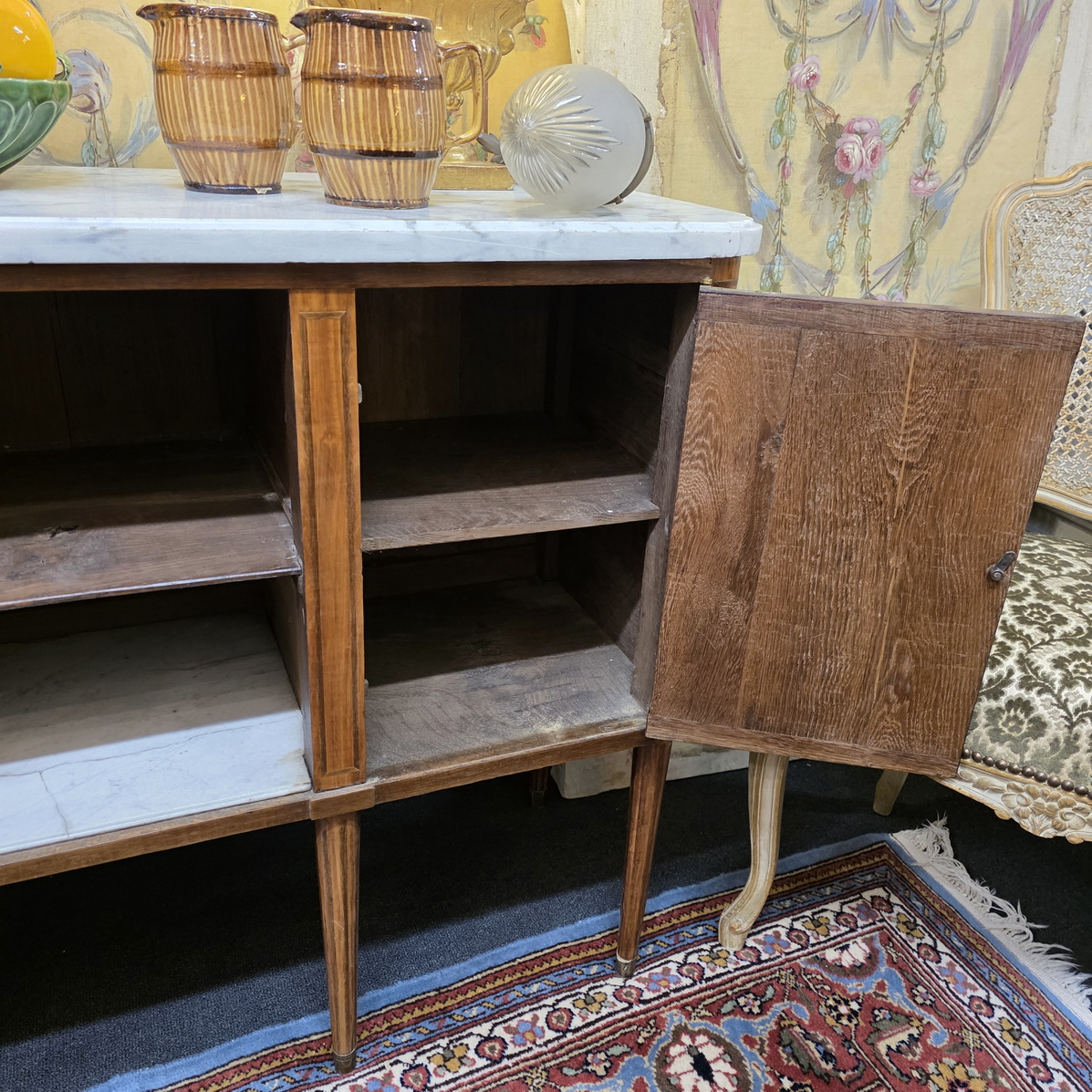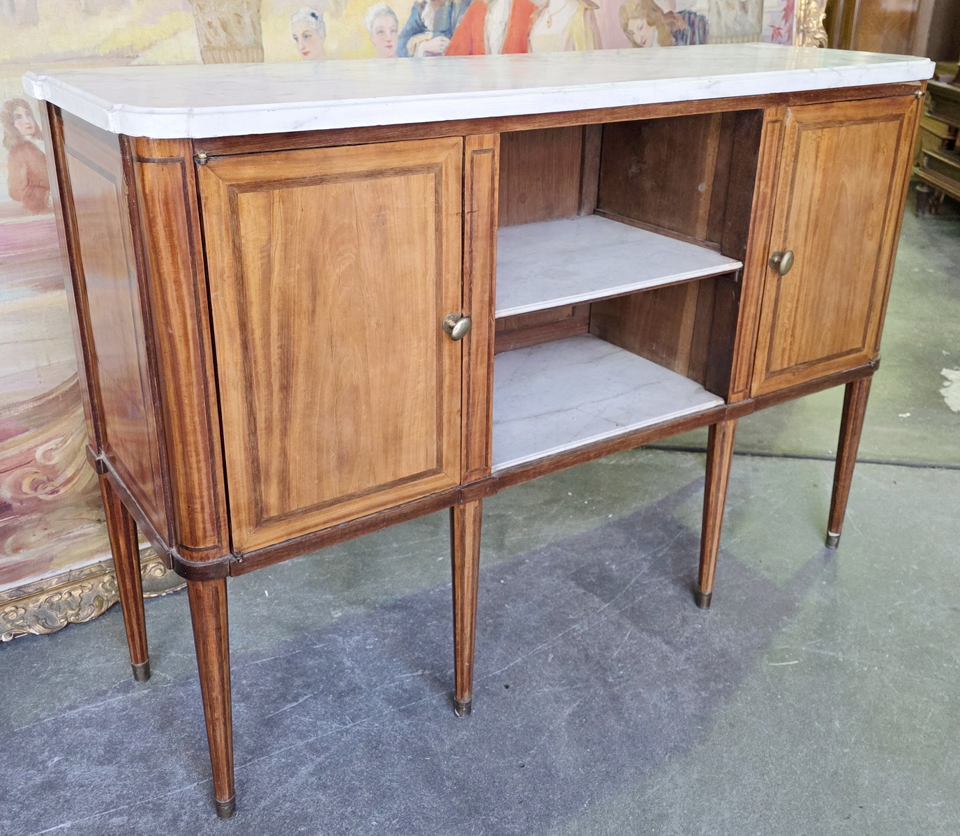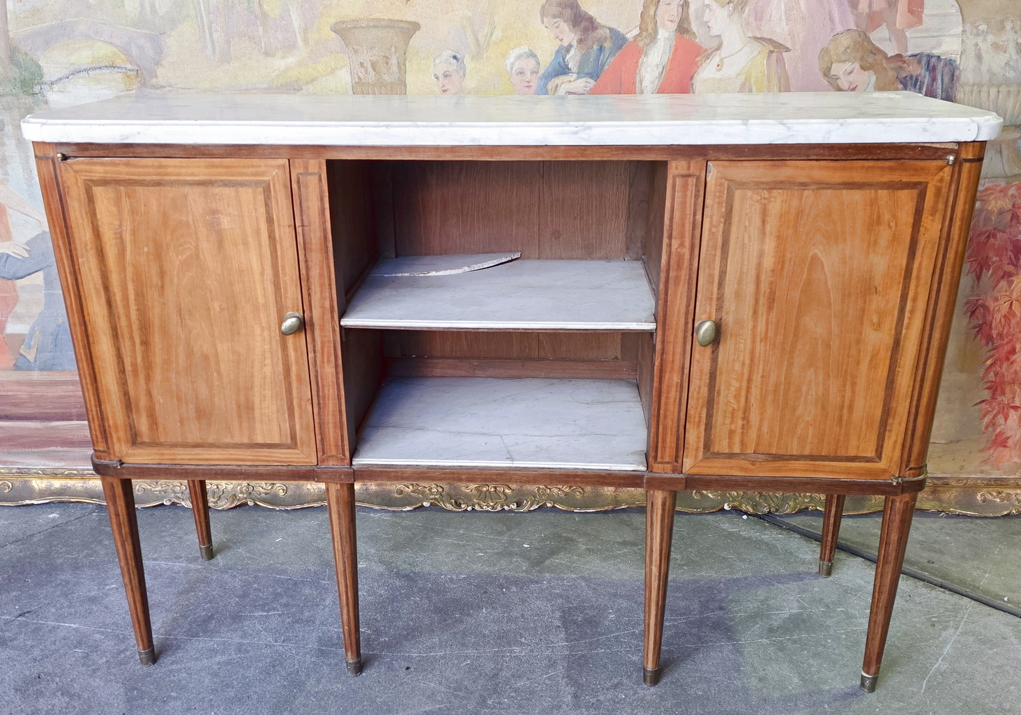 A French Louis XVI period, mahogany and rosewood inlaid 'Buffet d’Enfilade' fitted with two doors and with central, open shelves, of fine Neoclassical elegance. Retaining its original, shaped Carrara marble top. Internally fitted with shelves. The central shelves are fitted with Carrara marble inserts. Please note: the shallow depth of this buffet makes it suitable for use as a console or an entrance hall table. Area of Paris, circa 1780.