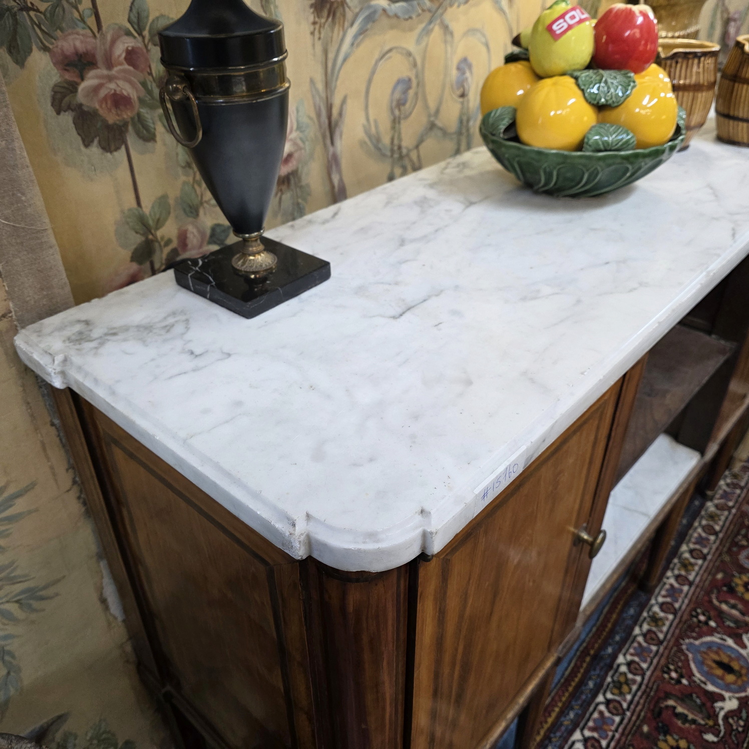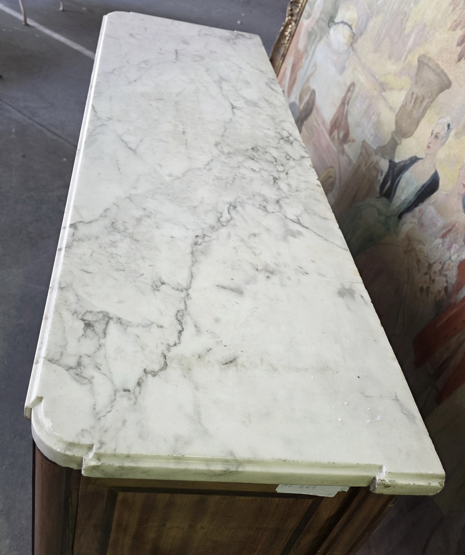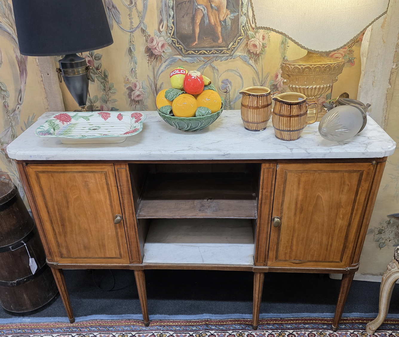 A French Louis XVI period, mahogany and rosewood inlaid 'Buffet d’Enfilade' fitted with two doors and with central, open shelves, of fine Neoclassical elegance. Retaining its original, shaped Carrara marble top. Internally fitted with shelves. The central shelves are fitted with Carrara marble inserts. Please note: the shallow depth of this buffet makes it suitable for use as a console or an entrance hall table. Area of Paris, circa 1780.
