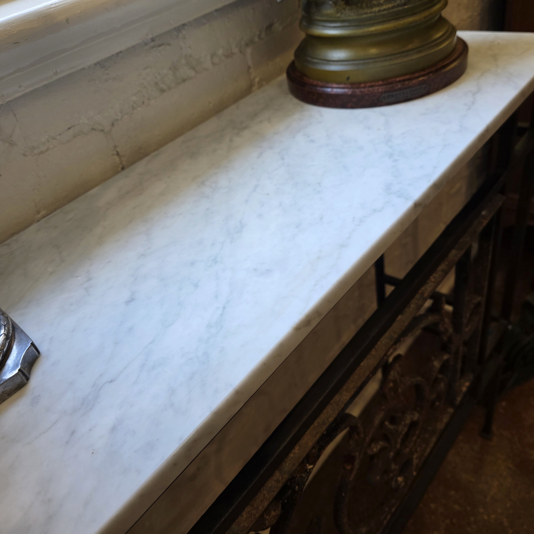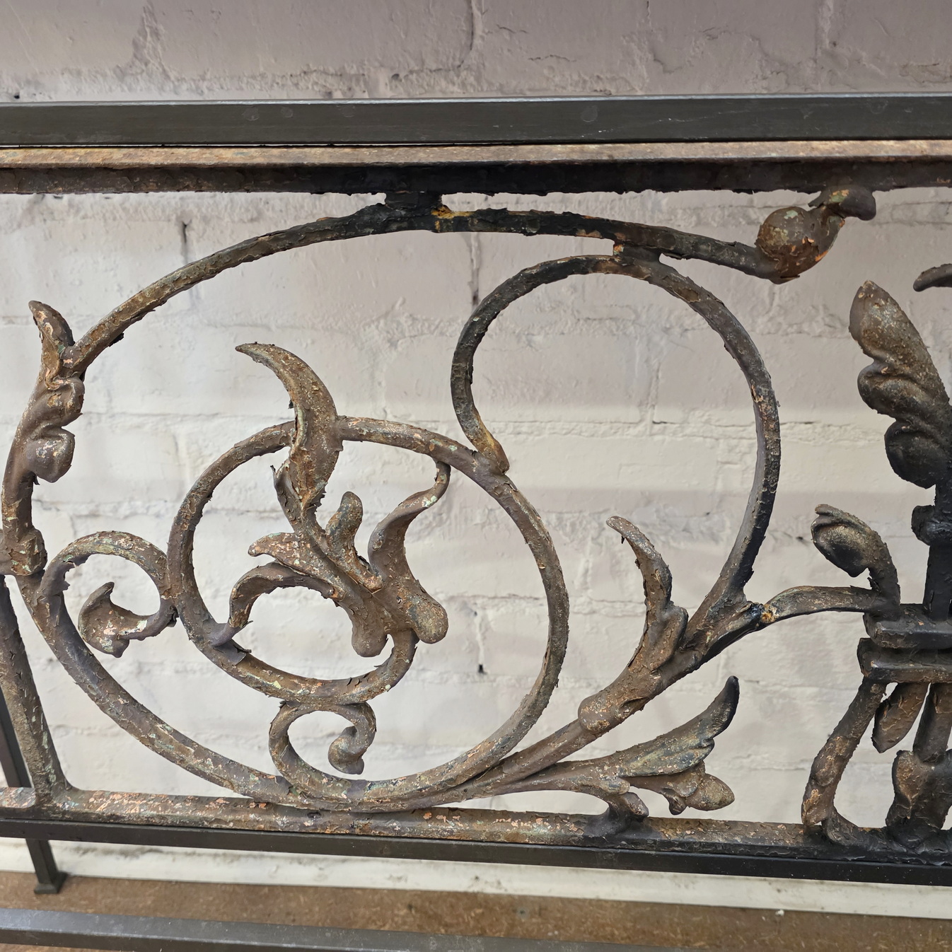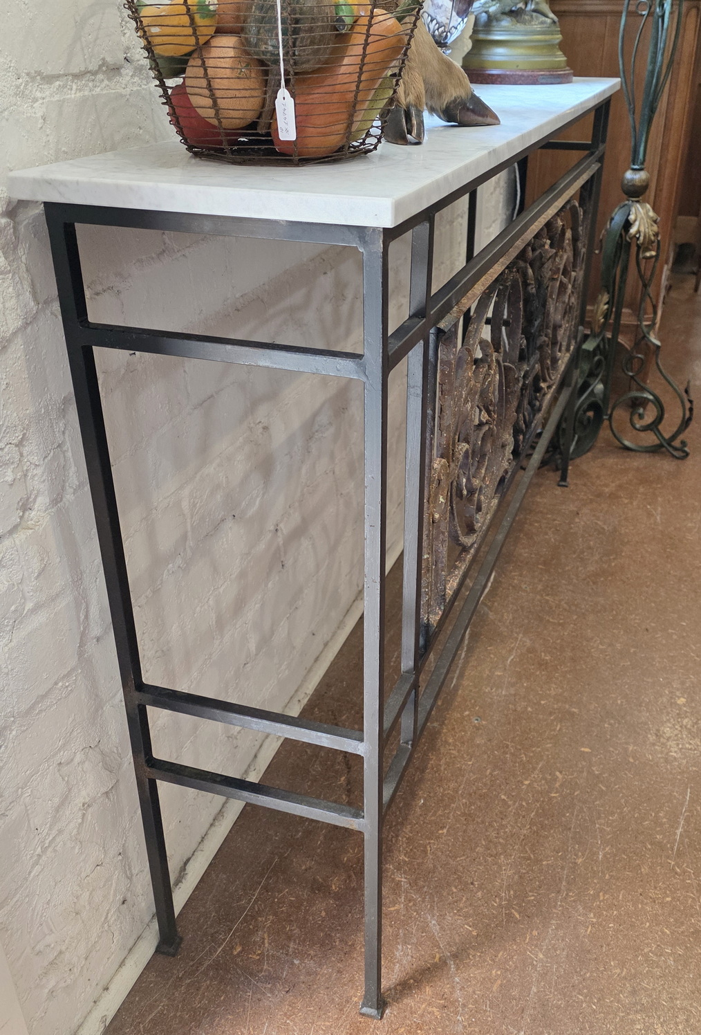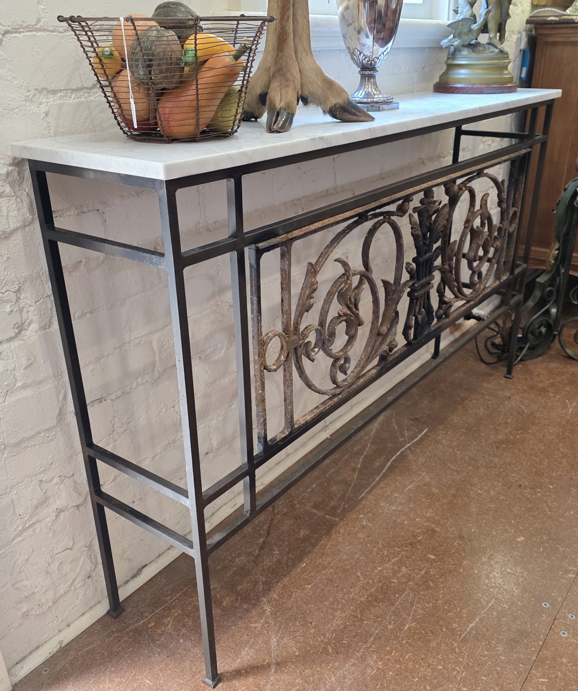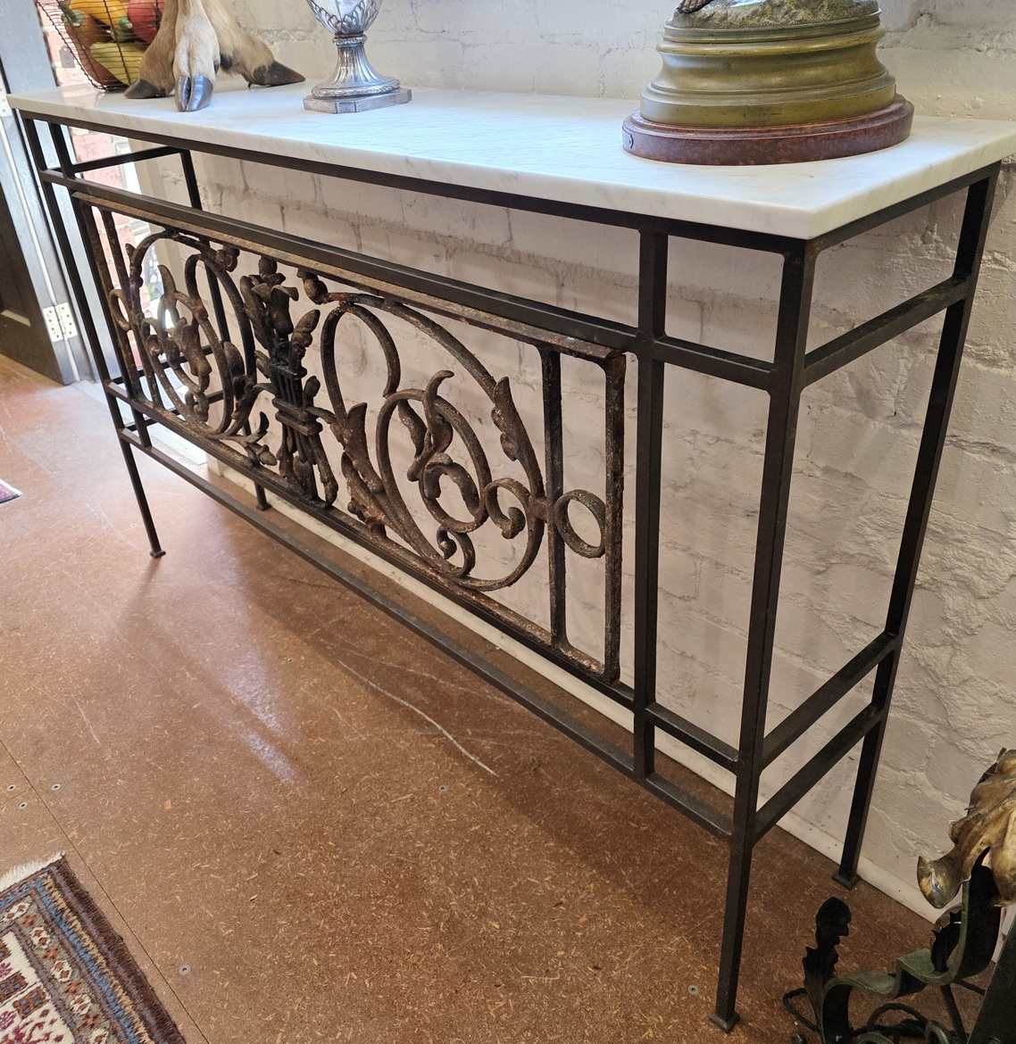 A long and particularly narrow Console or Hallway table made from a 19th century French Napoleon III period cast iron balcony grille, decorated with large, stylised foliate scrollwork motifs. The antique balcony grille is incorporated into a solid wrought iron frame, purpose-made for it. Fitted with a square edge Carrara marble top that has been honed, not polished.