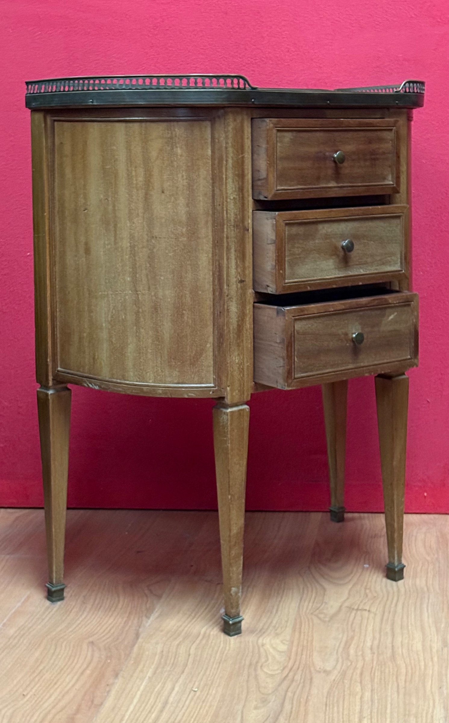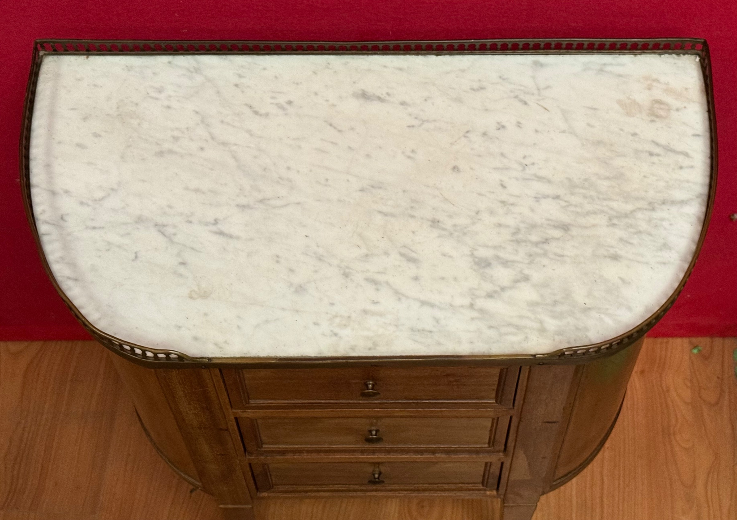 An early 20th century French Louis XVI style, mahogany and gilt brass mounted demi-lune commode of good Neoclassical proportions and of shallow depth. Fitted with three drawers, the flanks curved and panelled. Retaining the original shaped and moulded Carrara marble top framed by a raised and fretted gilt brass gallery. Retaining the original brass drawer pulls. Please note: this commode can make an excellent entrance hall /console table. Area of Paris, circa 1930.