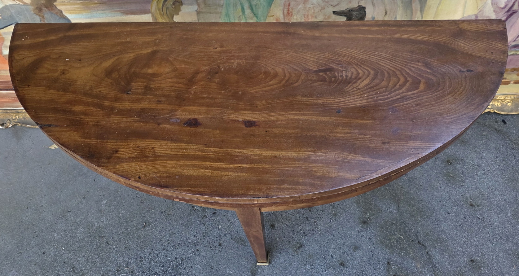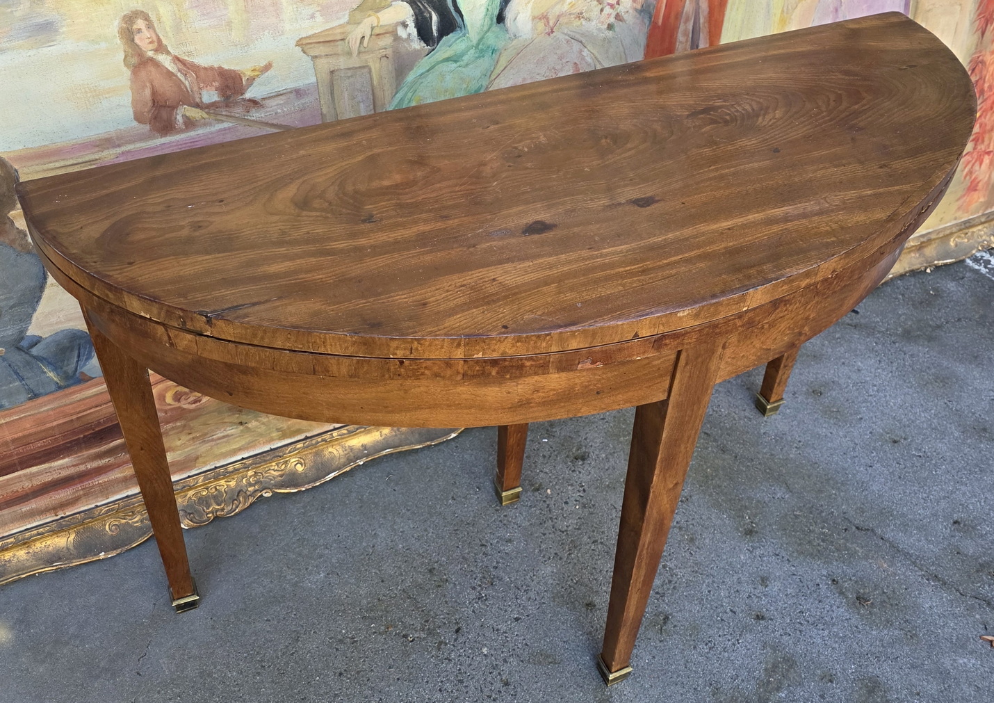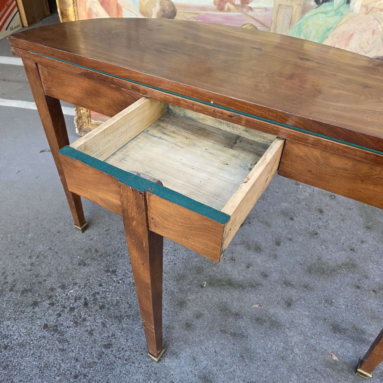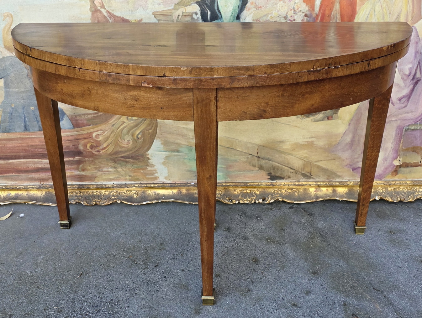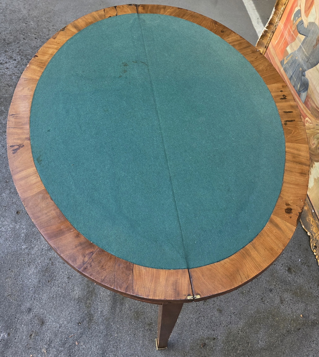 A 19th century French Napoleon III period, Louis XVI style, nicely faded flame mahogany demilune card table, standing on tapering legs with brass caps, the hinged top opening to reveal an oval card-playing surface with cross-banded edges, fitted with an old baize fabric. When closed, this card table turns into a shallow-depth console table. Area of Paris, circa 1870.