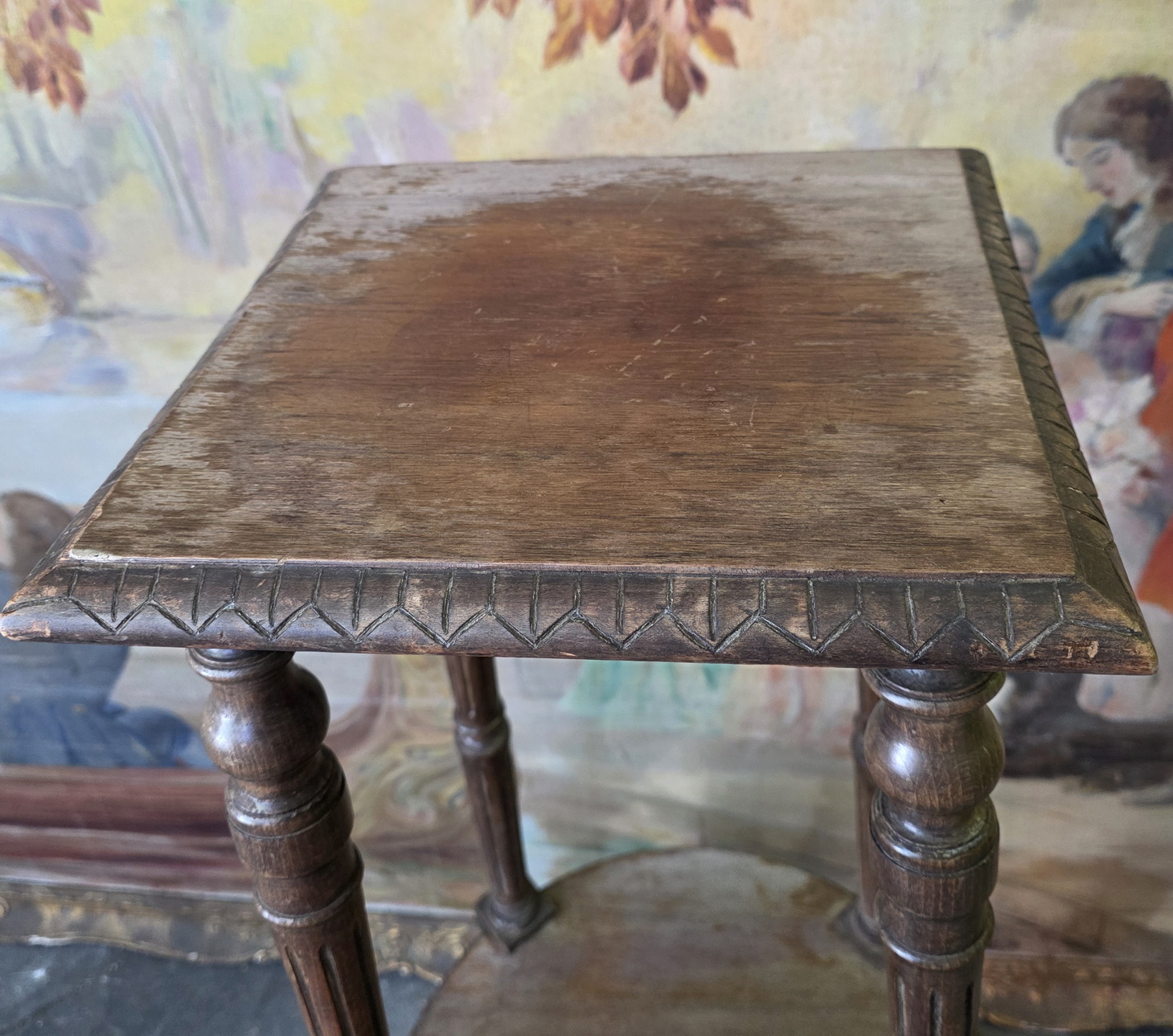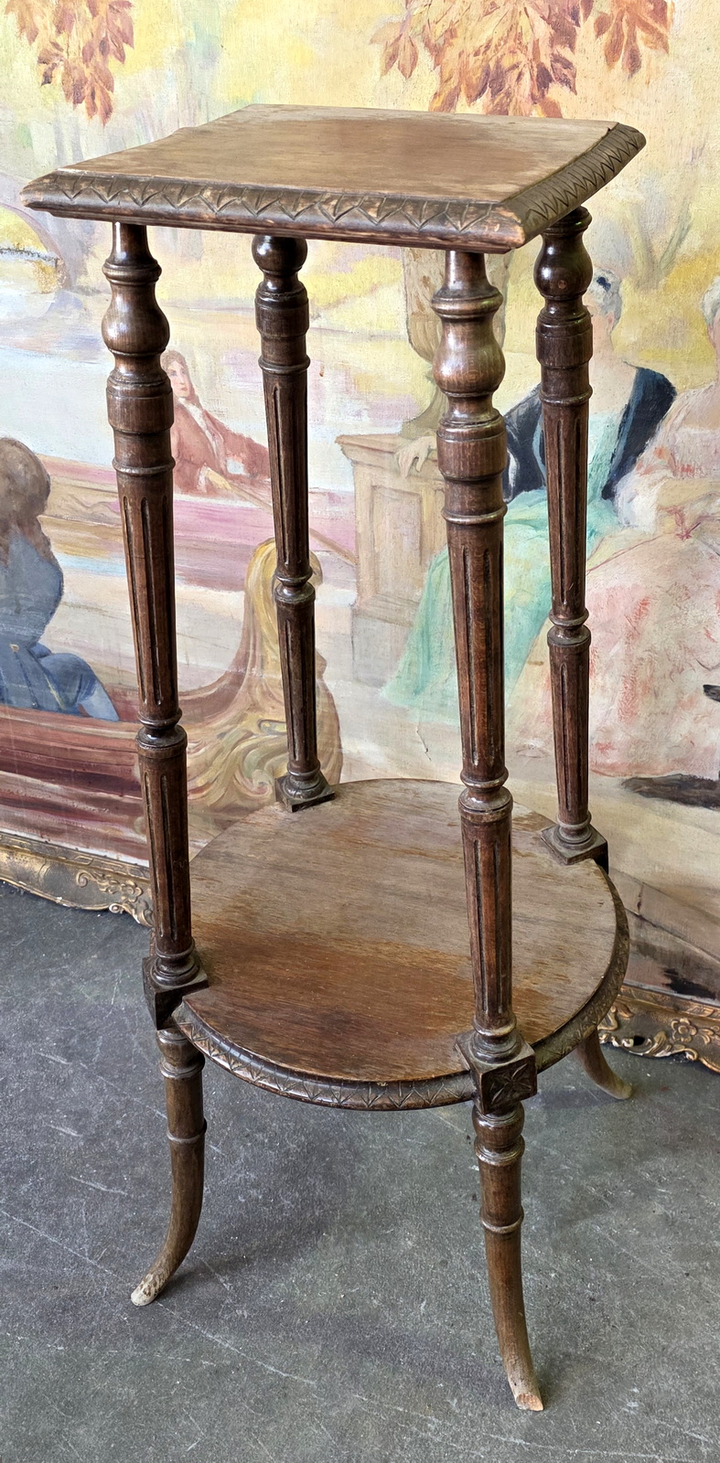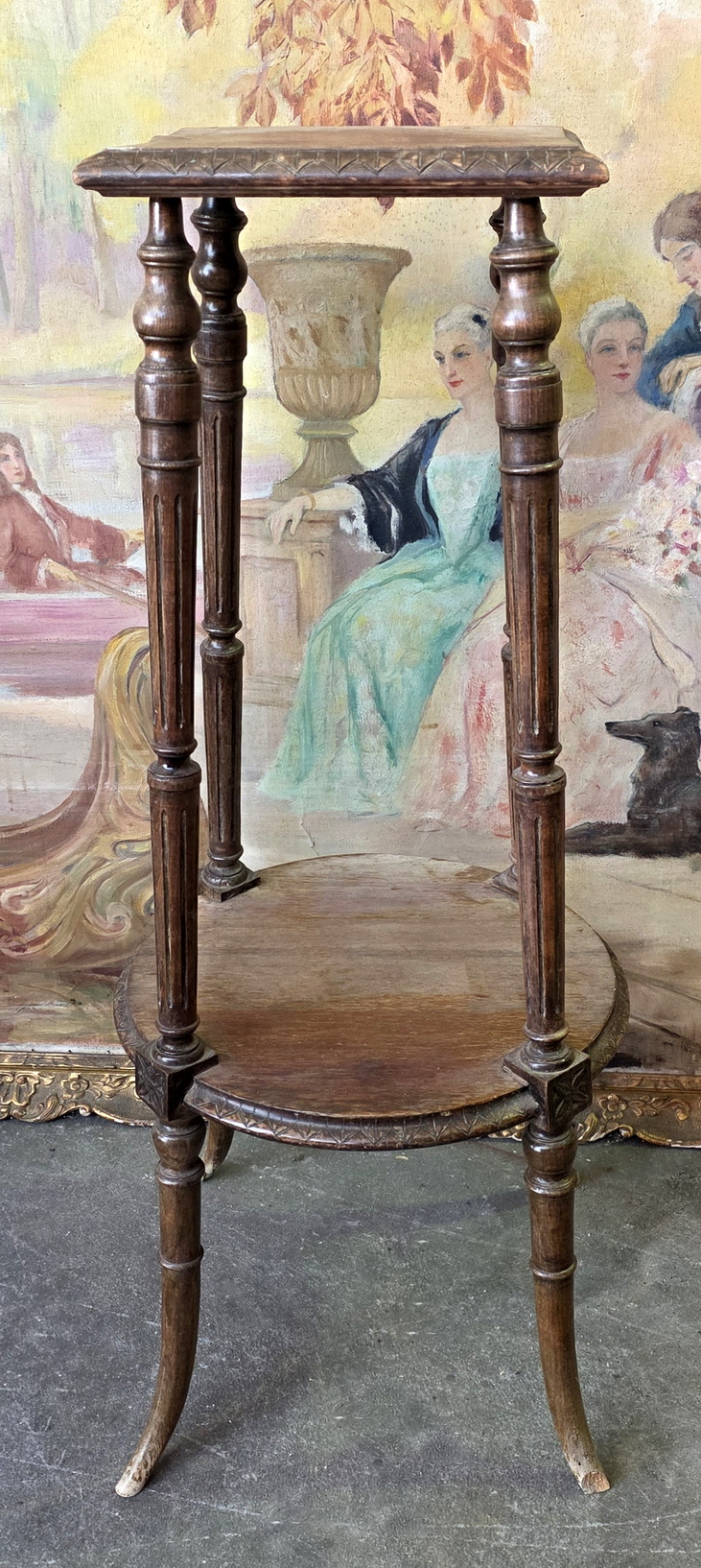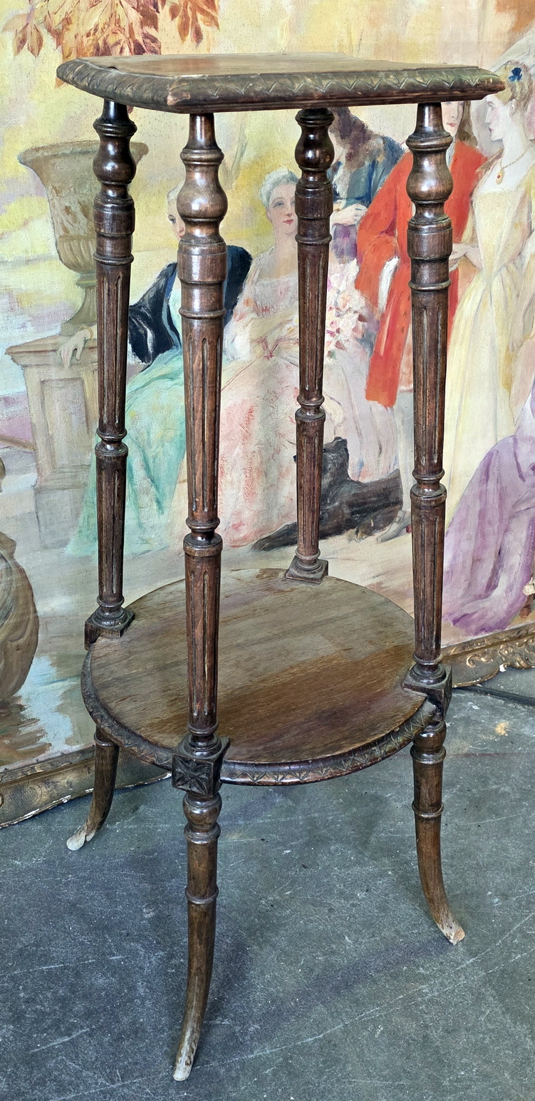 A 19th century French Napoleon III period carved 'Sellette', a stand for displaying vases, busts and statuettes, standing on four turned, fluted and shaped legs supporting a circular shelf. Area of Paris, circa 1870.