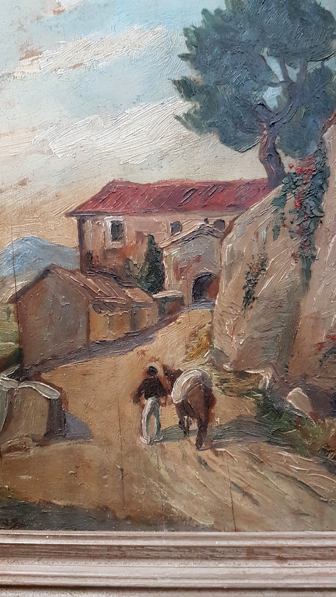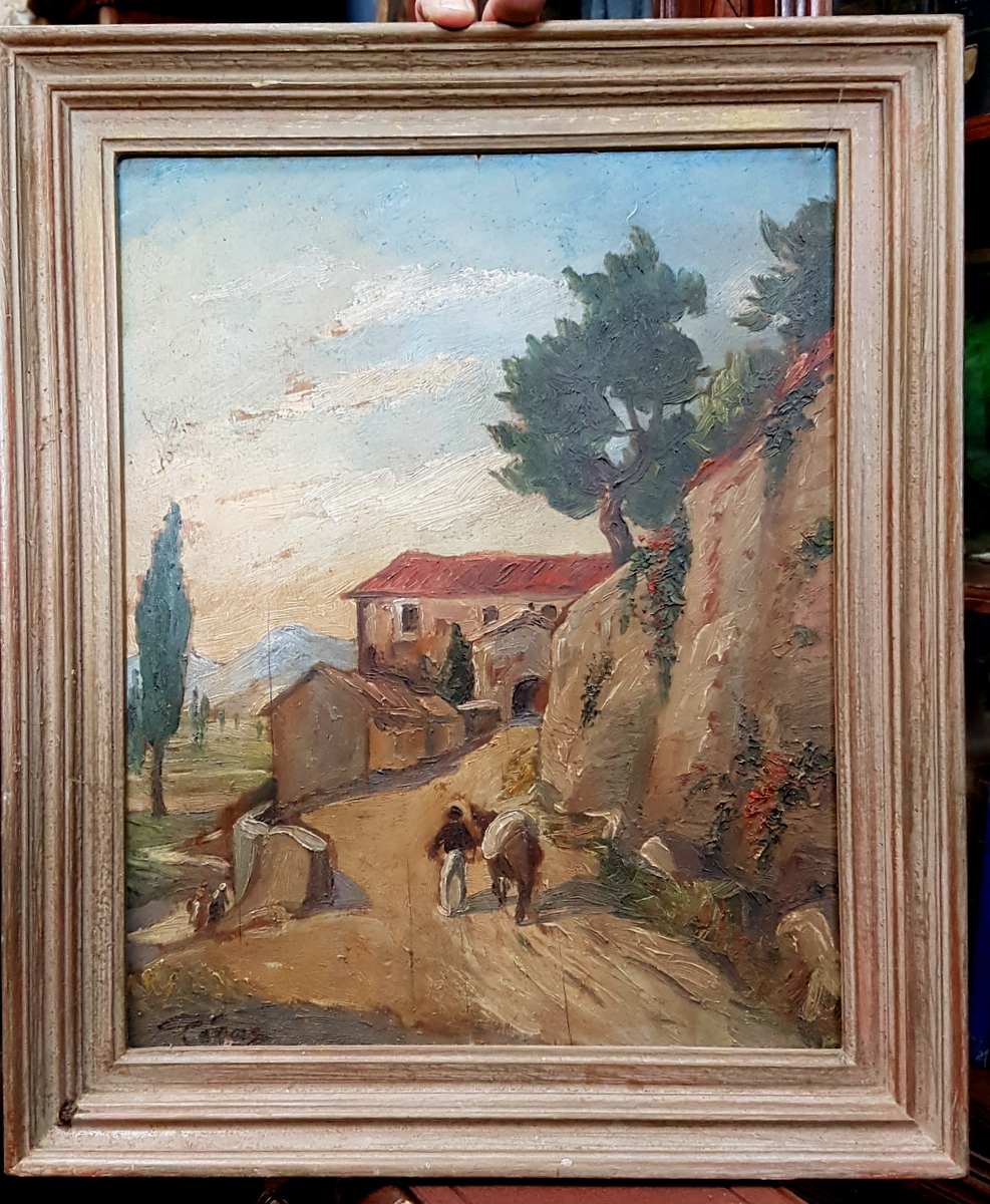 A French oil-on-board landscape painting depicting figures on a country road, against a background of a rural village. Note the excellent quality brush-work. France, early 20th century.
