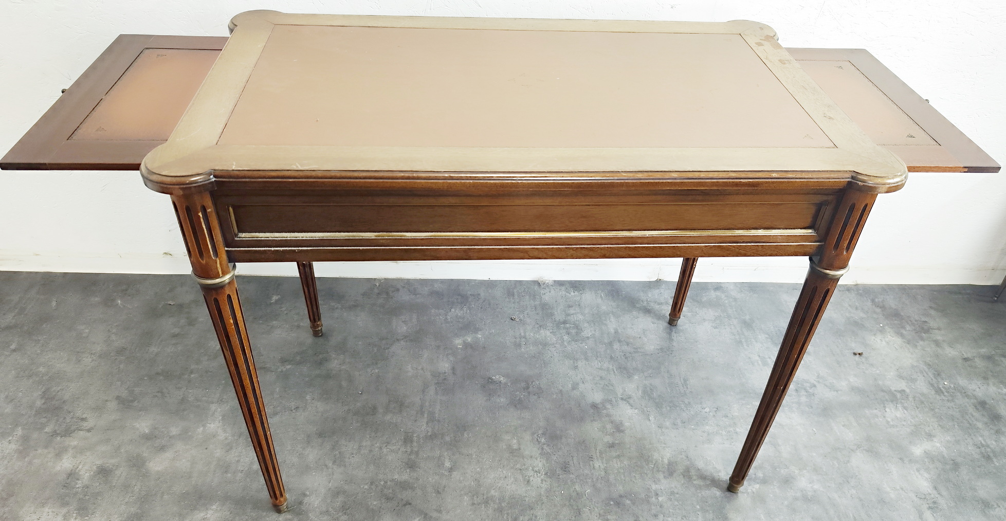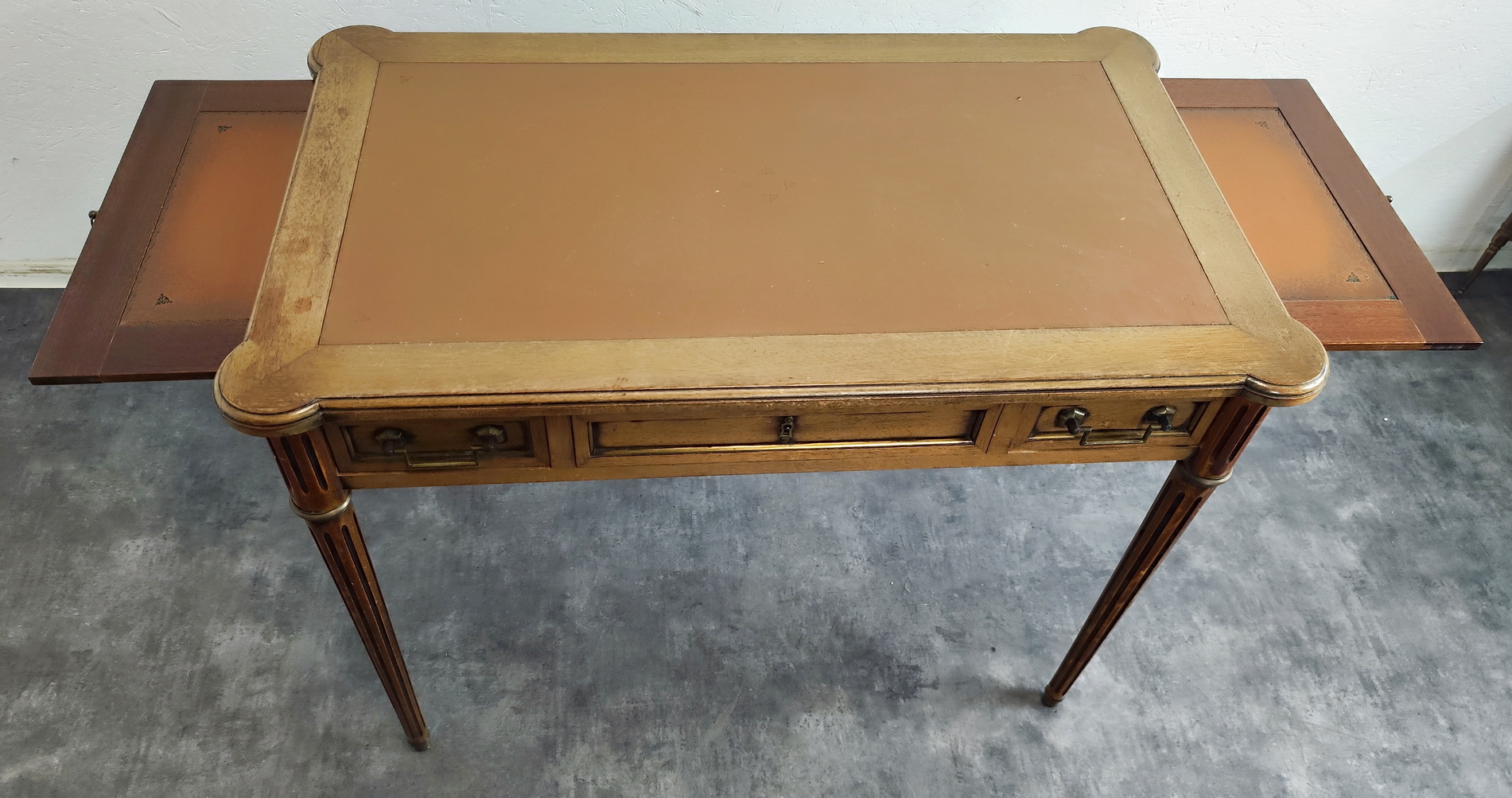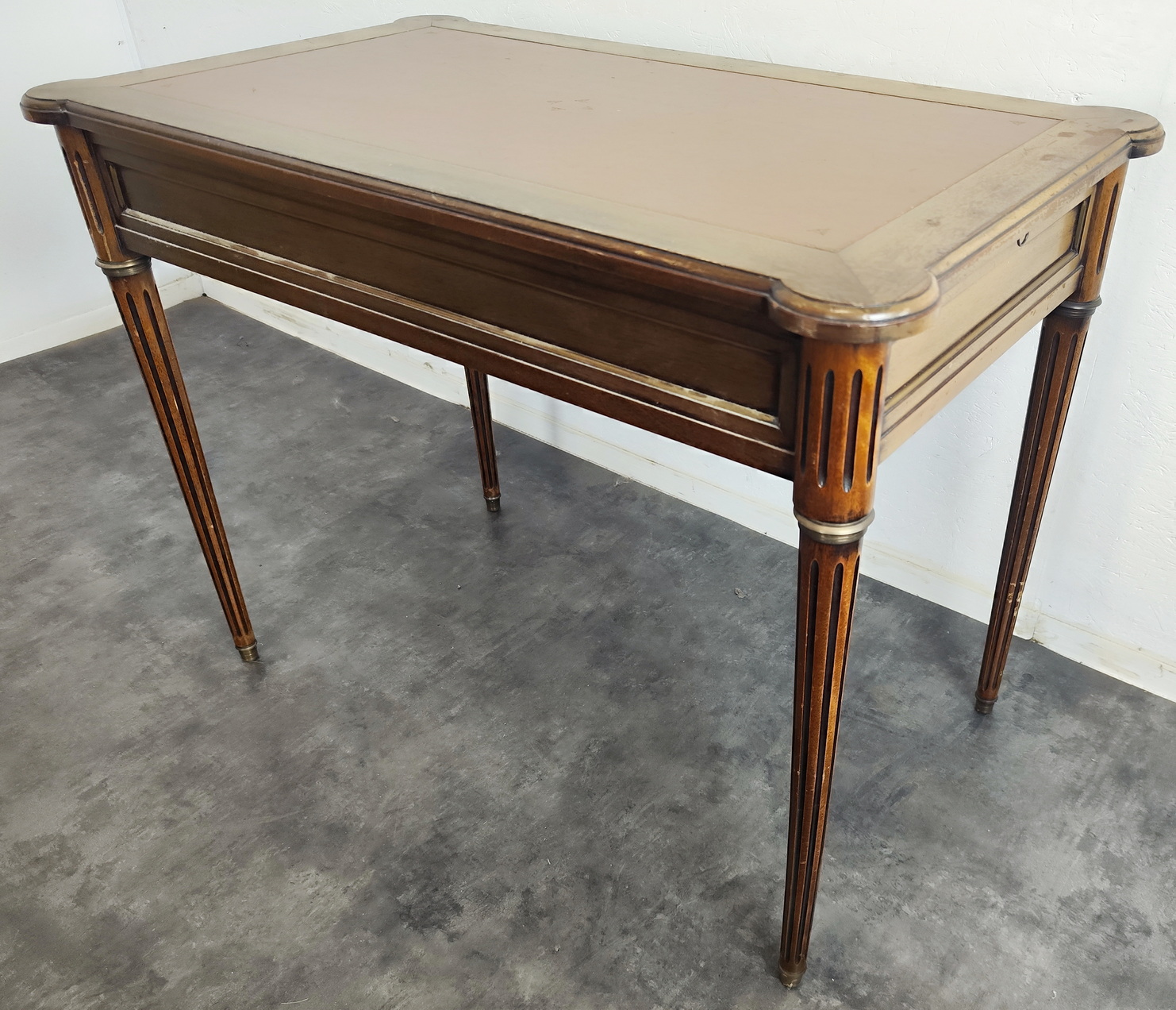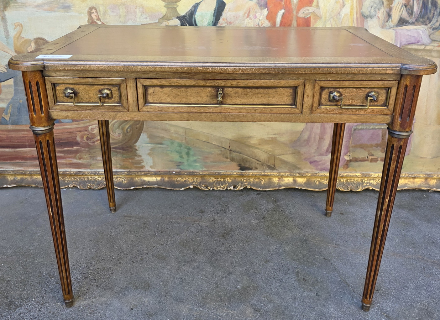 A small and fine, French Louis XVI style, mahogany and gilt brass-mounted 'bureau plat' desk of NeoClassical proportions and of simple design, the front fitted with three shallow drawers. The top and the pull-out extensions are fitted with leather. The desk's decorations are restrained and masculine in character, with typical French Neoclassical escutcheons and gilt brass mouldings around the drawers. This desk is well-presented on all four sides, so that it can be used in the centre of a room. Area of Paris, circa 1930.