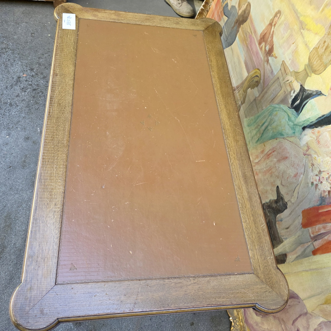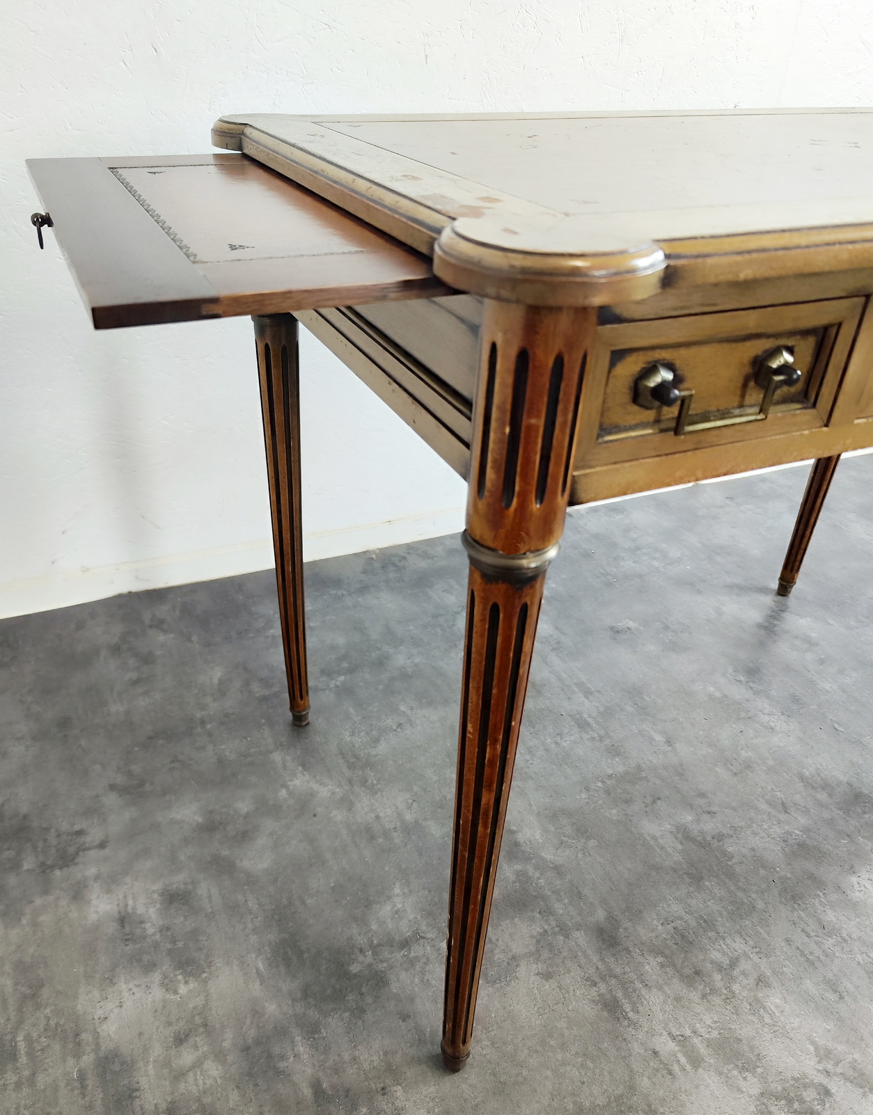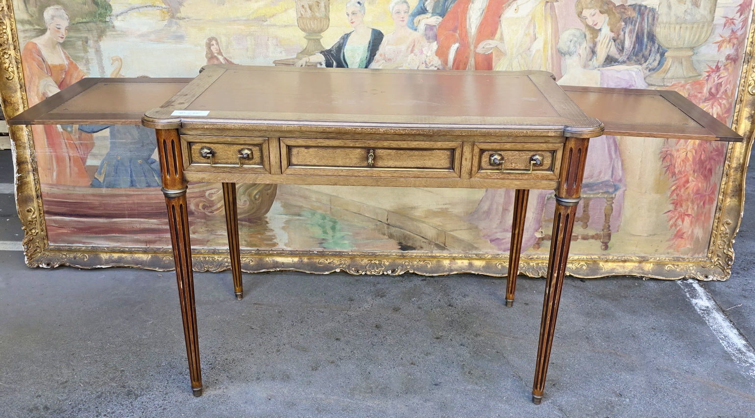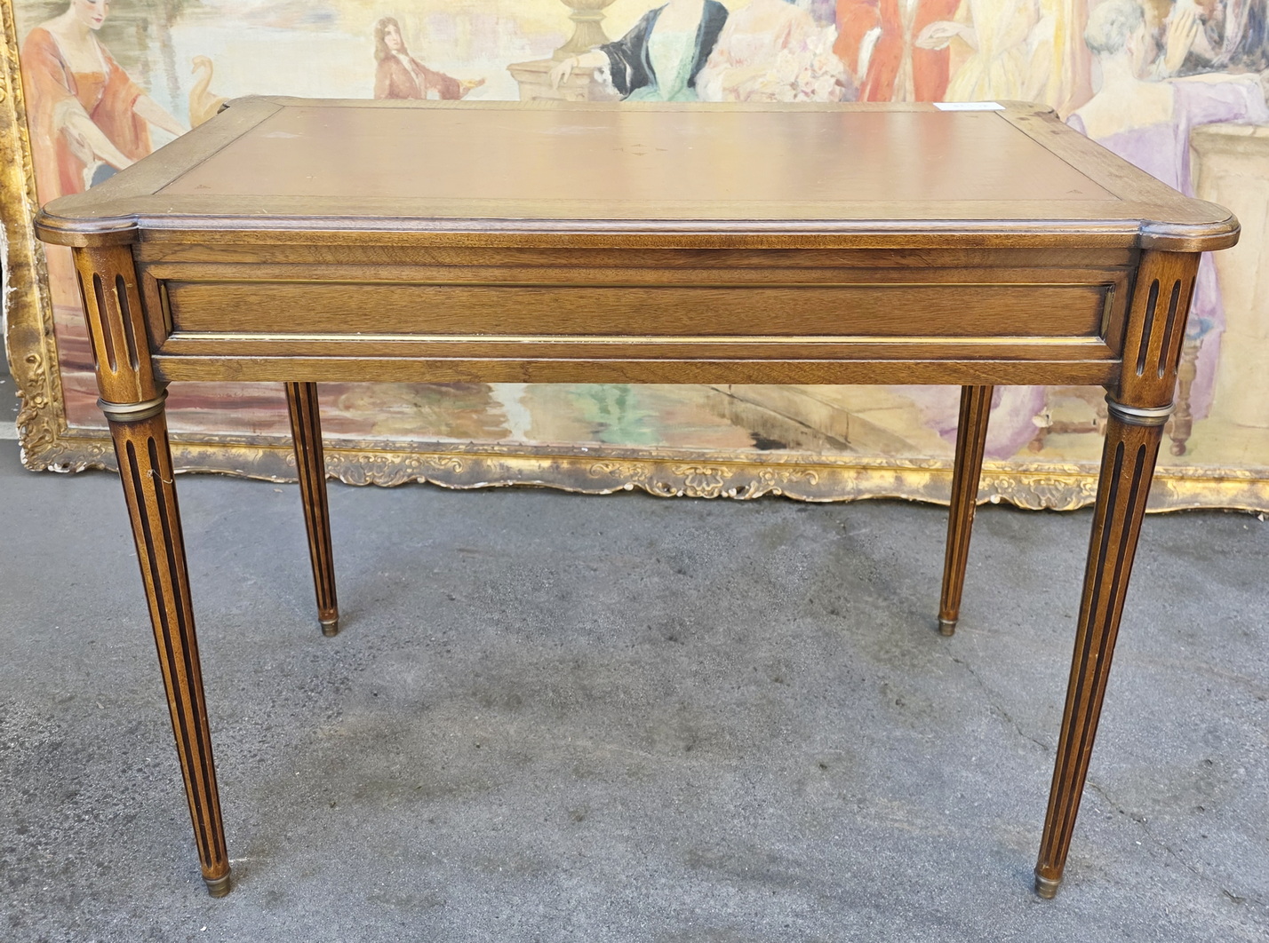 A small and fine, French Louis XVI style, mahogany and gilt brass-mounted 'bureau plat' desk of NeoClassical proportions and of simple design, the front fitted with three shallow drawers. The top and the pull-out extensions are fitted with leather. The desk's decorations are restrained and masculine in character, with typical French Neoclassical escutcheons and gilt brass mouldings around the drawers. This desk is well-presented on all four sides, so that it can be used in the centre of a room. Area of Paris, circa 1930.