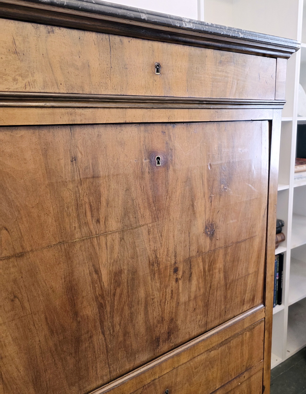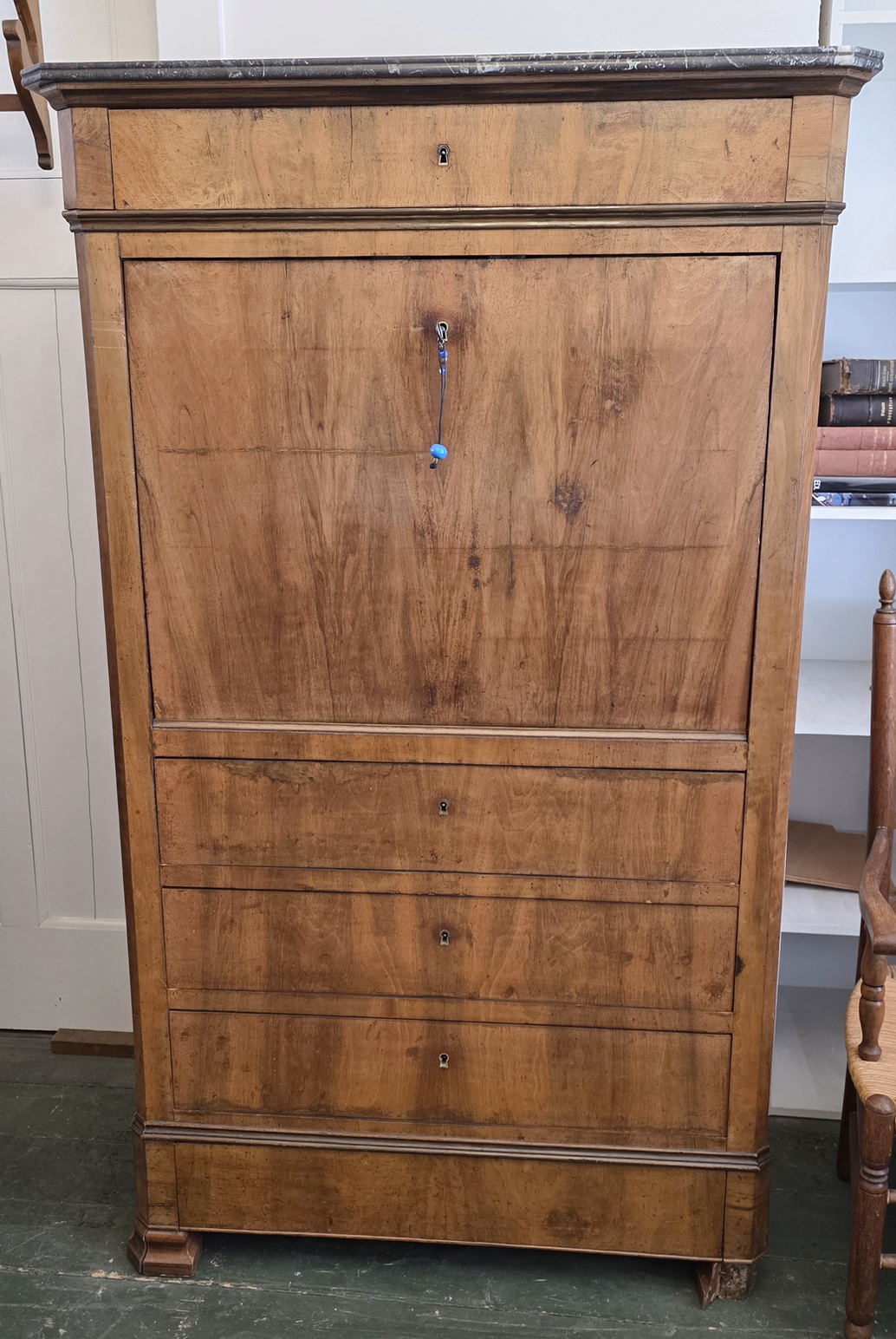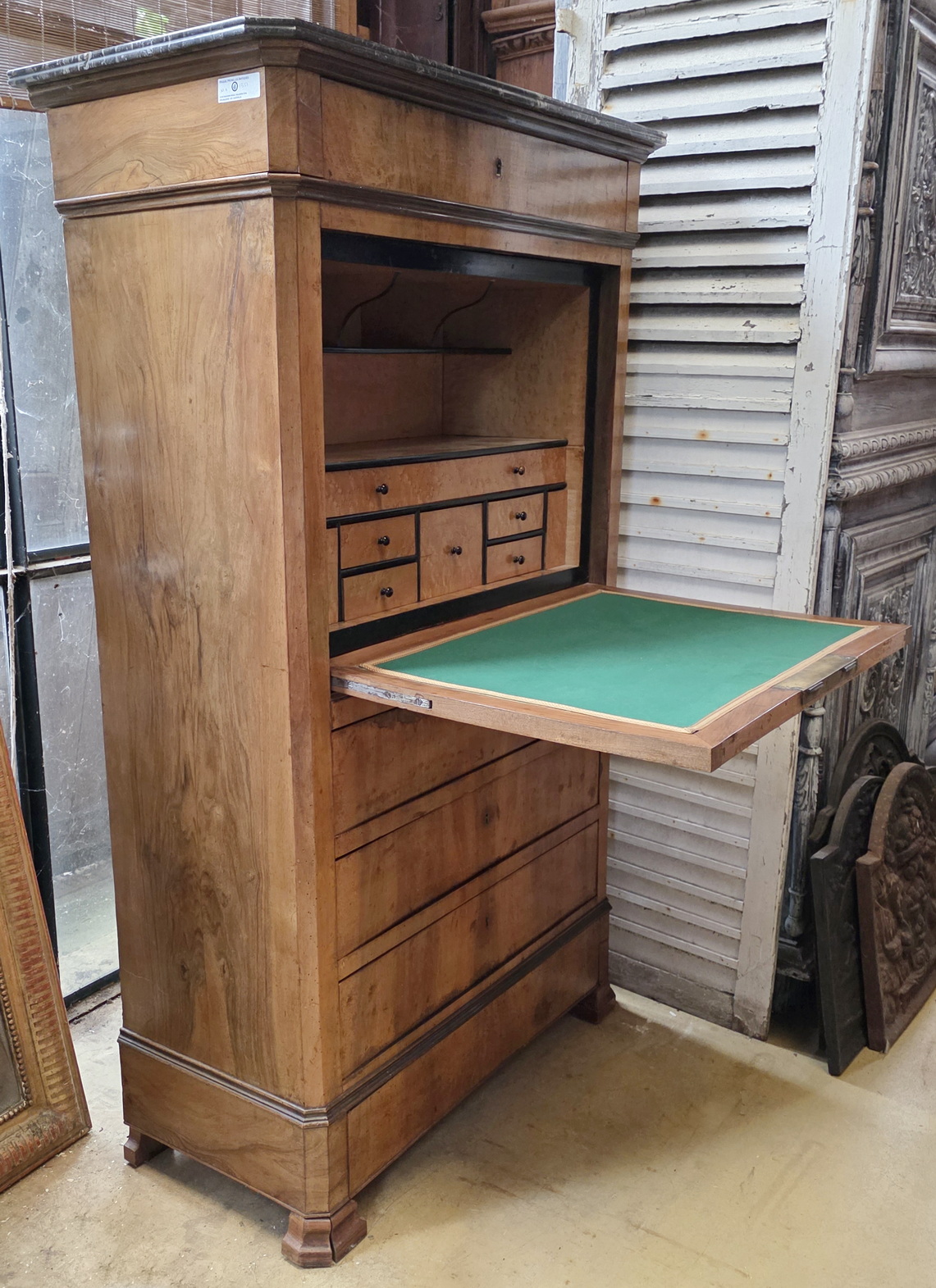 An early 19th century French Louis Philippe period 'Bureau-en-Abattant' fall-front desk, the book-matched walnut with a wonderful, soft patina. The birdseye maple interior is fitted with drawers and with a pigeon holes. Retaining the original 'Gris St Anne' marble top and the original furniture hardware including locks, key and drawer escutcheons. Please note, the interior has two secret compartments that open with loaded spring mechanisms. Area of Paris, circa 1830.