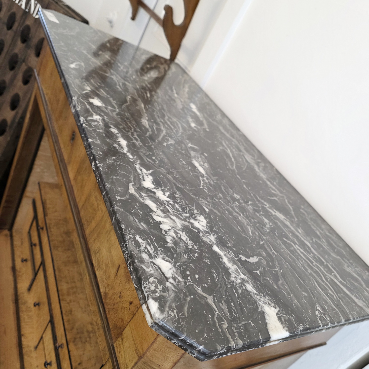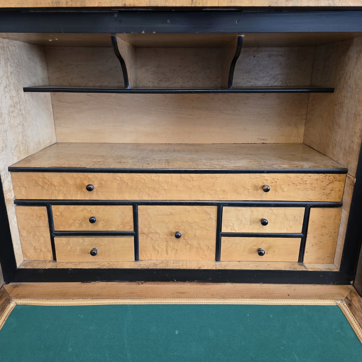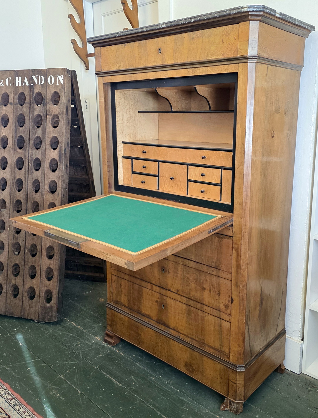 An early 19th century French Louis Philippe period 'Bureau-en-Abattant' fall-front desk, the book-matched walnut with a wonderful, soft patina. The birdseye maple interior is fitted with drawers and with a pigeon holes. Retaining the original 'Gris St Anne' marble top and the original furniture hardware including locks, key and drawer escutcheons. Please note, the interior has two secret compartments that open with loaded spring mechanisms. Area of Paris, circa 1830.