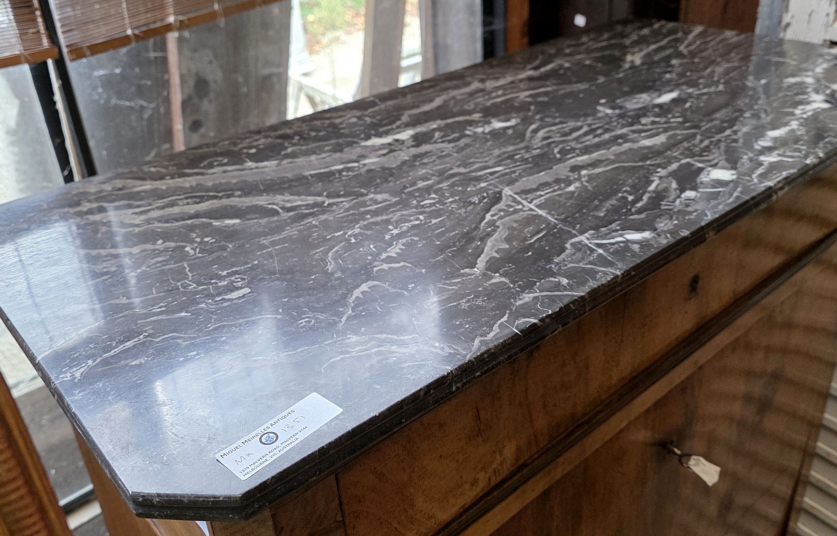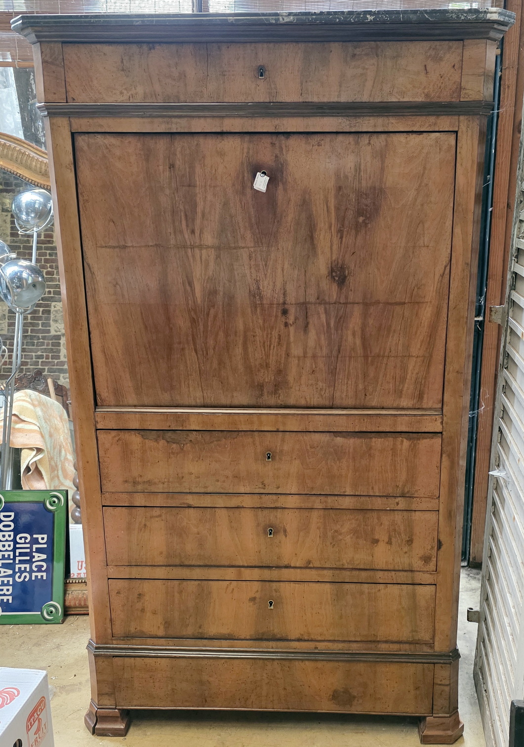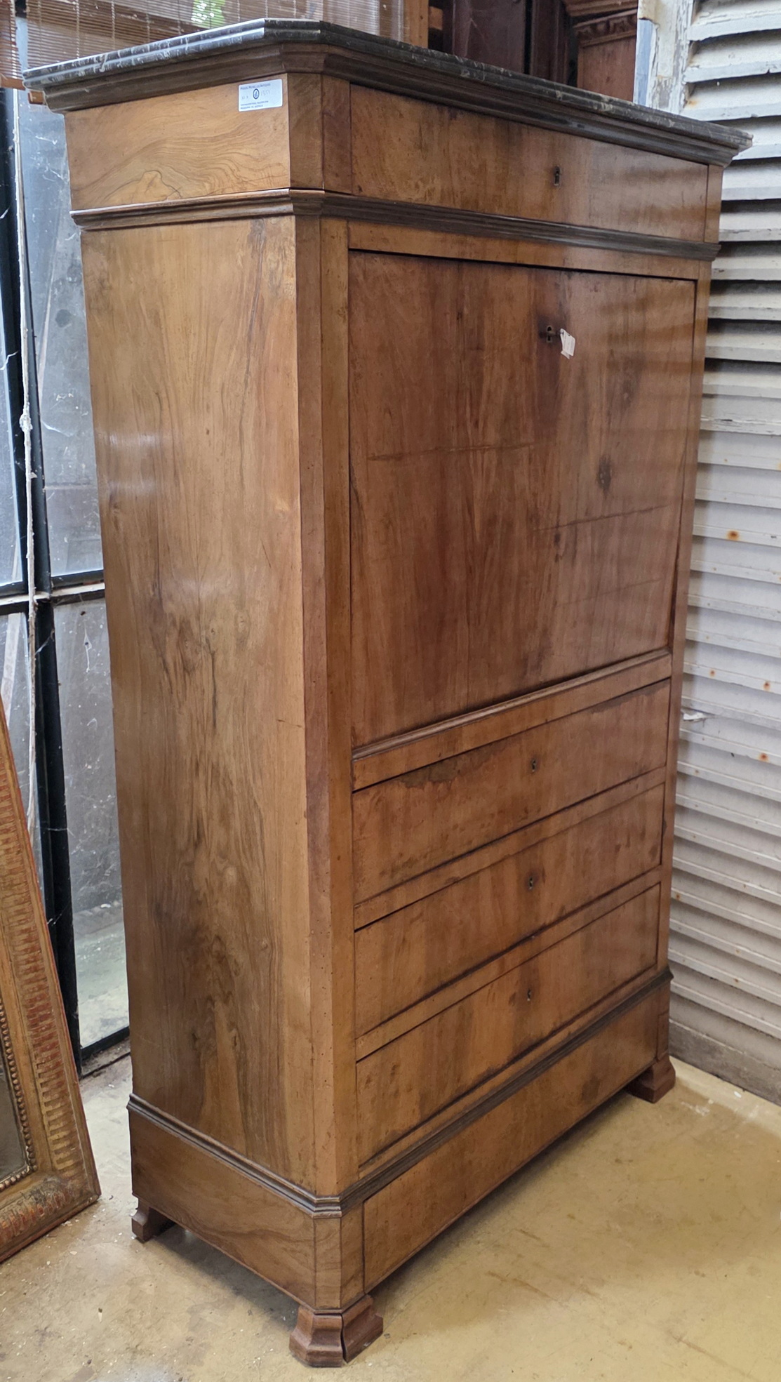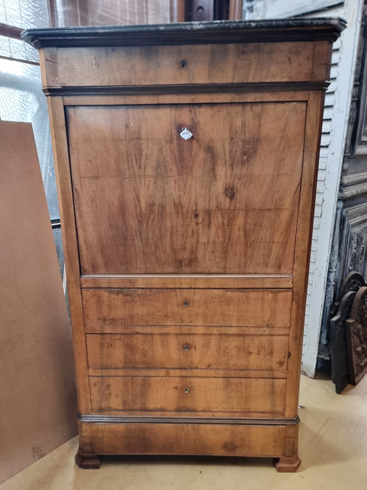 An early 19th century French Louis Philippe period 'Bureau-en-Abattant' fall-front desk, the book-matched walnut with a beautiful patina, offset by the now faded ebonised mouldings. The birdseye maple interior is fitted with drawers and with a pigeon holes. Retaining the original 'Gris St Anne' marble top and the original furniture hardware including locks, key and drawer escutcheons. Please note, the interior has two secret compartments. Area of Paris, circa 1830.