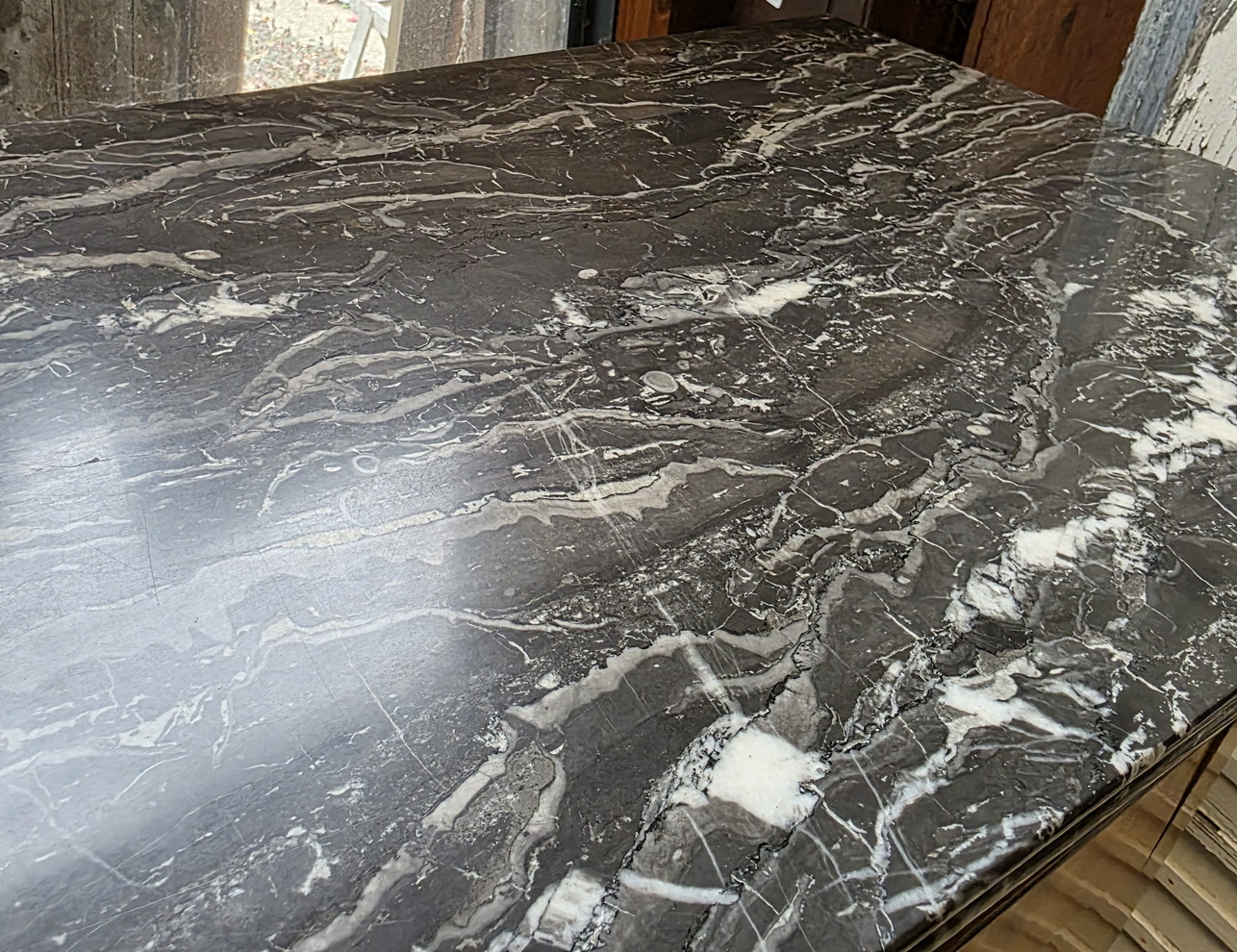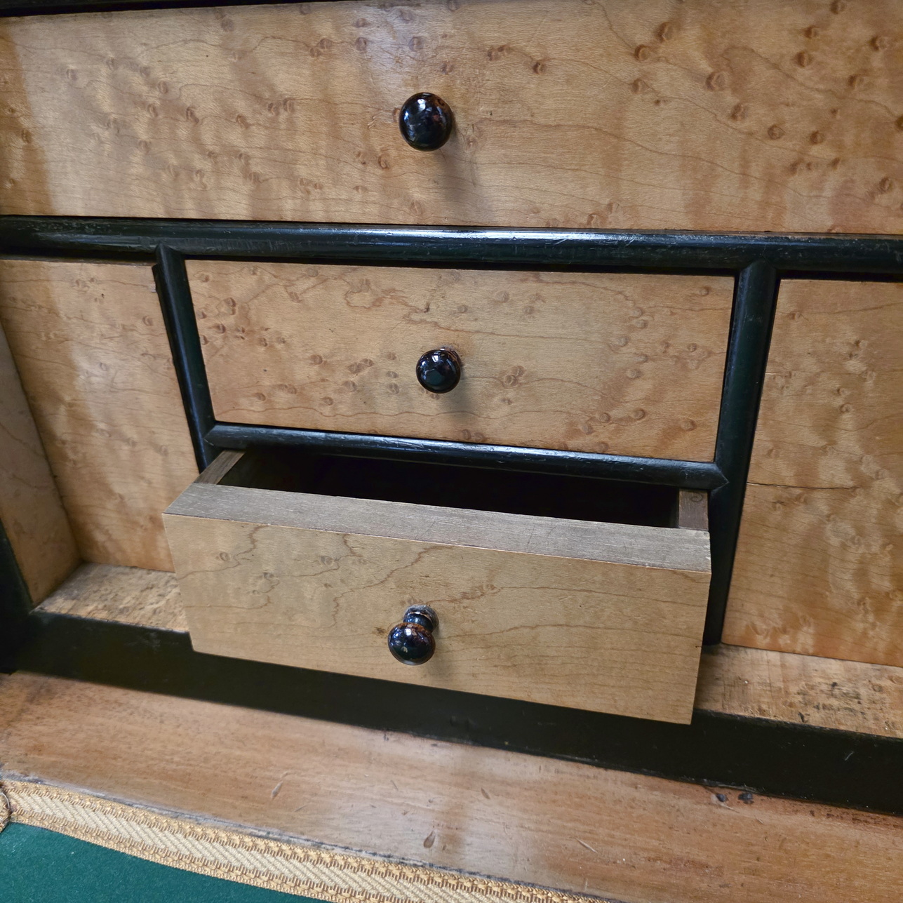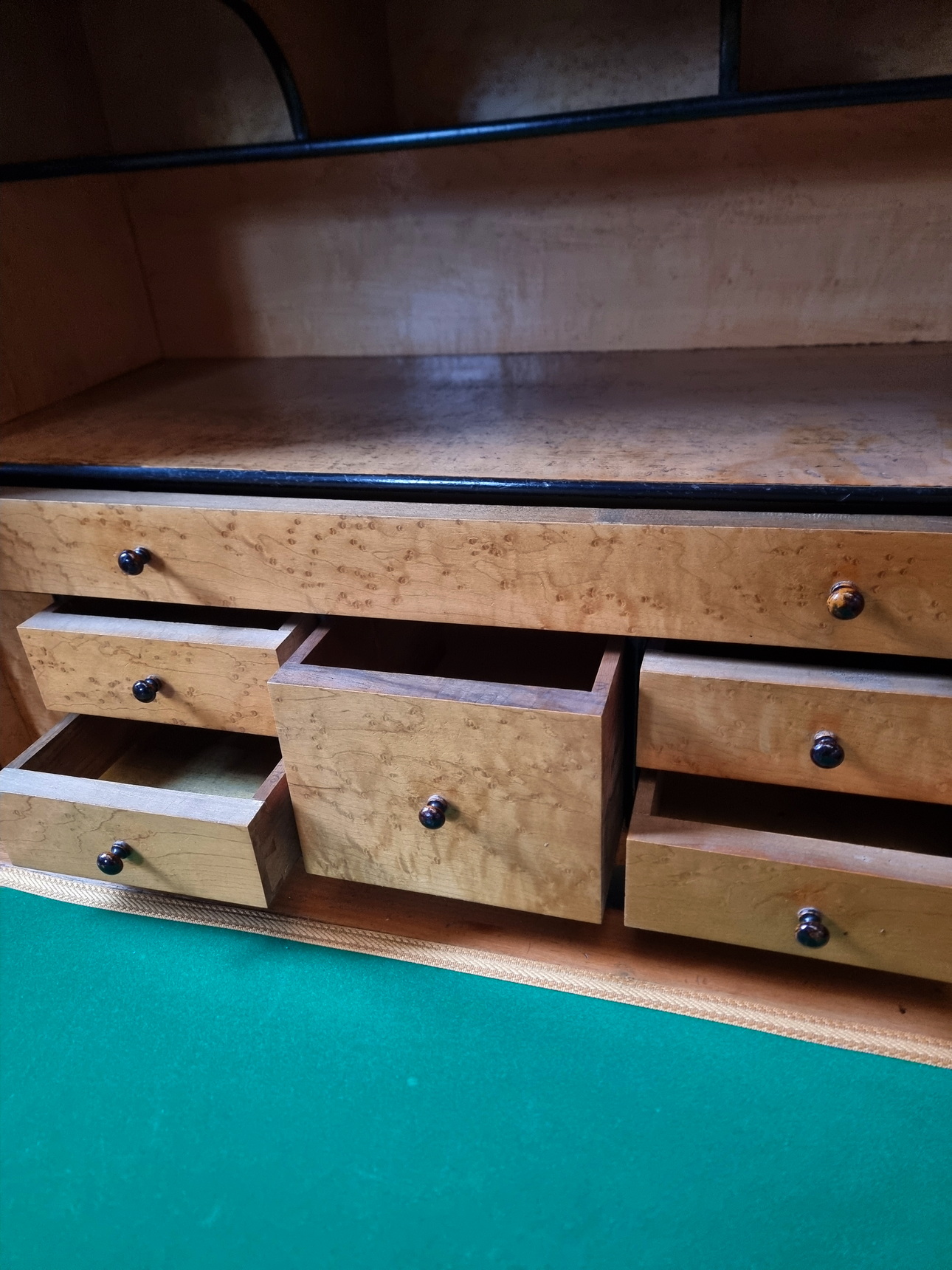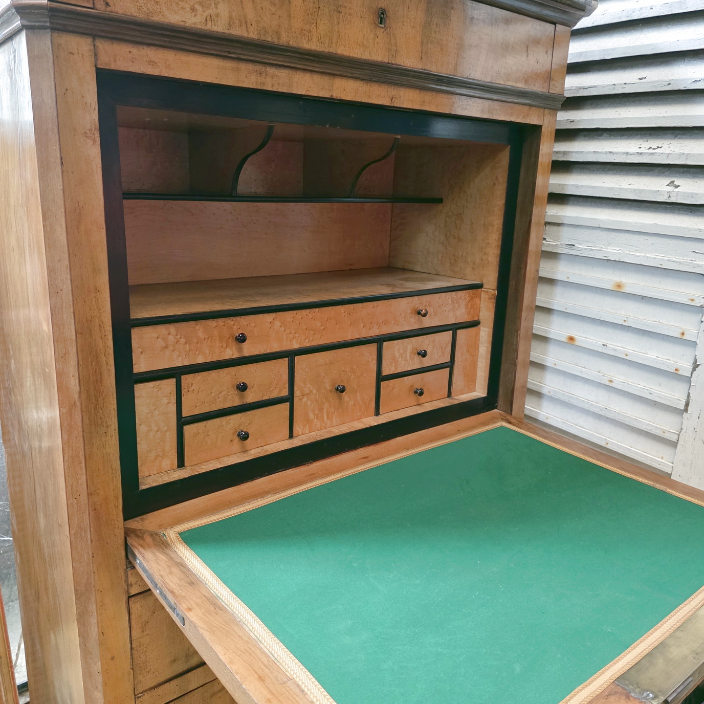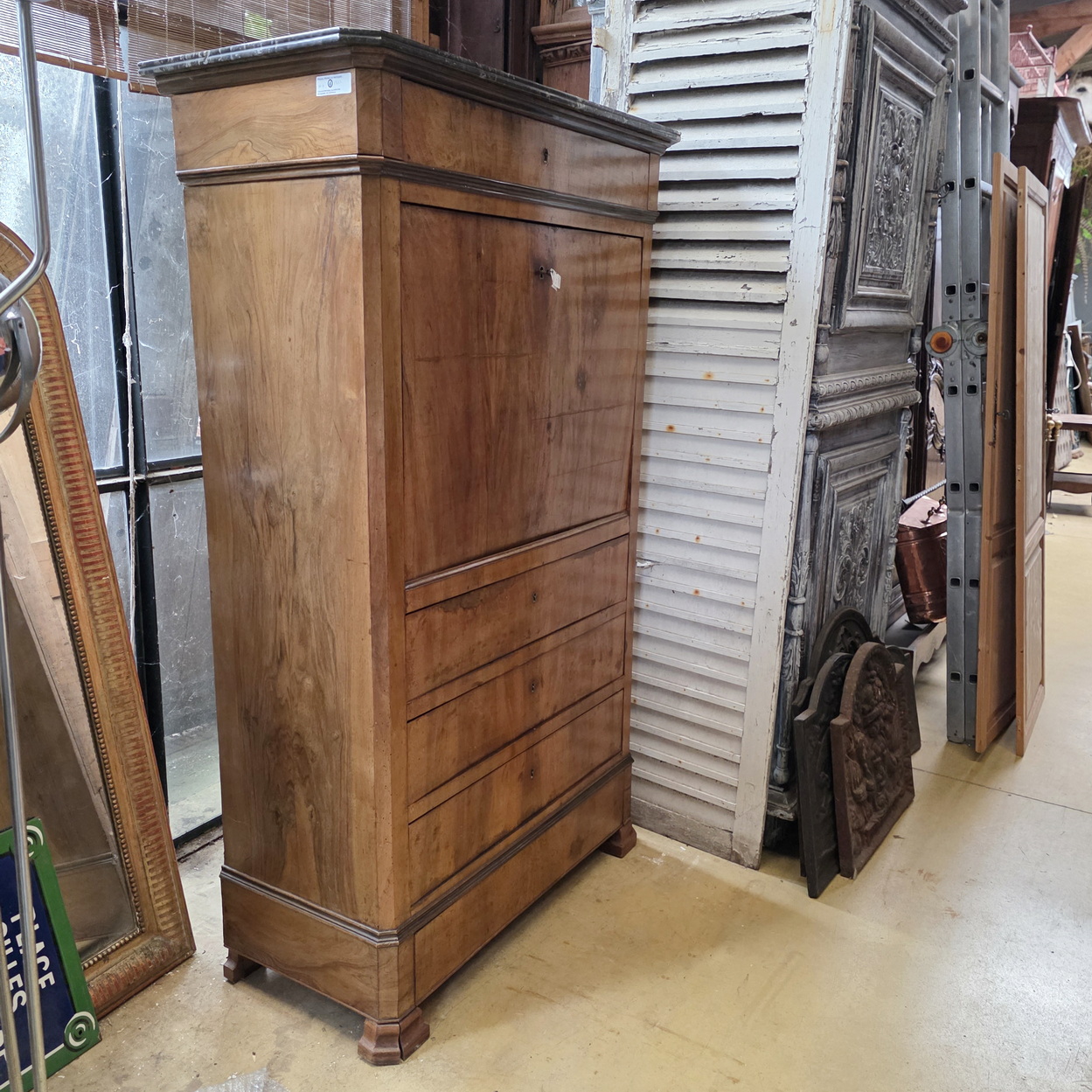 An early 19th century French Louis Philippe period 'Bureau-en-Abattant' fall-front desk, the book-matched walnut with a beautiful patina, offset by the now faded ebonised mouldings. The birdseye maple interior is fitted with drawers and with a pigeon holes. Retaining the original 'Gris St Anne' marble top and the original furniture hardware including locks, key and drawer escutcheons. Please note, the interior has two secret compartments. Area of Paris, circa 1830.