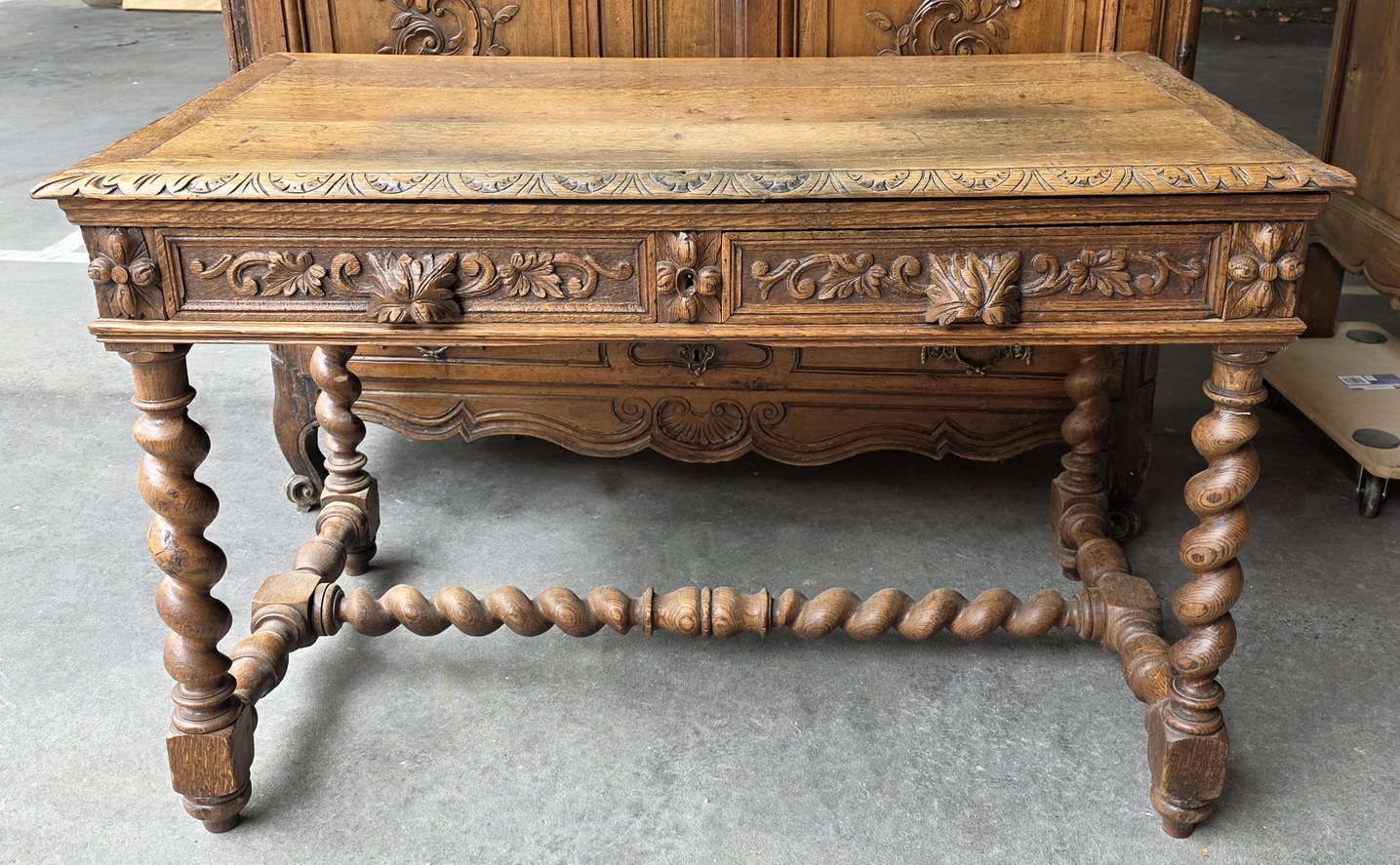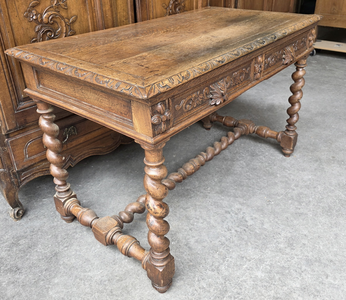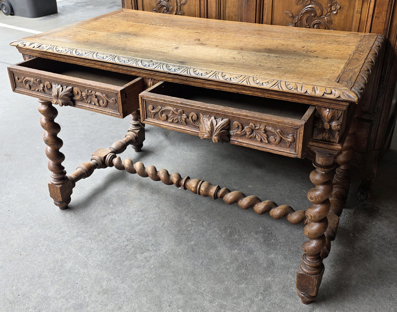 A 19th century French Louis XIV style, haut-relief carved solid oak 'bureau', the front fitted with two shallow drawers. The timber top standing on carved, barley twist -turned legs joined by a turned 'H' stretcher. Each of the drawers carved with foliate scrolls and fitted with haut relief carved 'leaf' handles. Area of Paris, circa 1880.