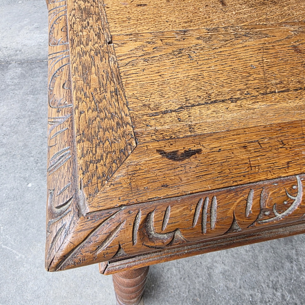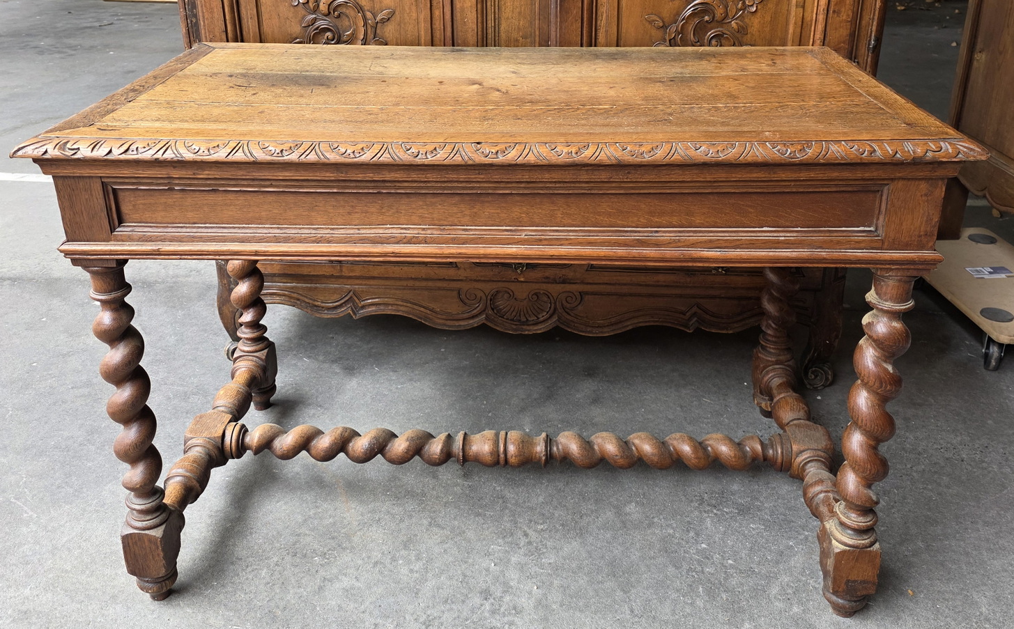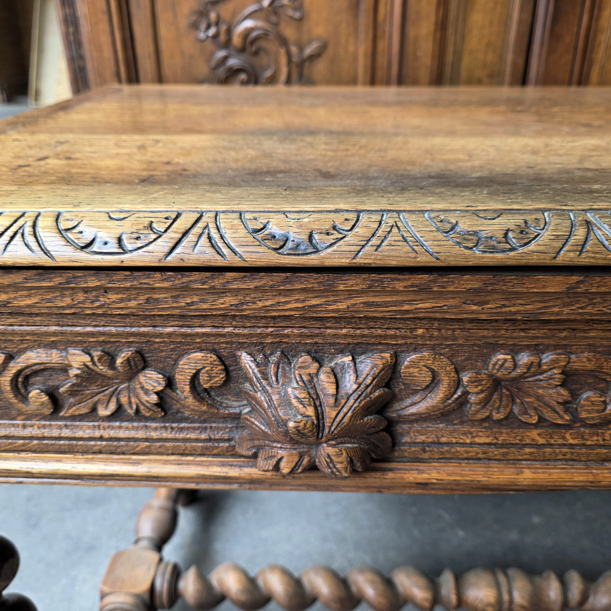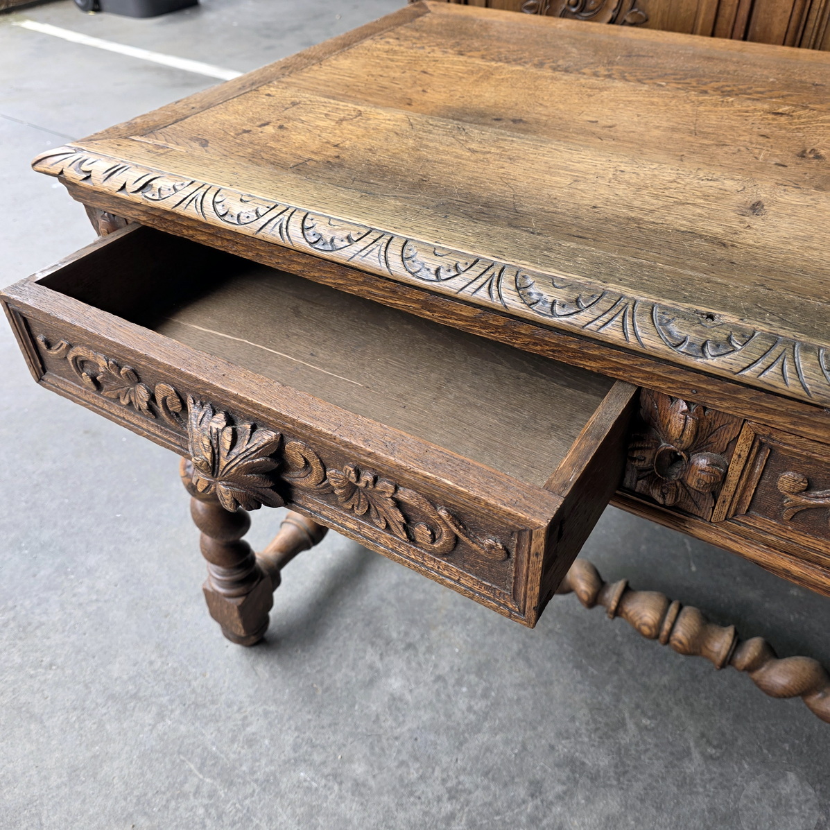 A 19th century French Louis XIV style, haut-relief carved solid oak 'bureau', the front fitted with two shallow drawers. The timber top standing on carved, barley twist -turned legs joined by a turned 'H' stretcher. Each of the drawers carved with foliate scrolls and fitted with haut relief carved 'leaf' handles. Area of Paris, circa 1880.