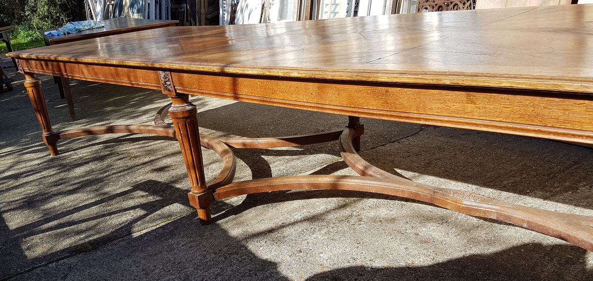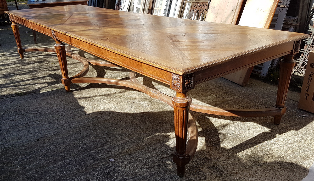 An exceptionally large and wide, late 19th century French Louis XVI style dining table of elegant design, the well-burnished solid oak parquetry top above six turned and fluted legs joined by a shaped, double ‘X’ stretcher. Comfortably sitting fourteen, and sixteen if two people sit at each end. Area of Normandy, circa 1880.