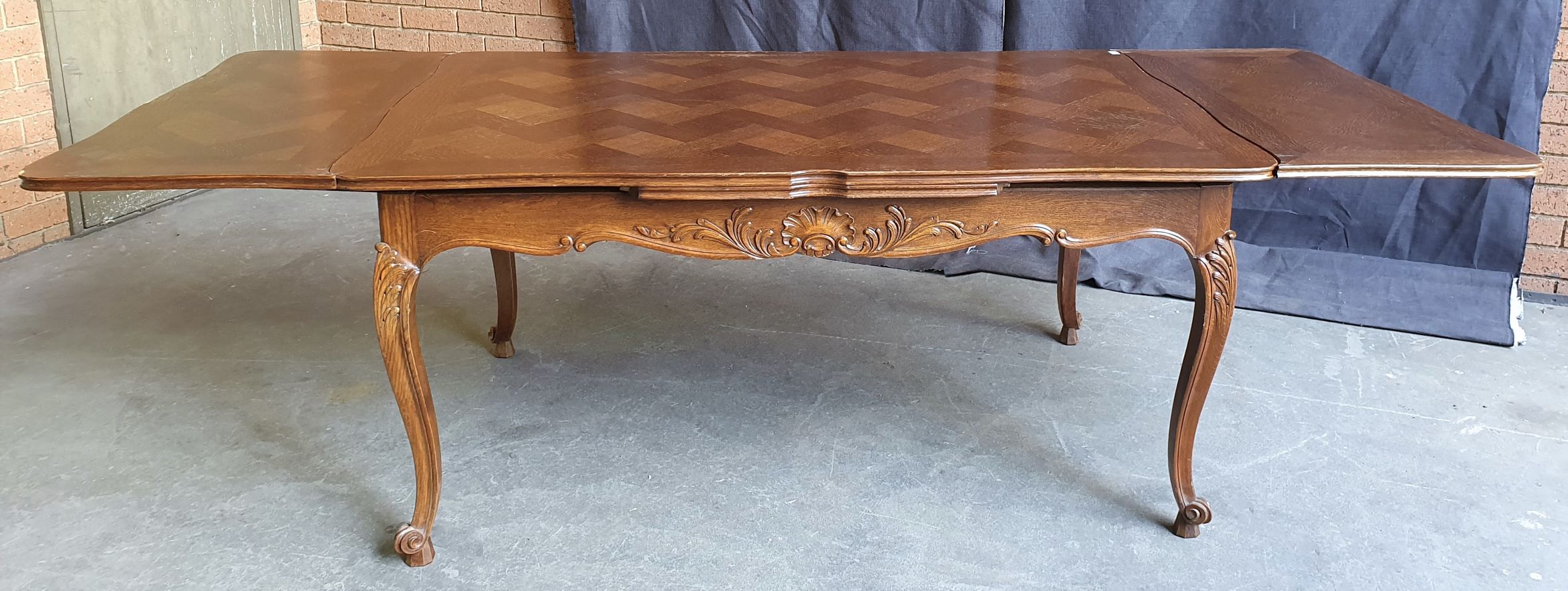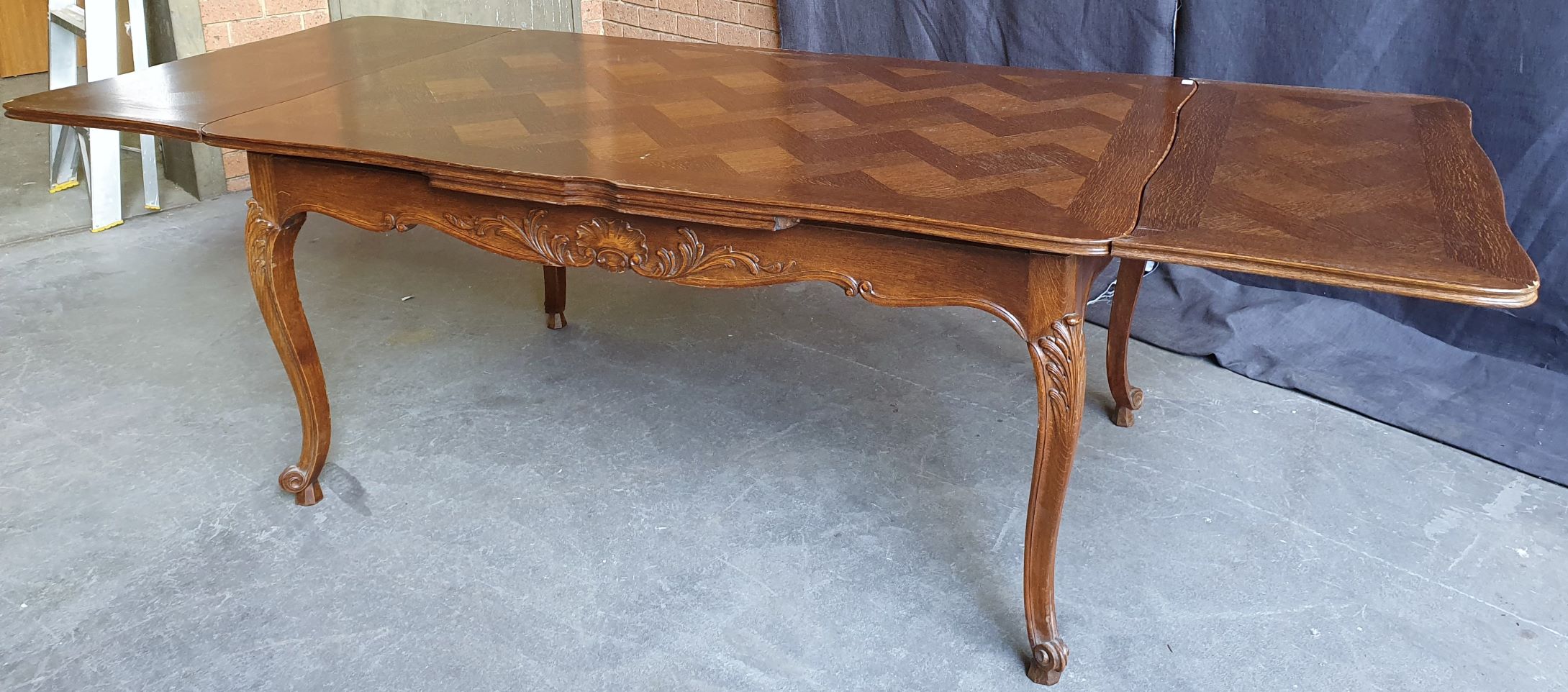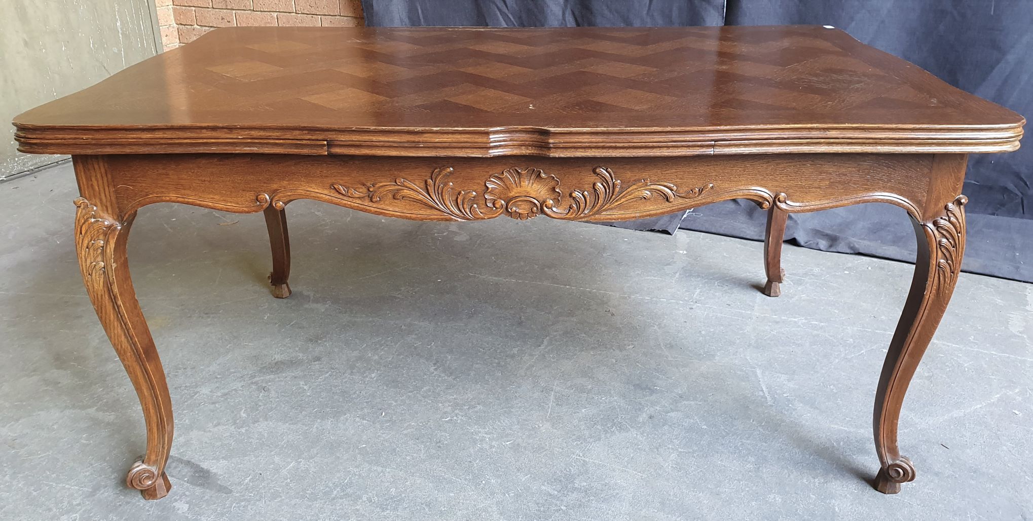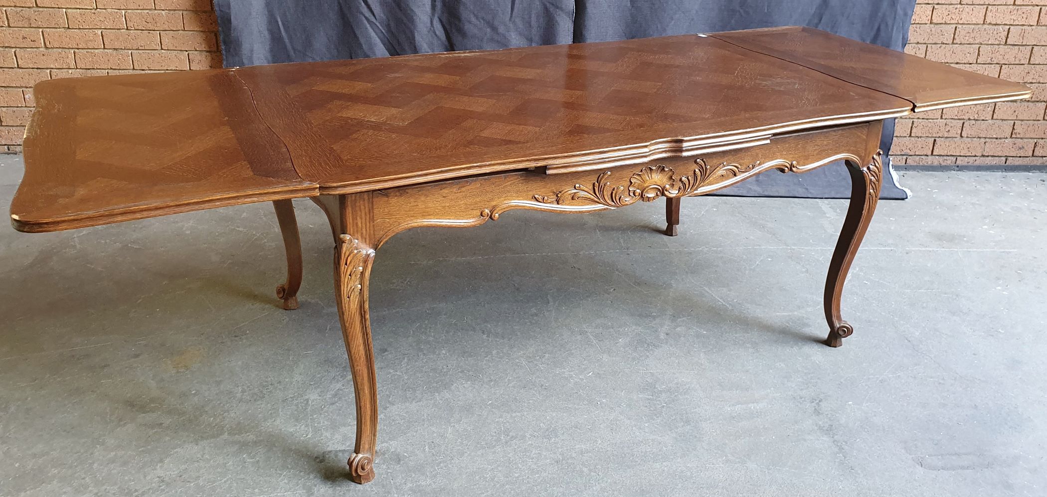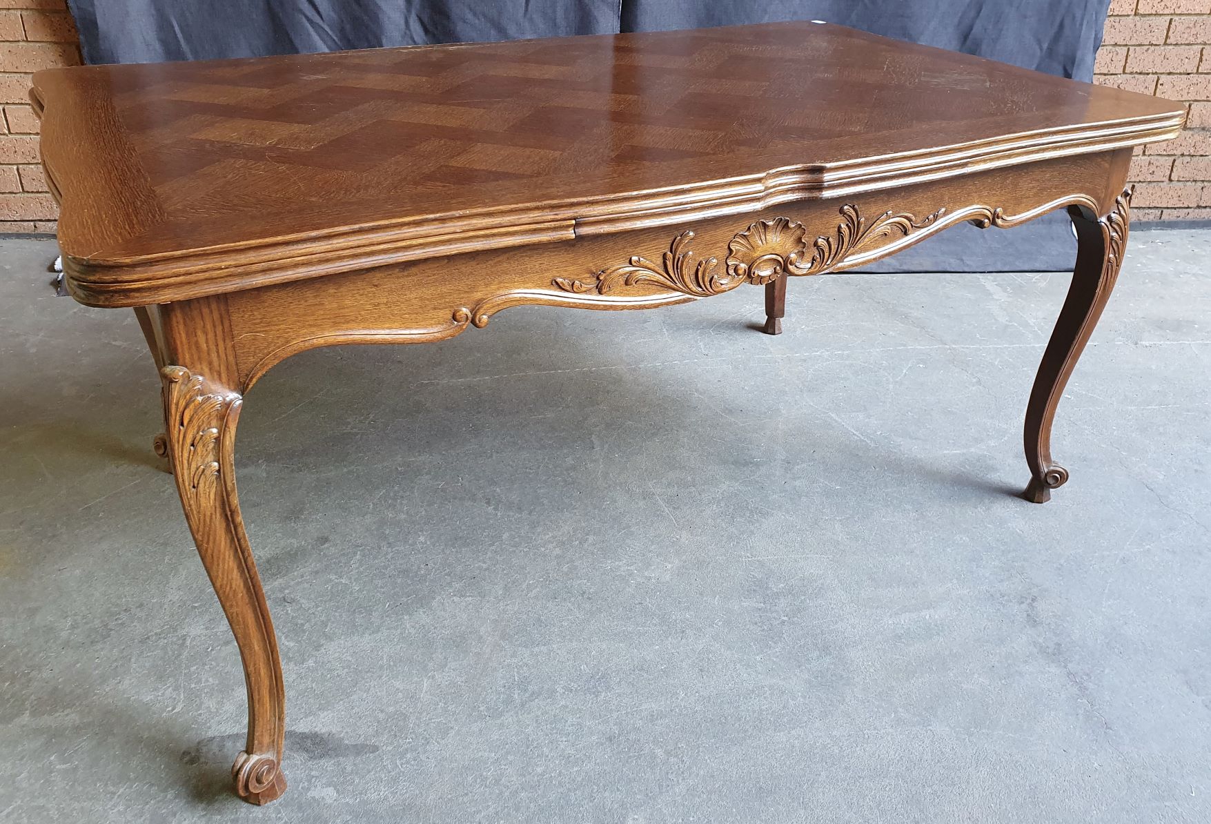 An early 20th century French Louis XV style carved solid oak and oak parquetry extending dining table, the serpentine top above Cabriole legs and shaped rails. Each of the shaped rails is decorated with haut-relief mouldings. This table will comfortably seat six people when closed, and on opening both extensions will comfortably seat ten. The table has plenty of leg-room and it comes completely apart. The extension leaves are stored under the tabletop, when not in use. Area of Paris, circa 1930.