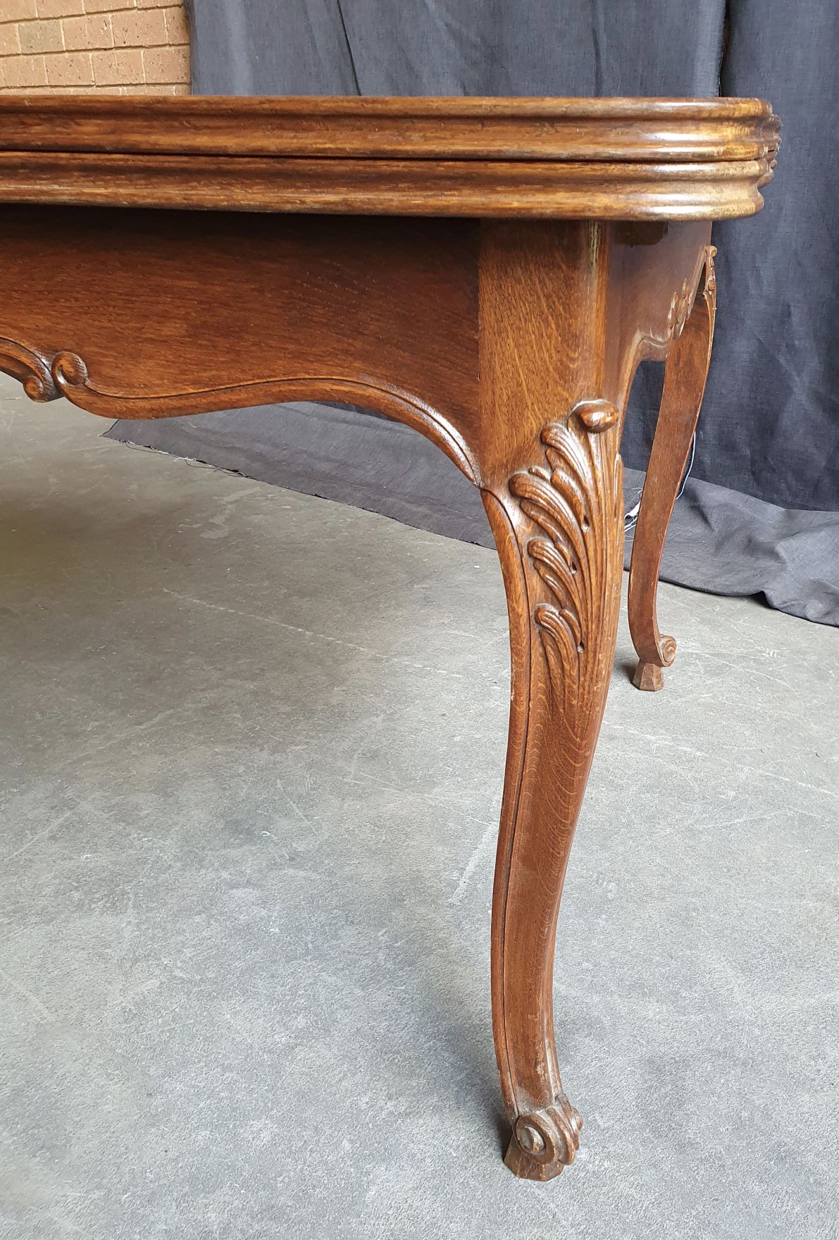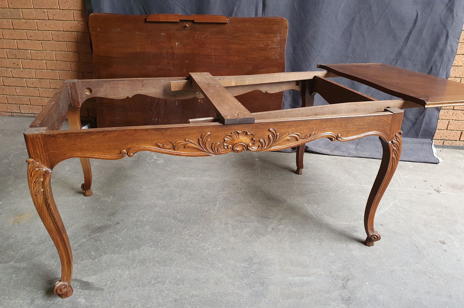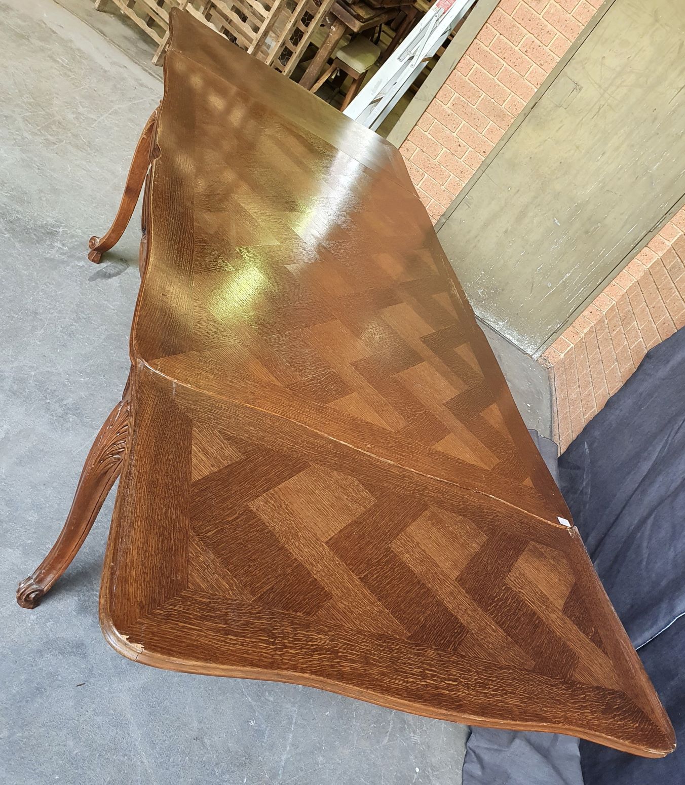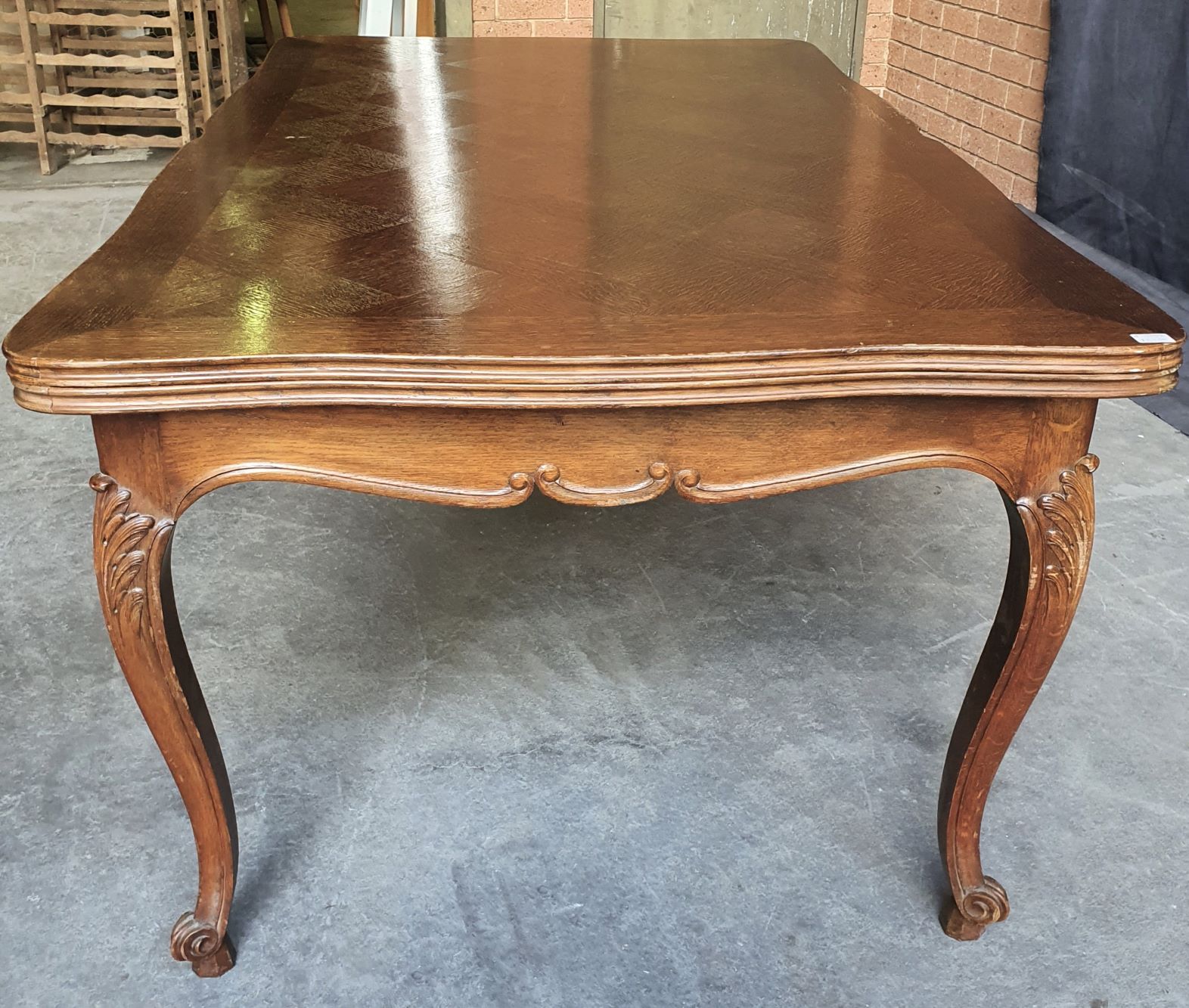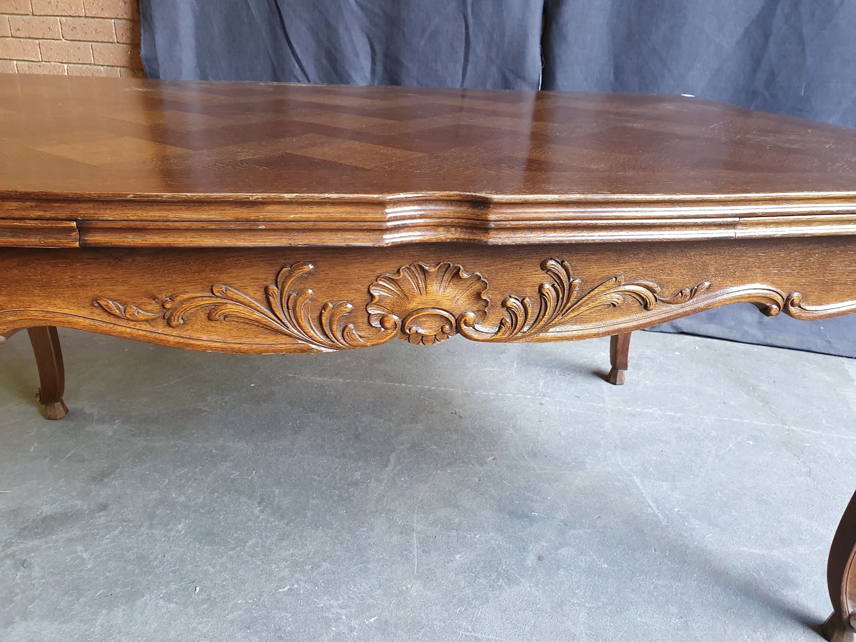 An early 20th century French Louis XV style carved solid oak and oak parquetry extending dining table, the serpentine top above Cabriole legs and shaped rails. Each of the shaped rails is decorated with haut-relief mouldings. This table will comfortably seat six people when closed, and on opening both extensions will comfortably seat ten. The table has plenty of leg-room and it comes completely apart. The extension leaves are stored under the tabletop, when not in use. Area of Paris, circa 1930.