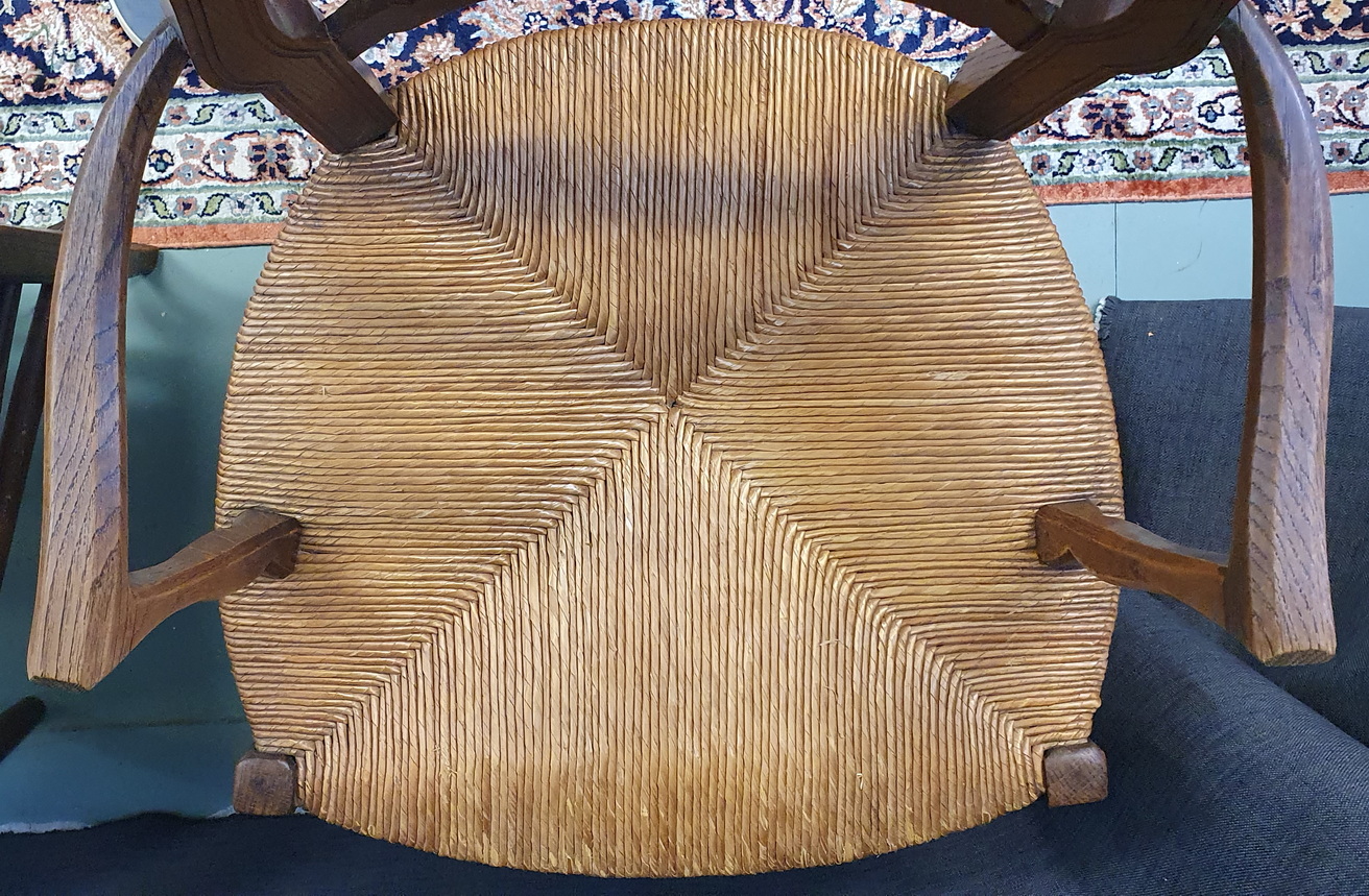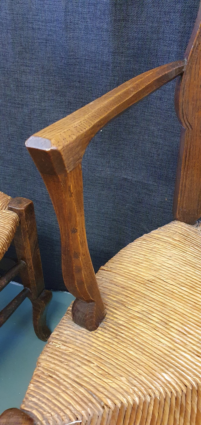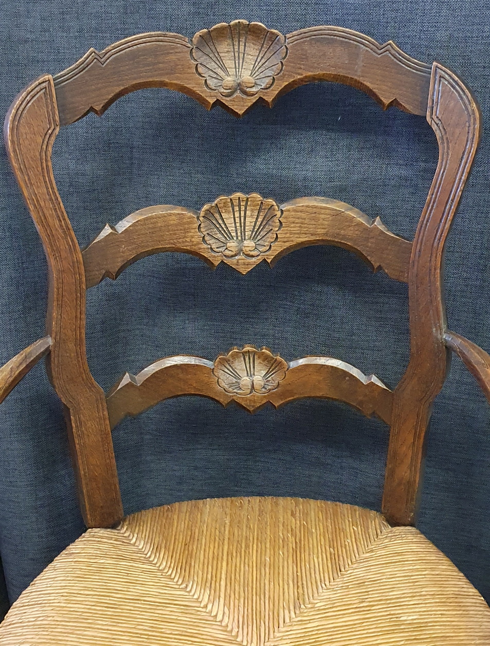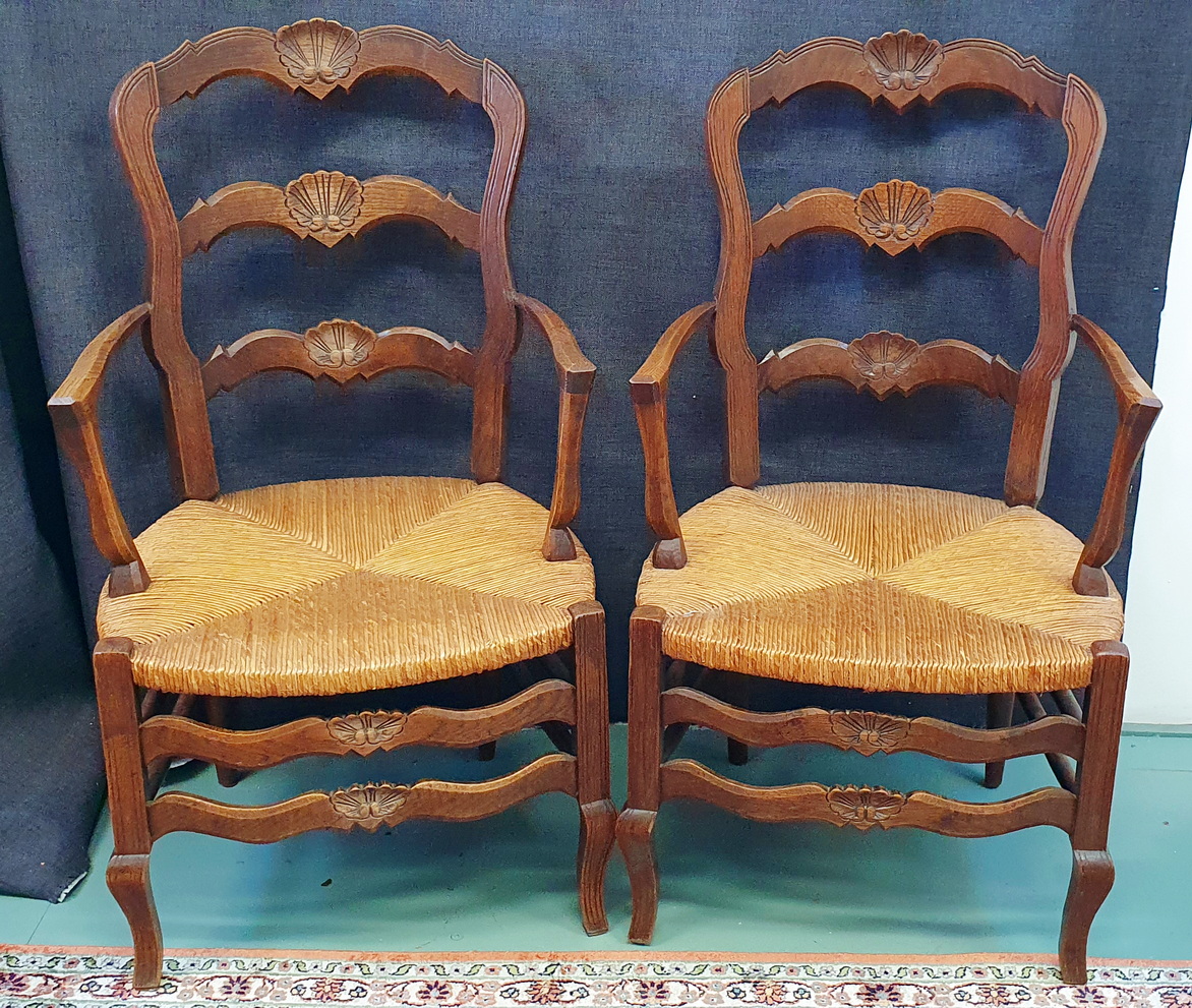 A pair of comfortable and light-weight, early 20th century French provincial 'fauteuil' solid oak ladderback armchairs decorated with bas-relief carved seashell motifs, the broad seats fitted with woven rush. Typical provincial Louis XV style armchairs from the area of Southern France, circa 1930.