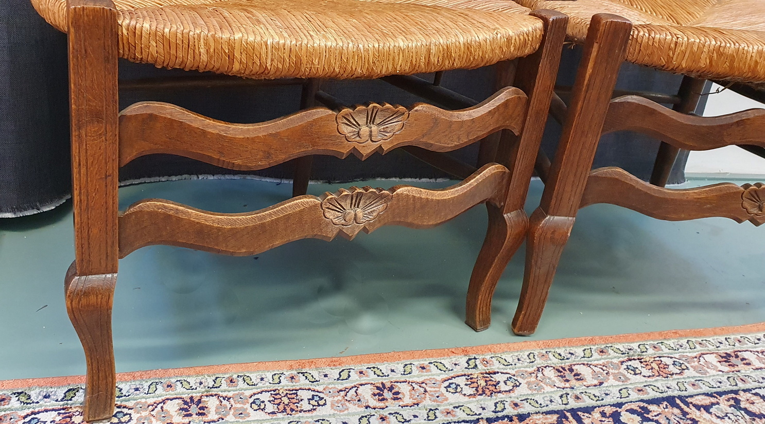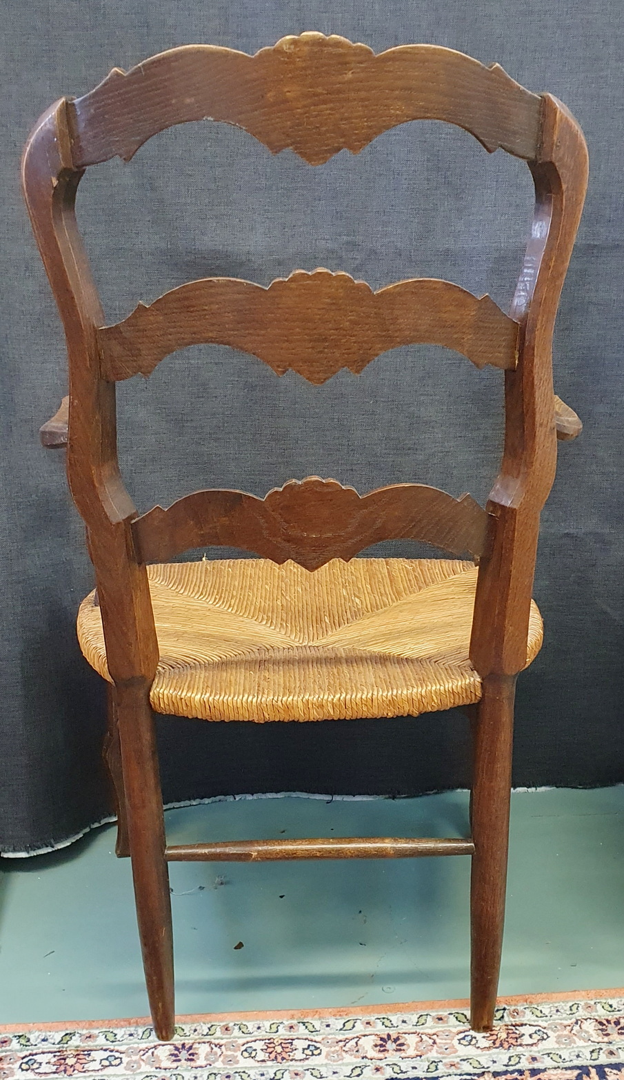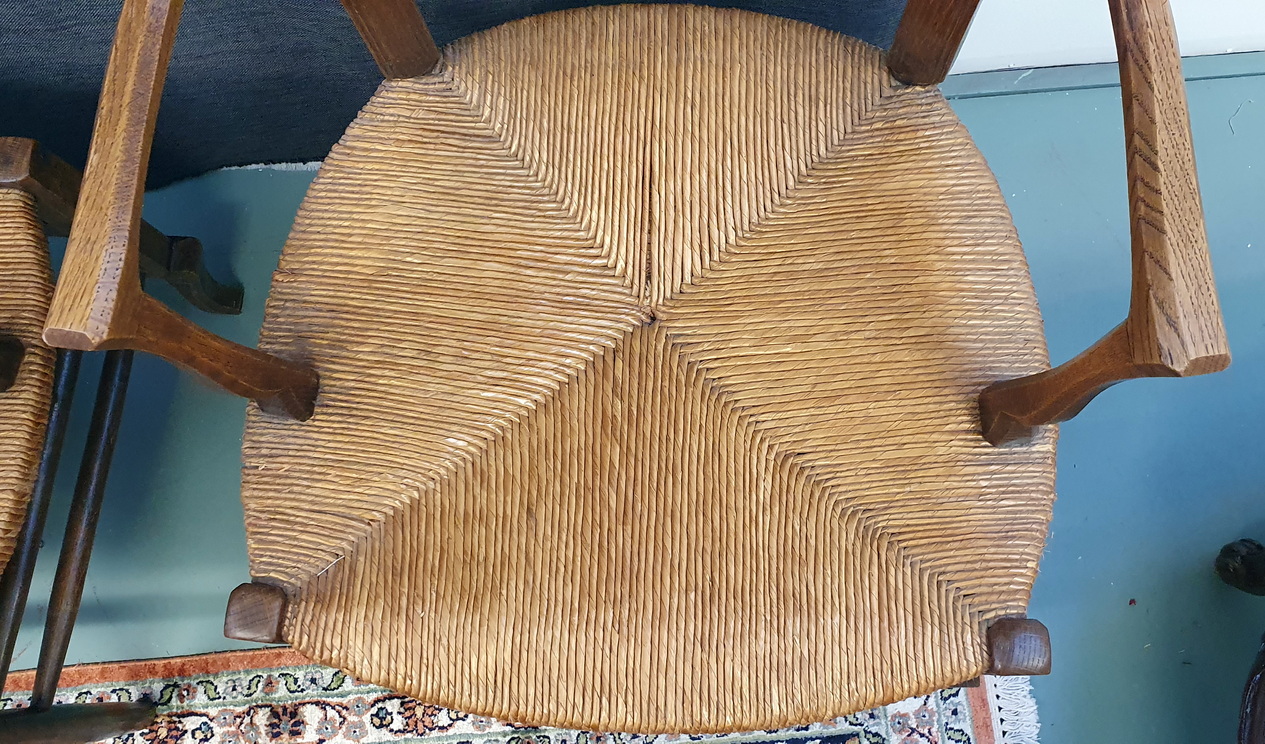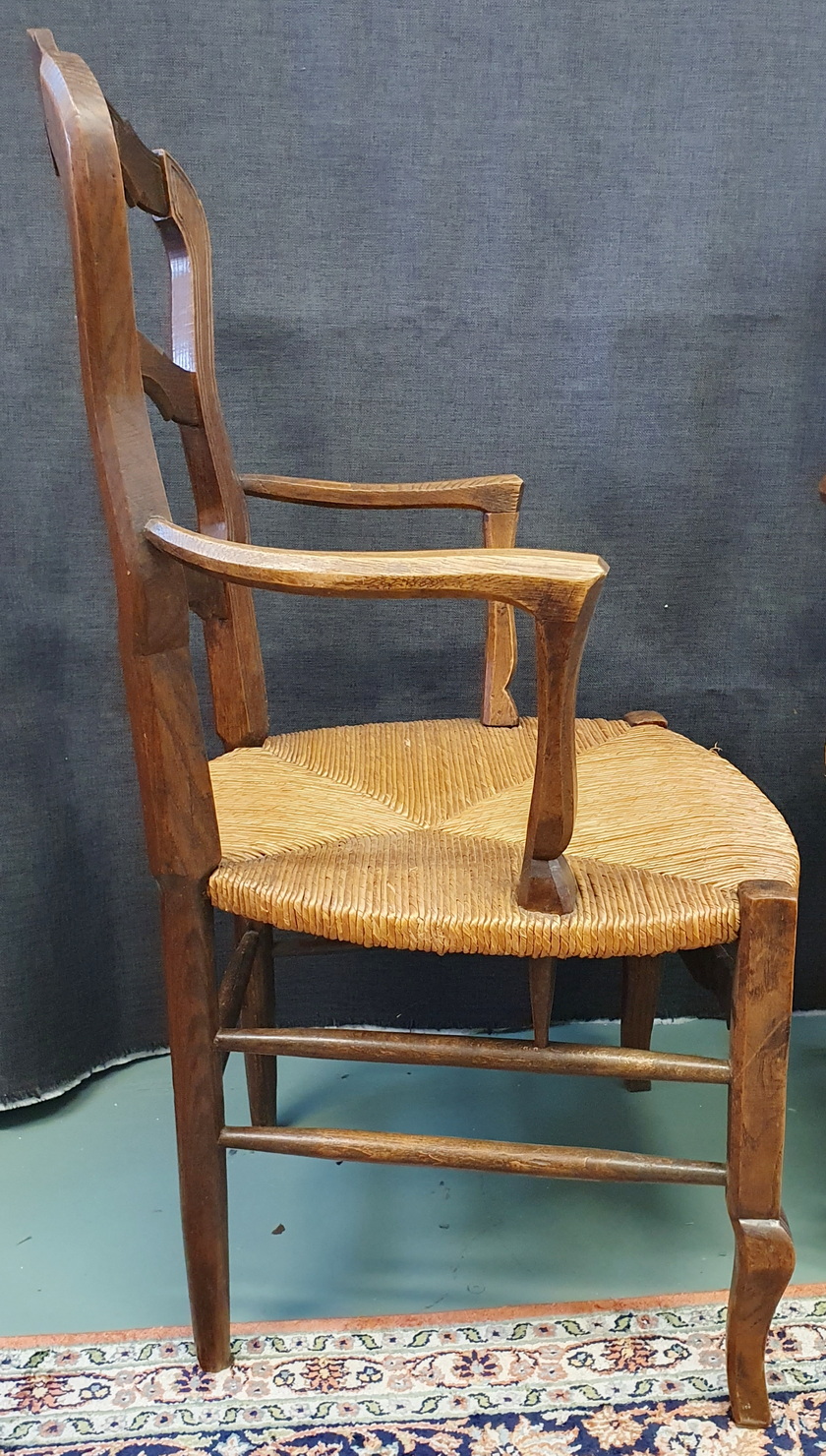 A pair of comfortable and light-weight, early 20th century French provincial 'fauteuil' solid oak ladderback armchairs decorated with bas-relief carved seashell motifs, the broad seats fitted with woven rush. Typical provincial Louis XV style armchairs from the area of Southern France, circa 1930.