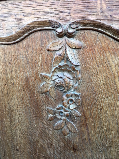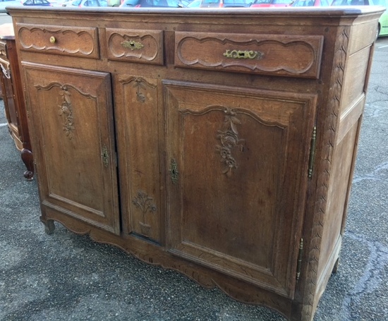 A mid 19th century French Provincial Louis XV style, finely haut relief carved solid oak Normandy Buffet of excellent proportions, the front decorated with delicate foliate and floral motifs. Three moulded drawers open above a pair of cupboard doors. Area of Caen, circa 1850. This item is currently for sale in a shop near Paris, and will not be brought to Melbourne unless someone wants it, and is willing to put down a deposit on its purchase.