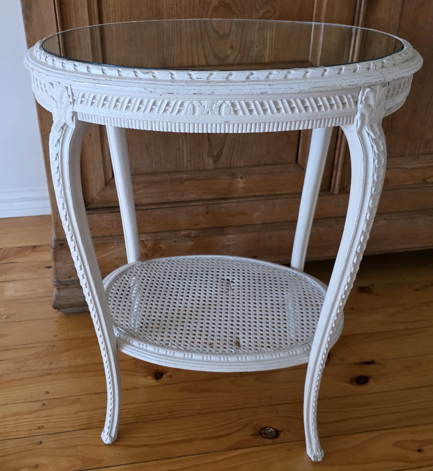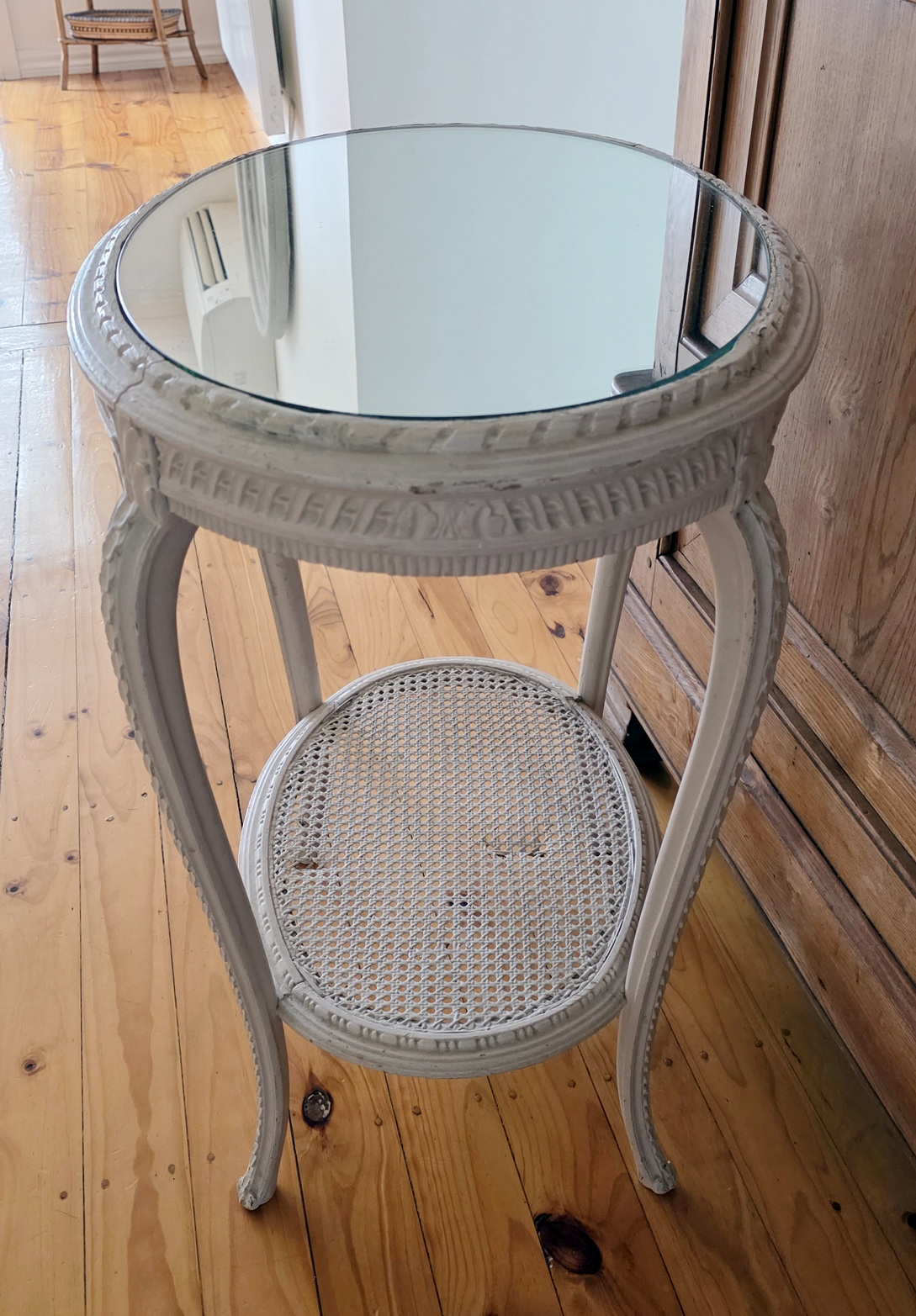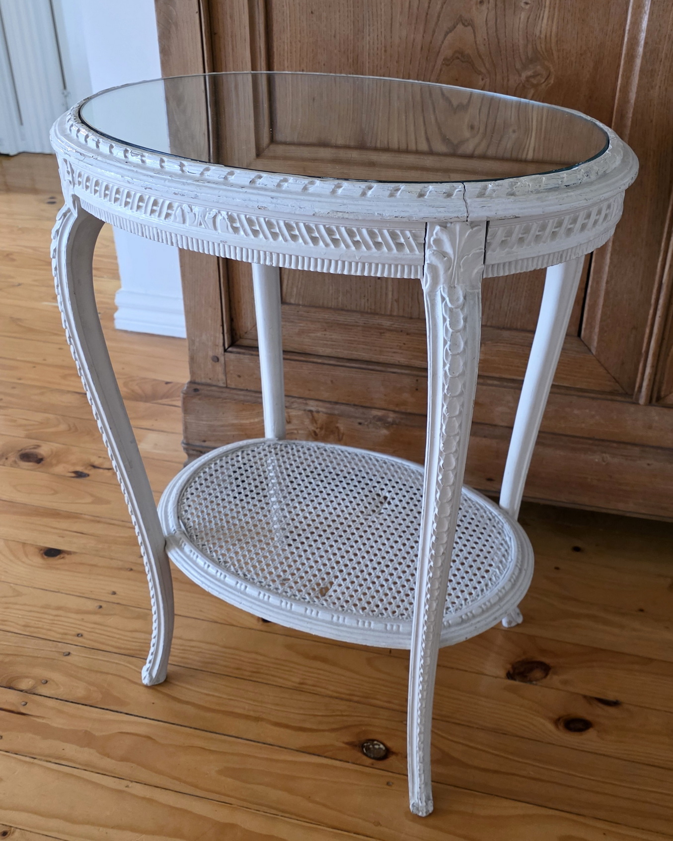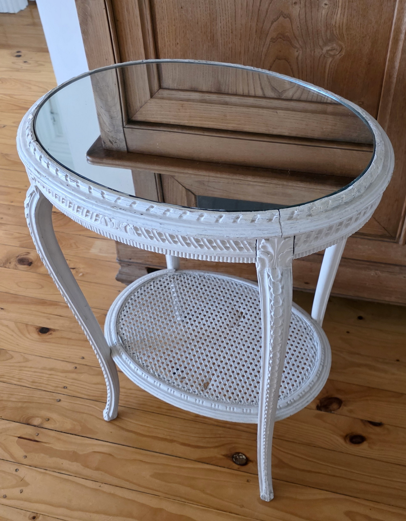 A 19th century French Louis XVI style, finely carved and painted 'Gueridon' table, the oval top fitted with a later mirror, an oval shelf hanging between the elegant legs fitted with finely woven rattan. Area of Paris, circa 1880.